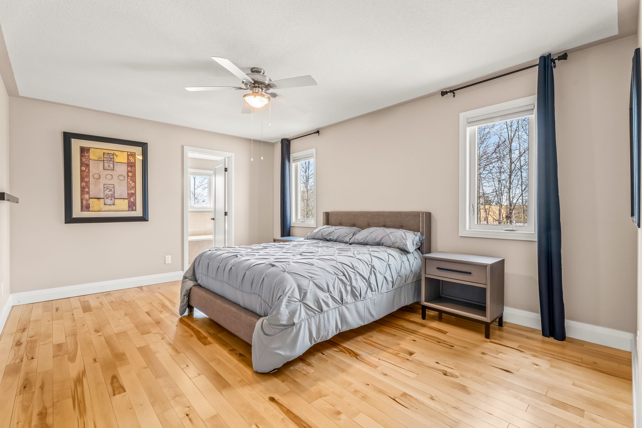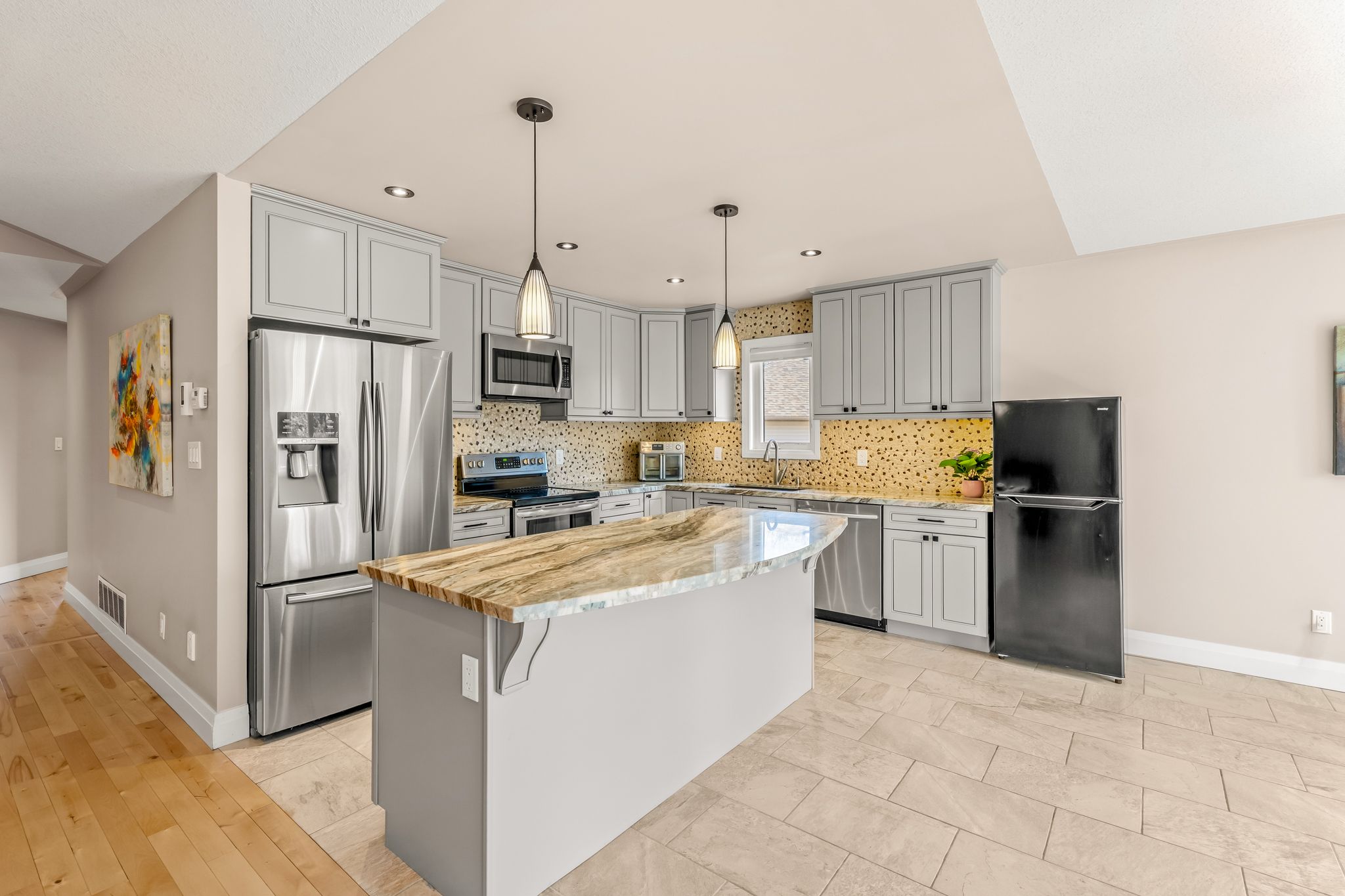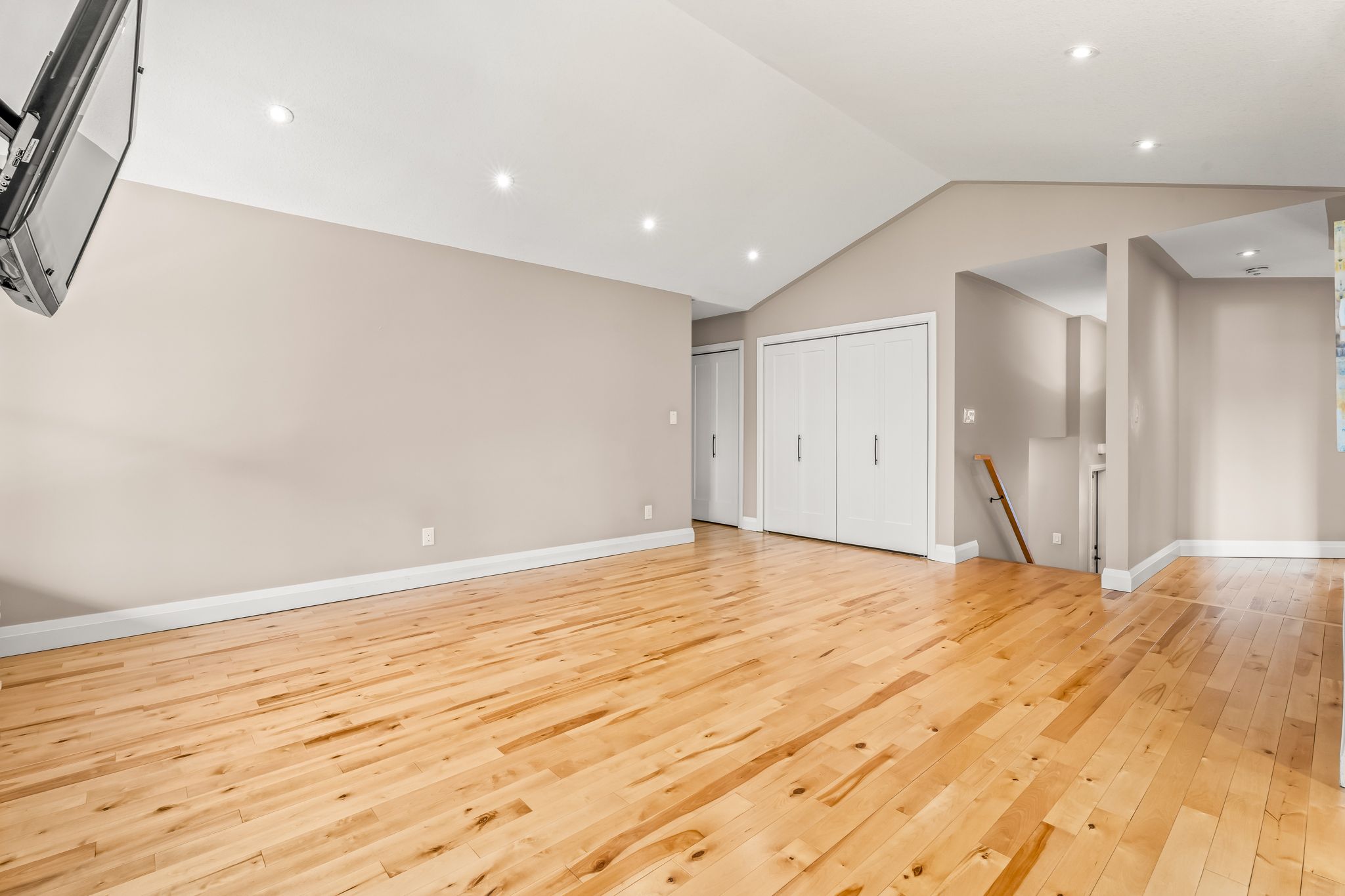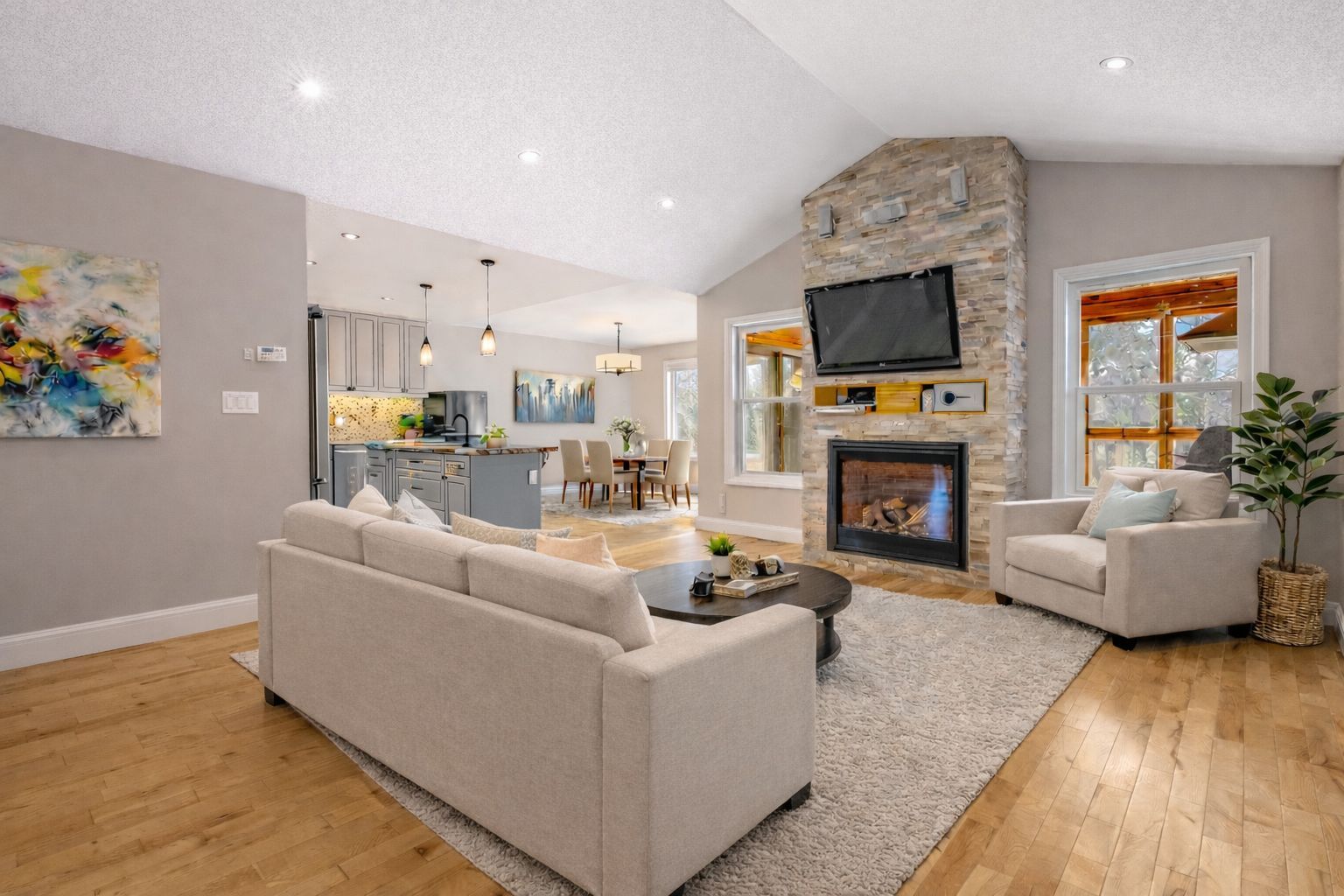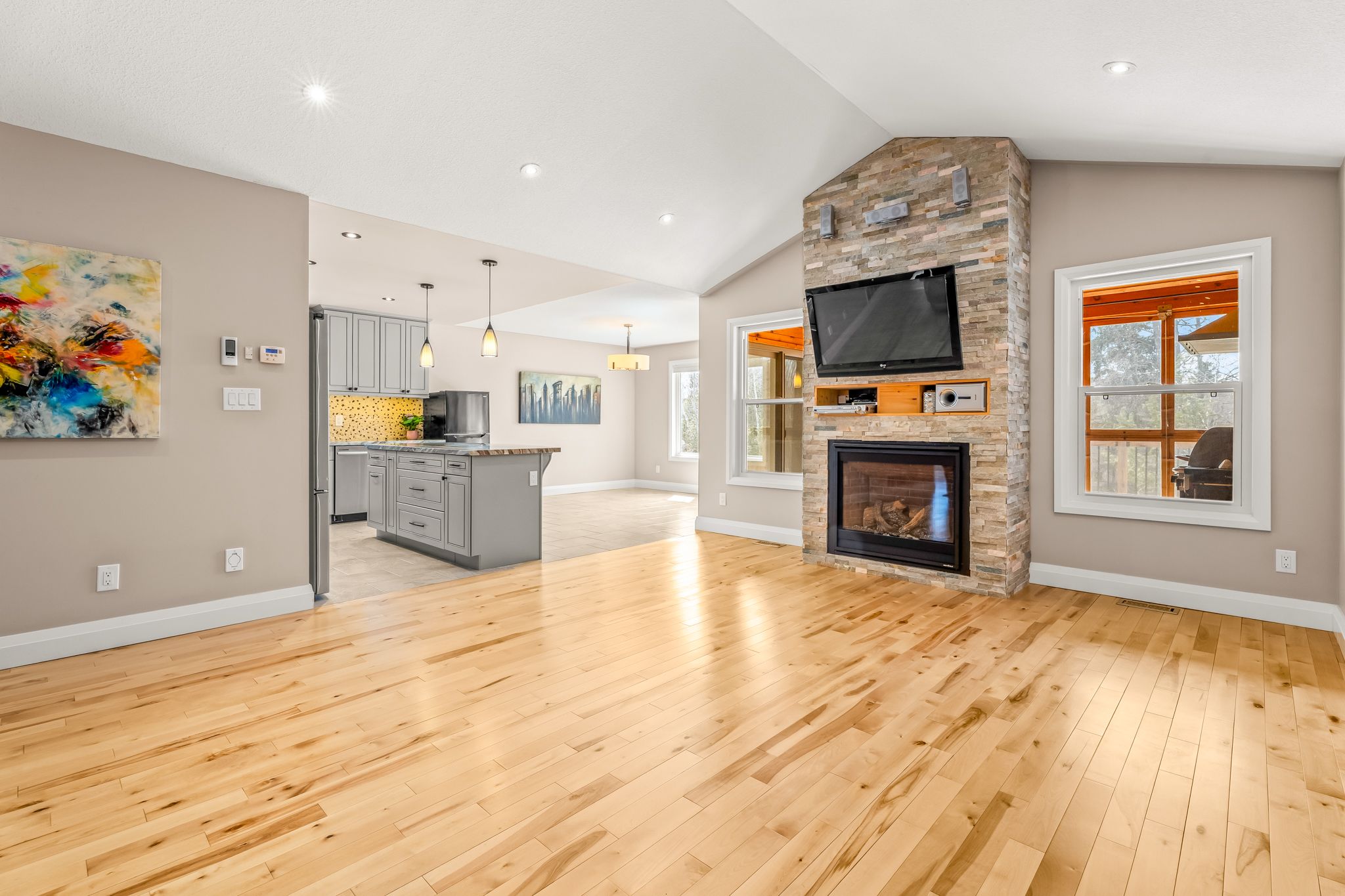 • Open-concept main level with vaulted ceilings and hardwood flooring.