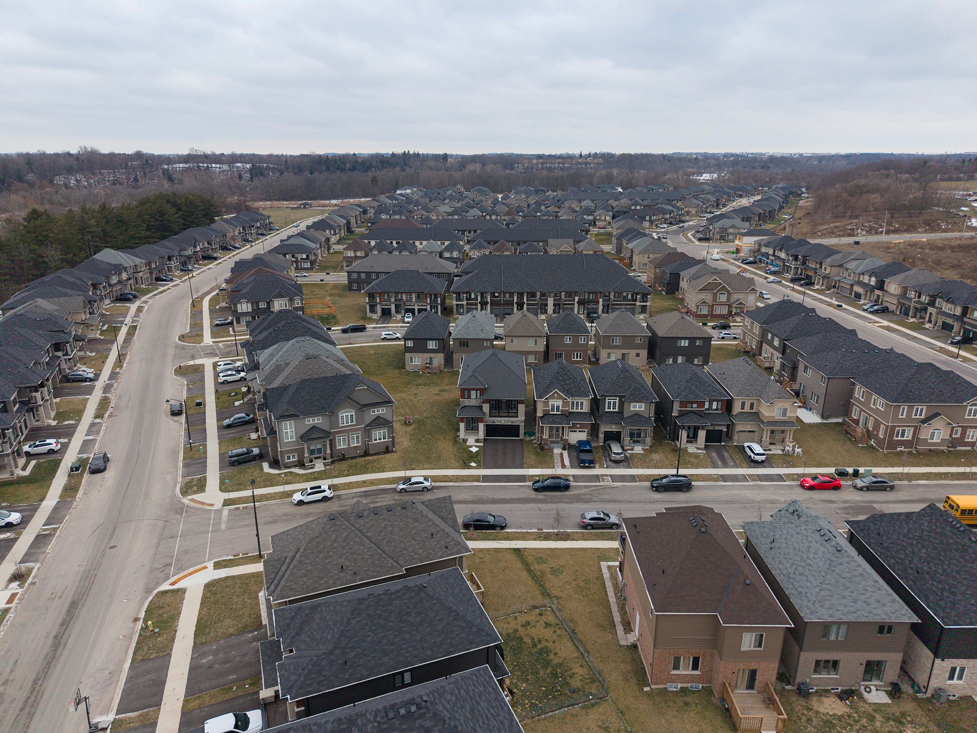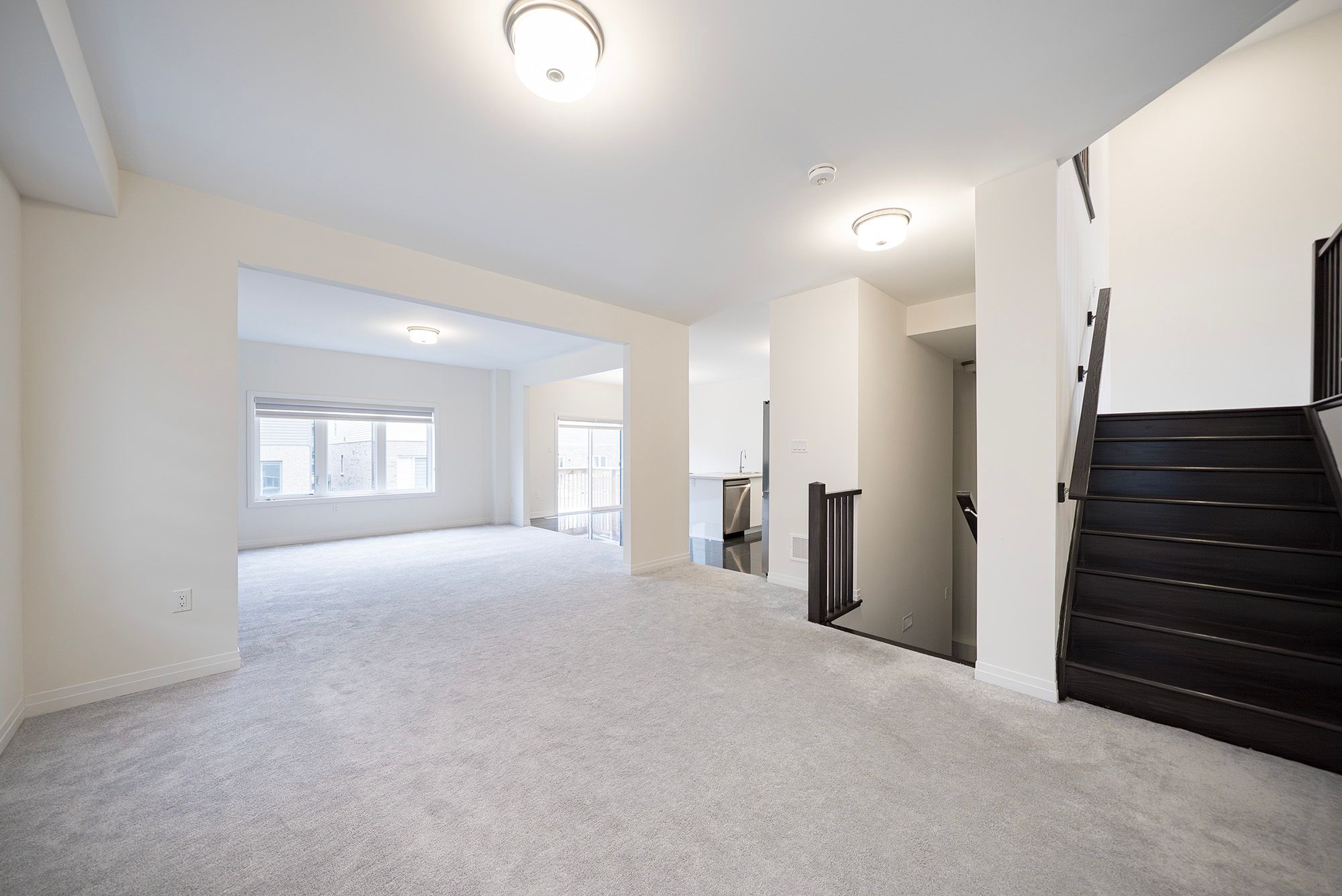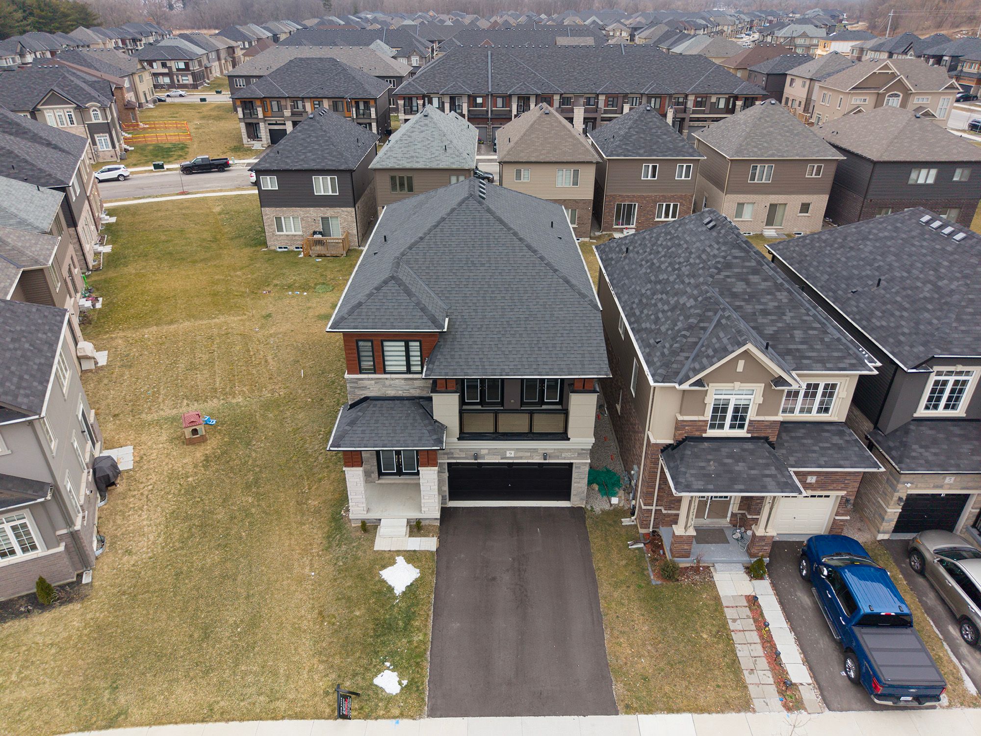 Welcome home to 9 tarrison street in brantford, a stunning two-storey home located in brantford's nature's grand community by liv. The well-maintained exterior features an attached two-car garage and double-door entry. This spotless 2,519 sq ft home offers 3 bedrooms and 2. 5 bathrooms. The tiled front foyer includes a large closet and a 2 piece powder room. The main floor features 9 foot ceilings and an open-concept layout defining the dining and living rooms, with the living room featuring a gas fireplace. This space connects seamlessly to the spacious kitchen and light-filled breakfast room, with a sliding door to the rear of the home. The bright kitchen features crisp white cabinetry and stainless steel appliances, including a built-in dishwasher. An oak staircase leads to a spacious upstairs family room with recessed lighting and two sets of double french doors opening to a balcony above the garage, overlooking the front of the home. A few steps up is the bedroom level, which offers 3 bedrooms, including a primary bedroom with a walk-in closet and a 4 piece ensuite featuring a tub and separate shower. This level also includes a 4 piece bathroom and a convenient laundry room. The unfinished basement offers high ceilings, large windows, and a 3 piece rough-in. The backyard features a deck off the rear of the home, providing easy indoor/outdoor living. Located in a growing, family-friendly neighbourhood minutes to the grand river and highway 403.