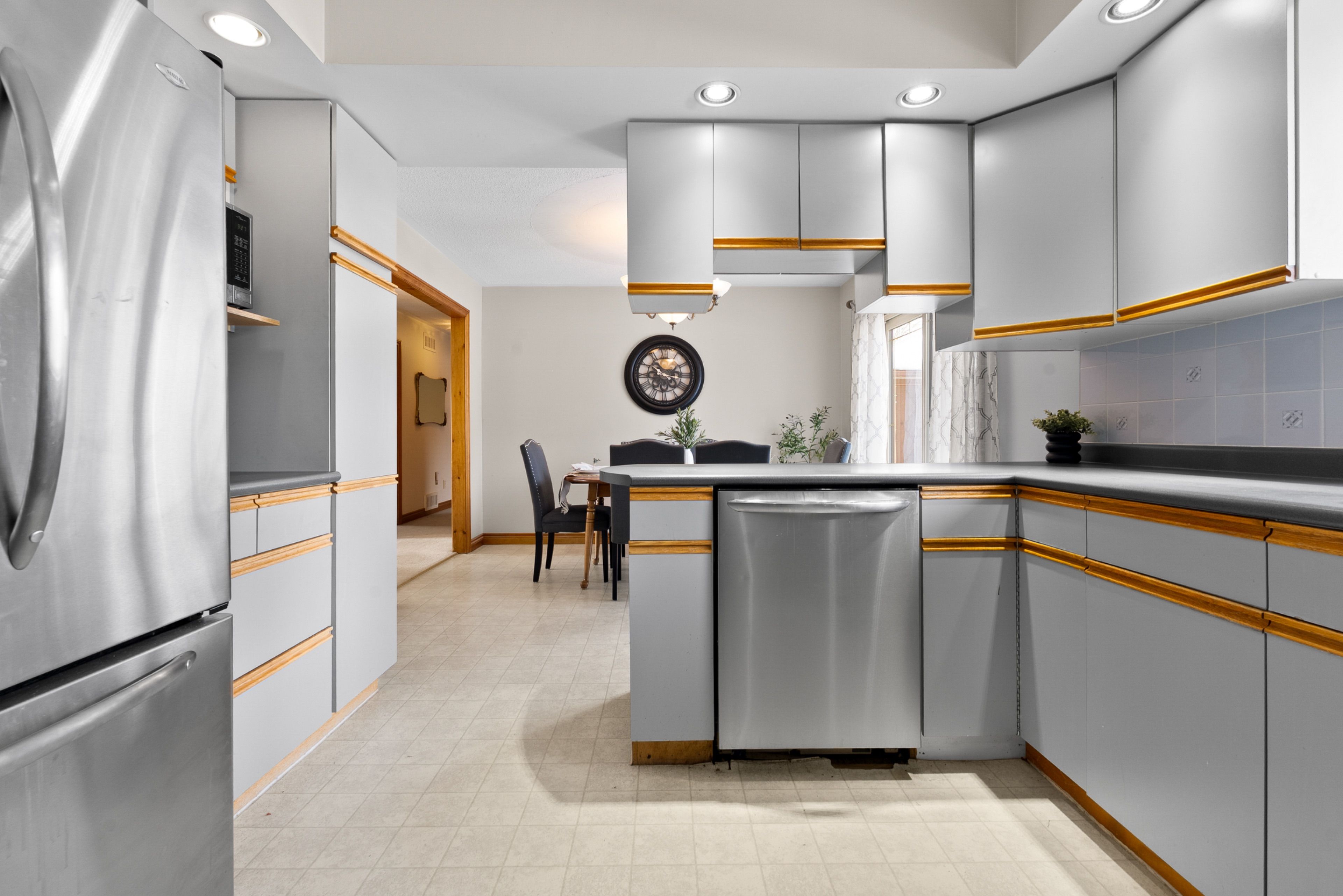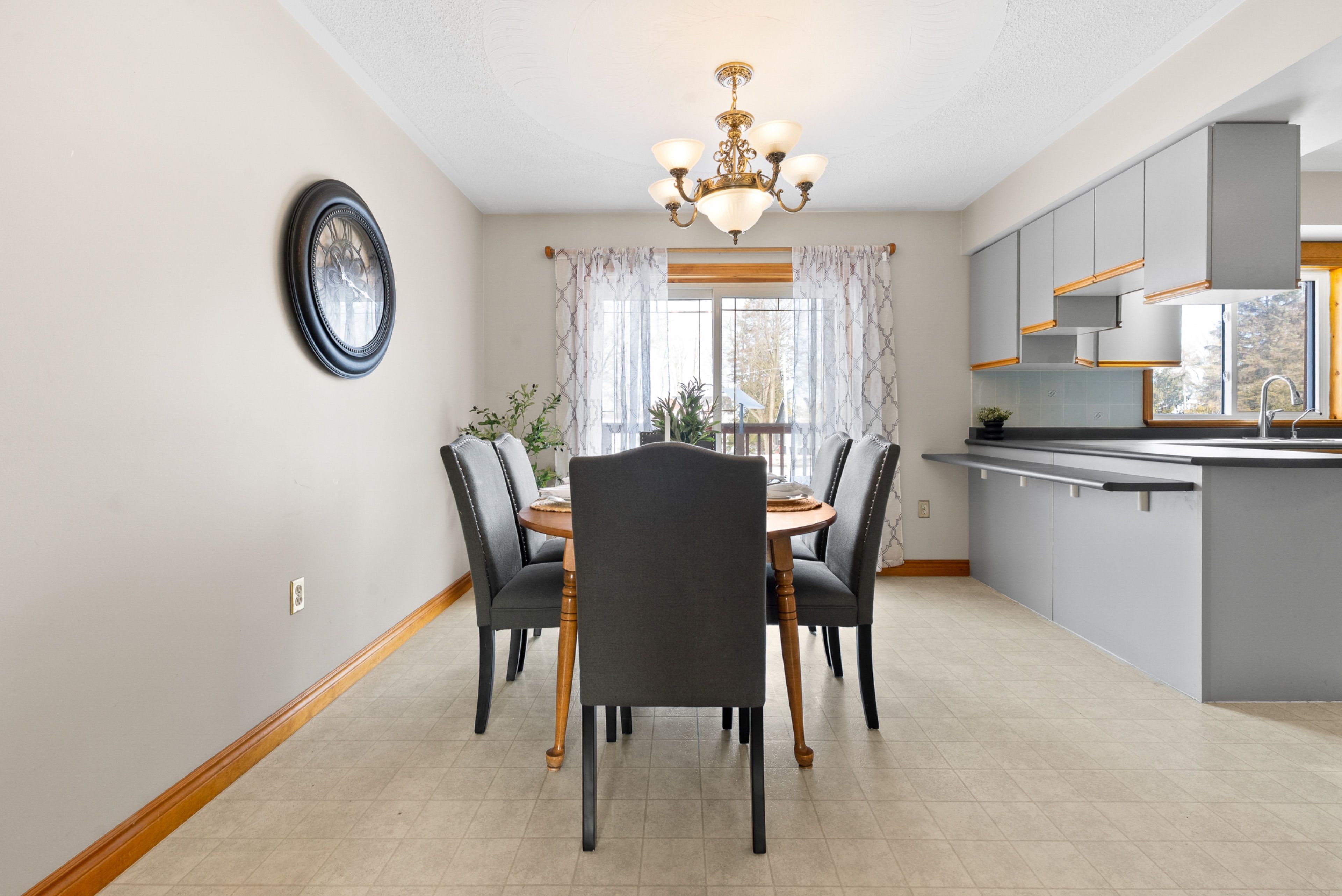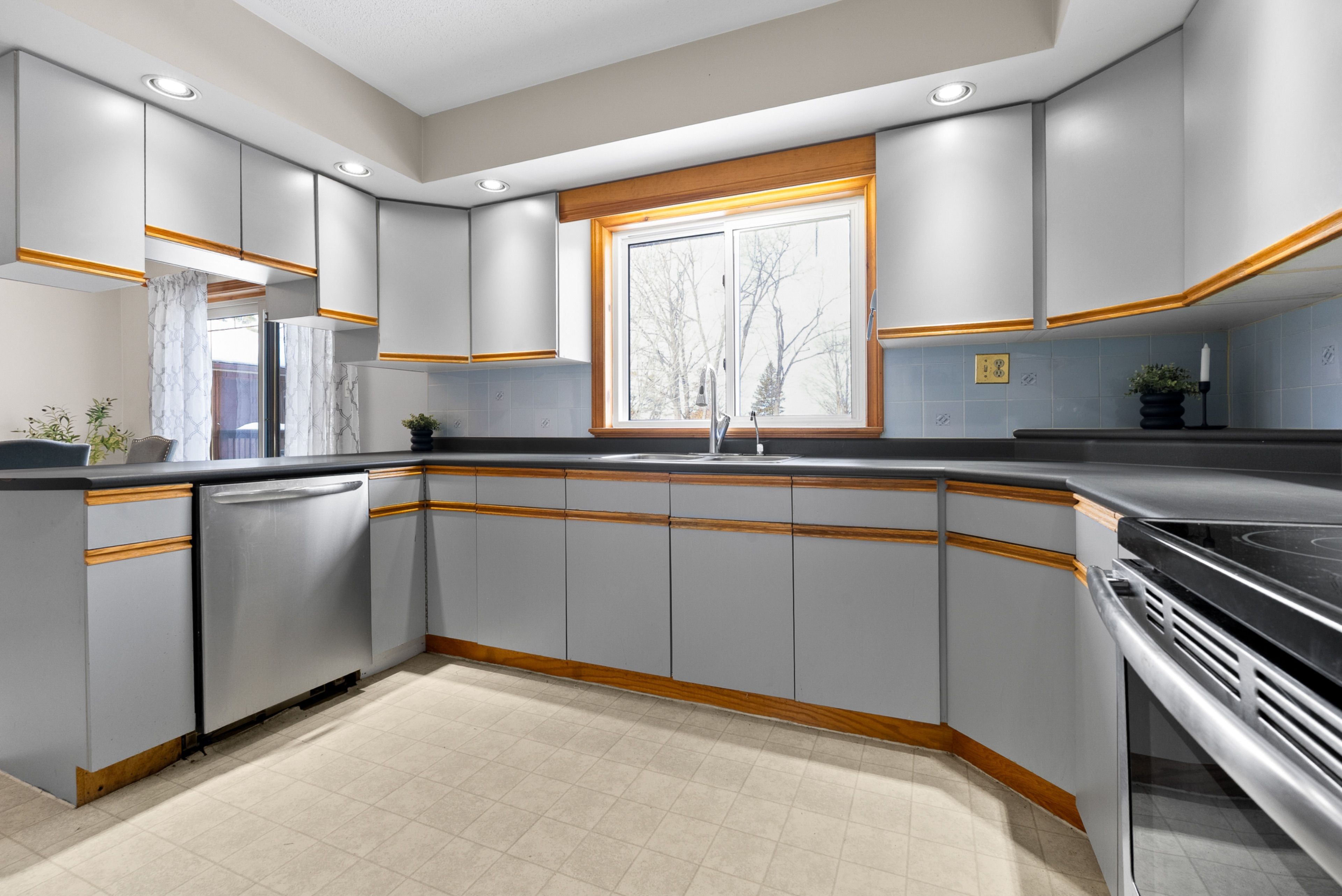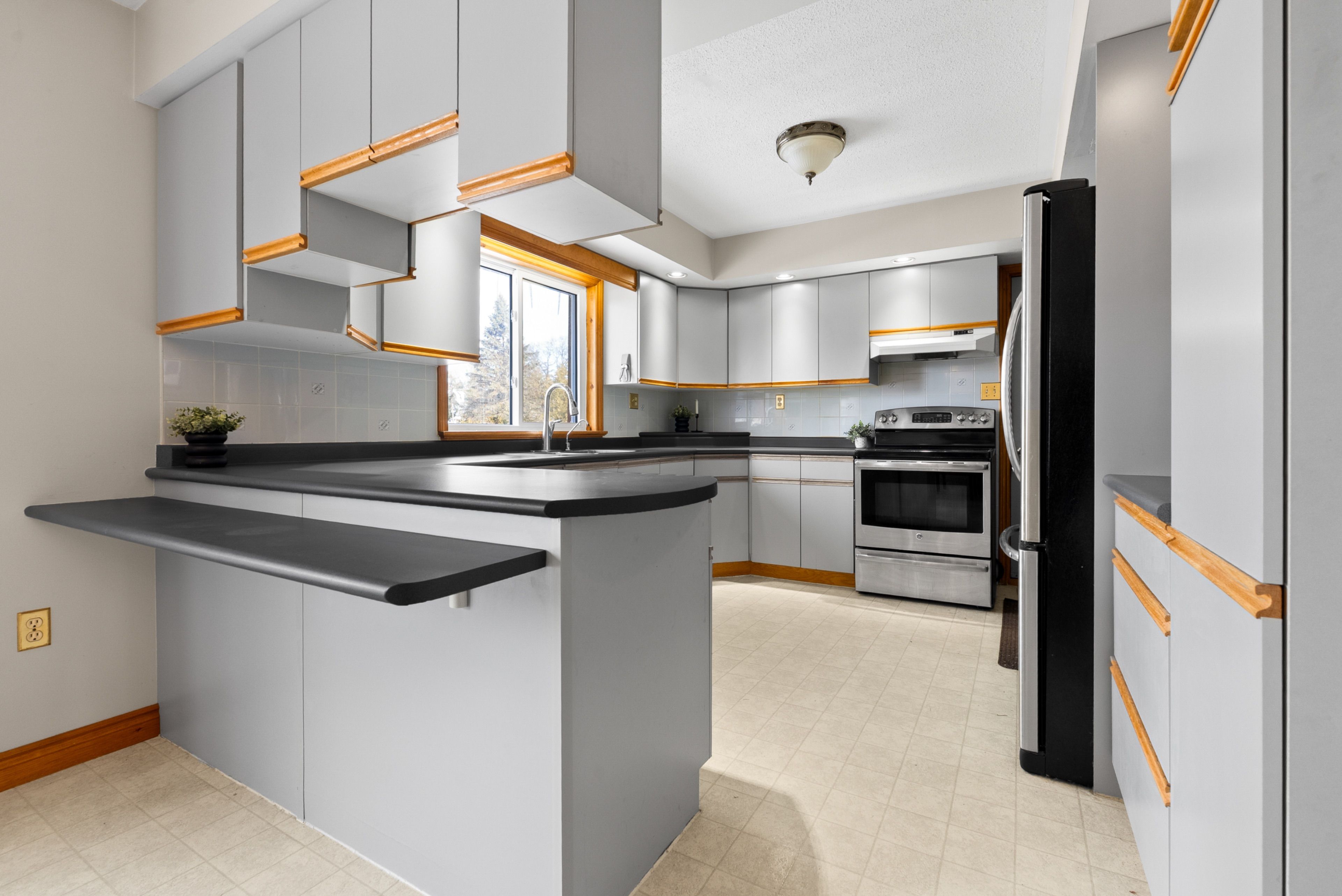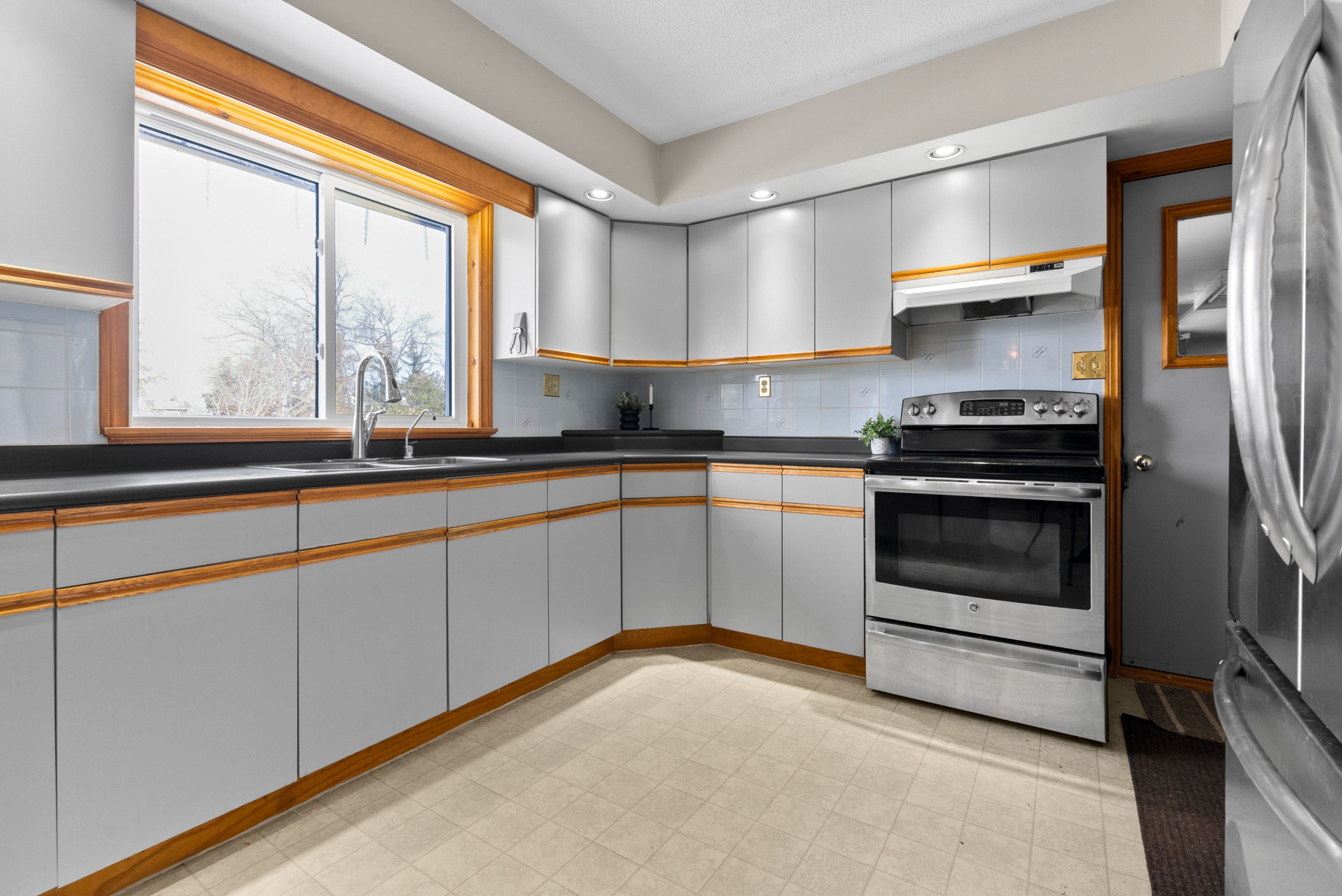 • Large kitchen with natural light and access to a deck.