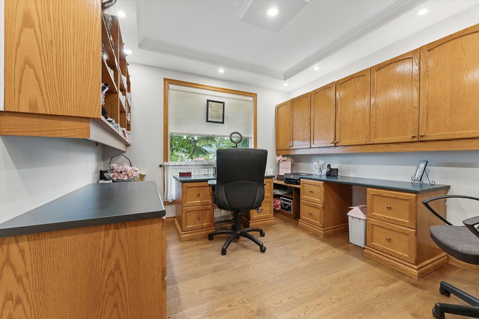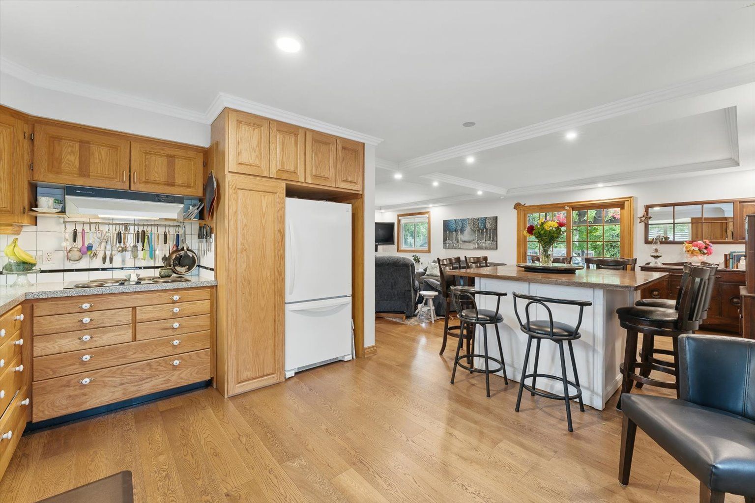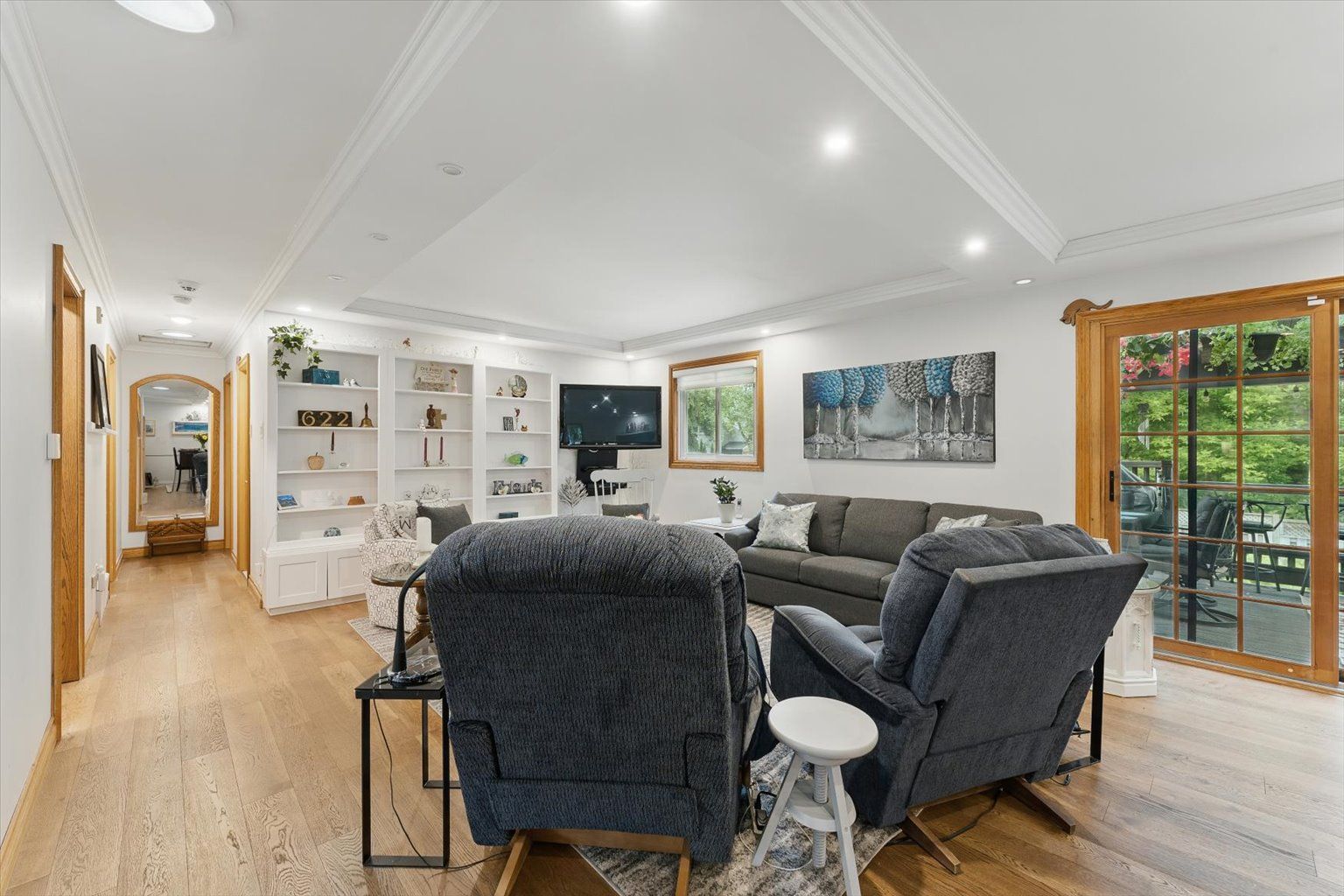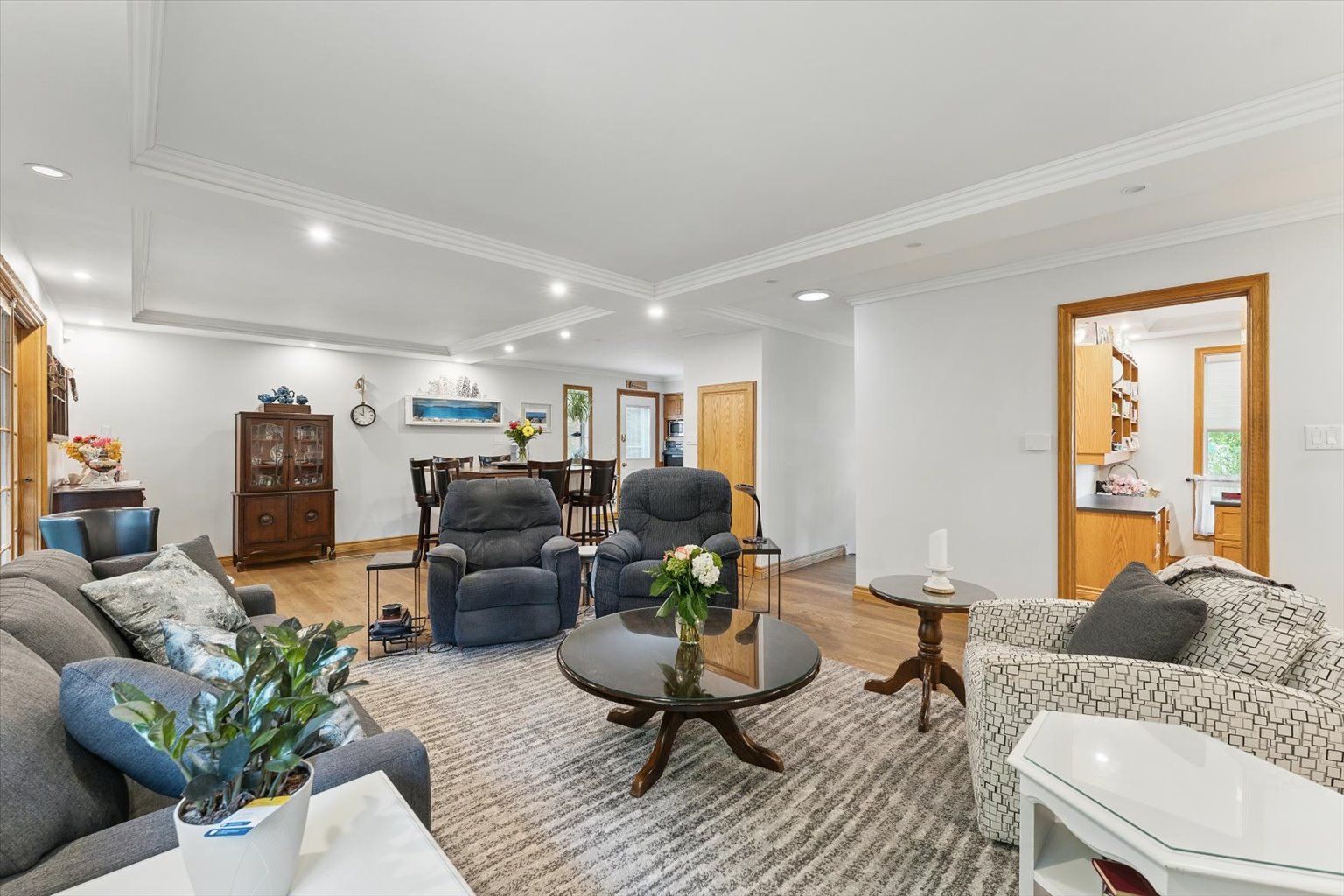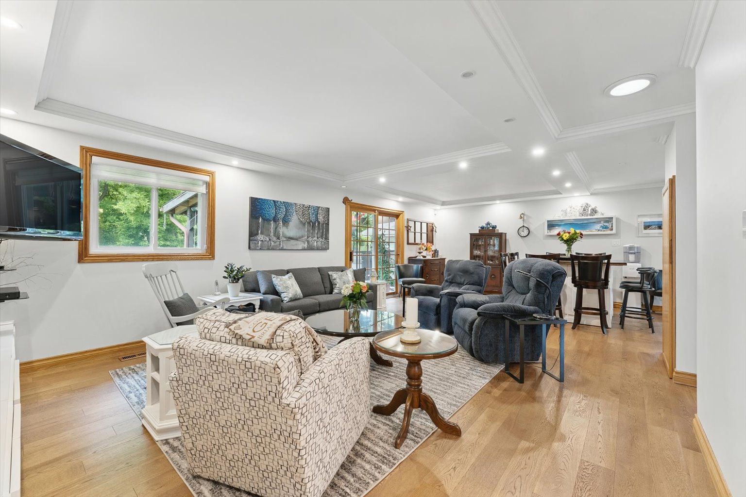 • Bright living spaces featuring engineered hardwood and coffered ceilings.