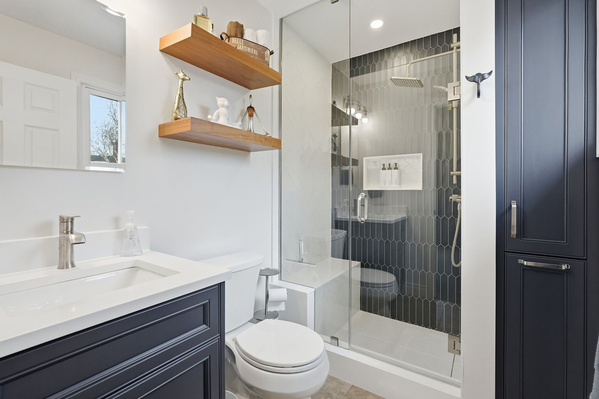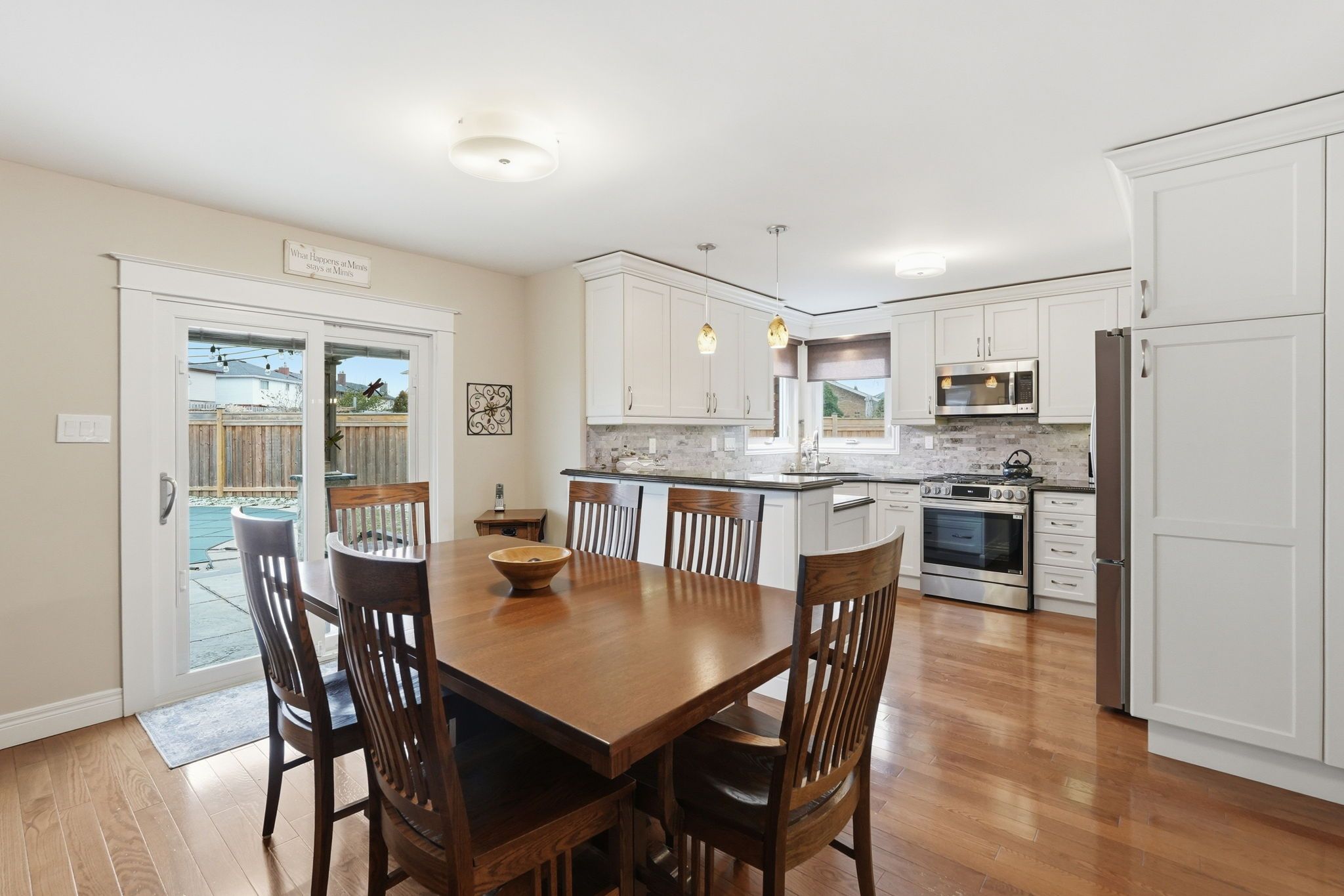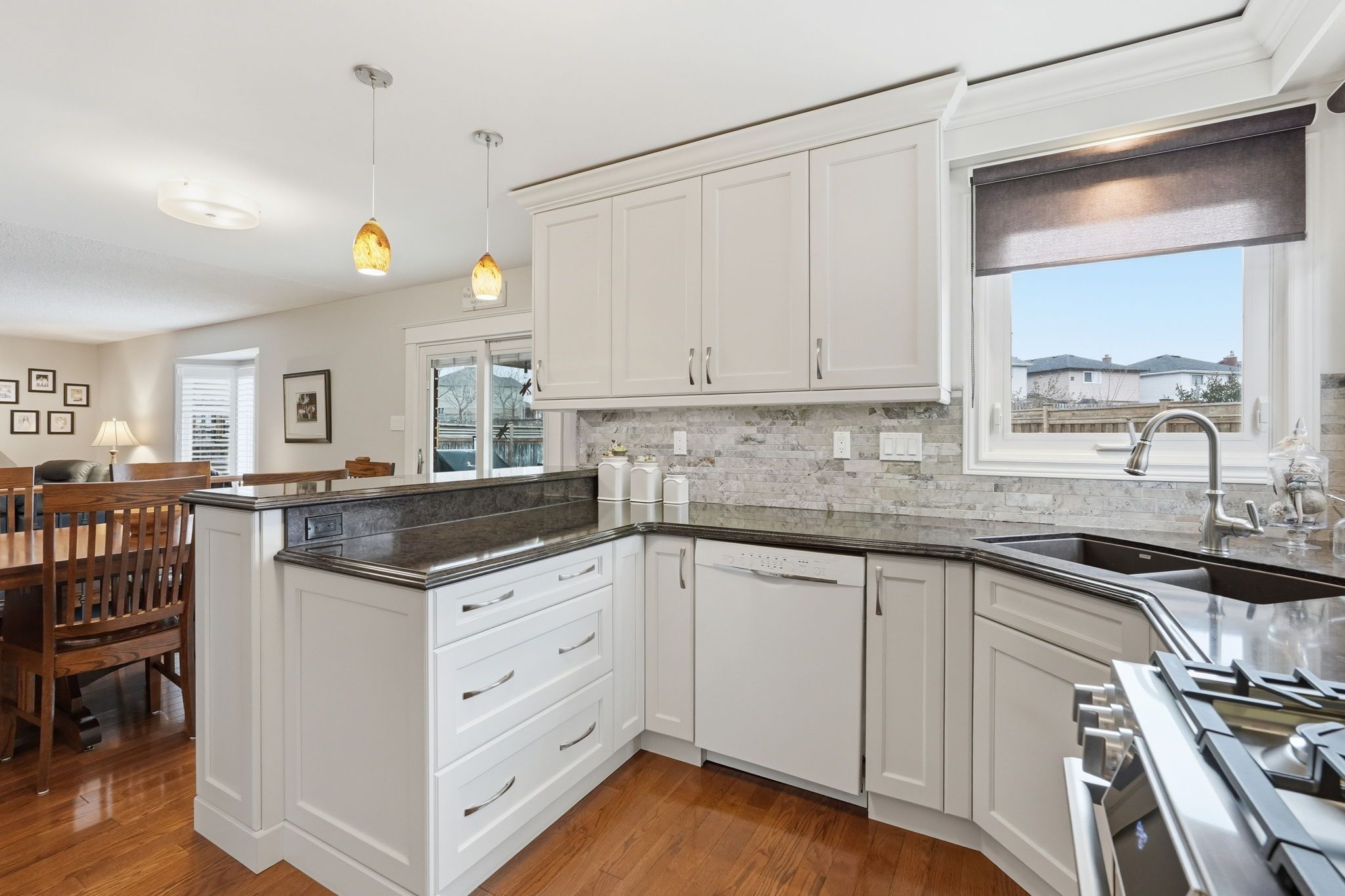 • Bright eat-in kitchen with quartz counters and gas stove.