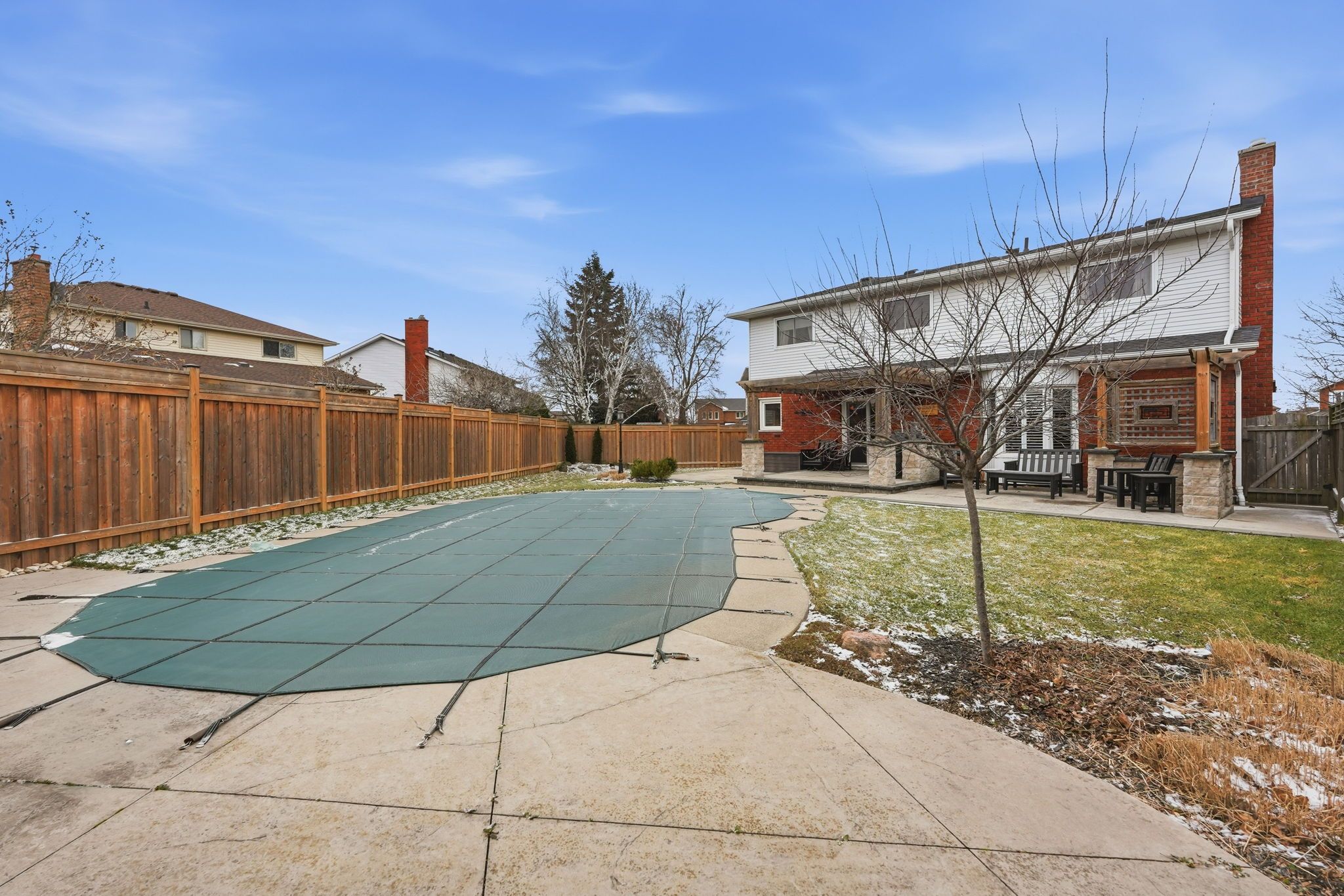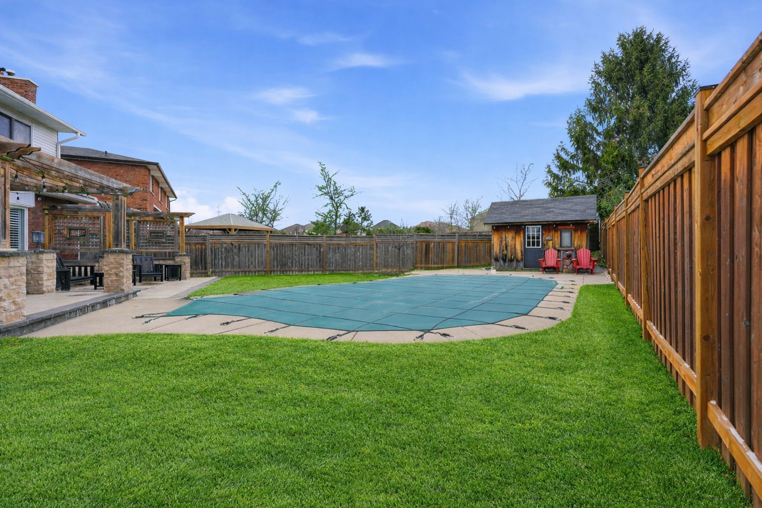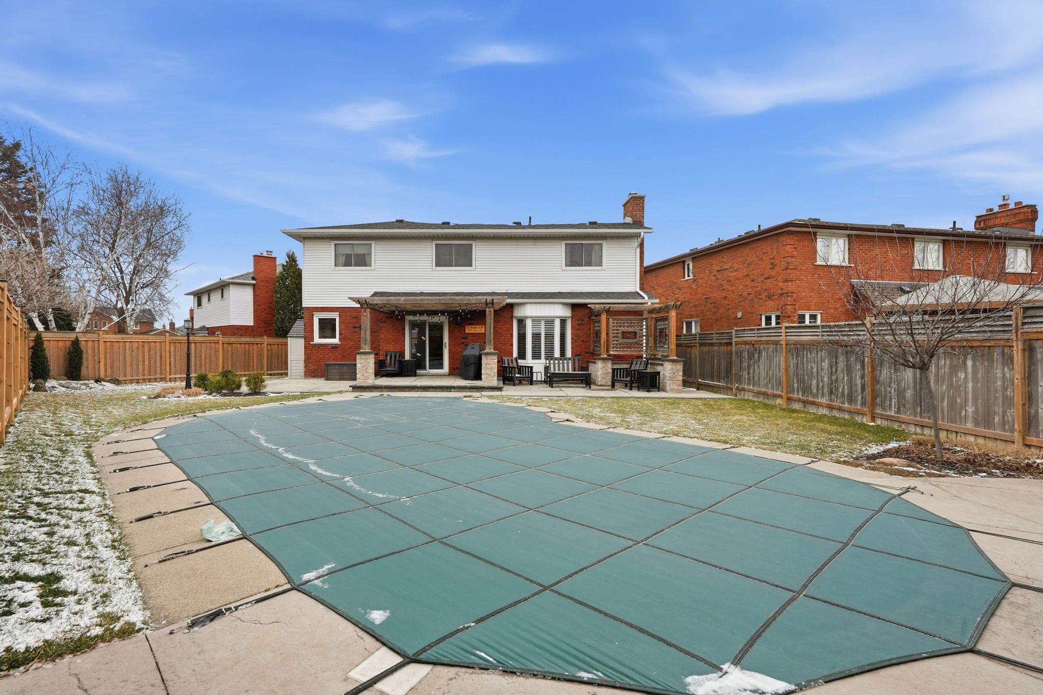 • Private backyard with heated pool, concrete deck, and pergola.