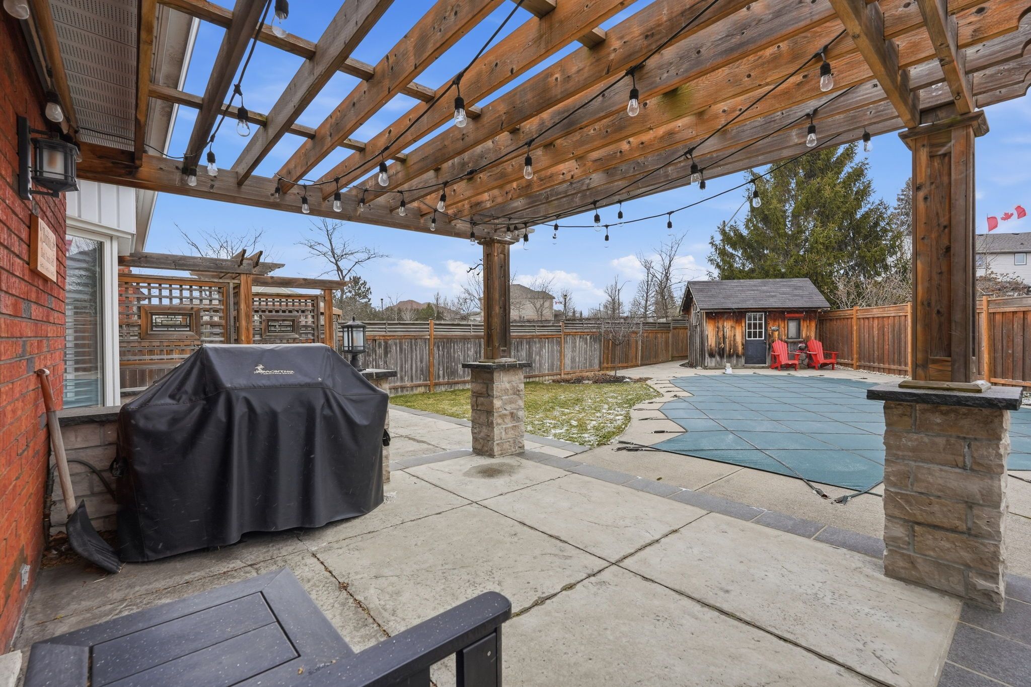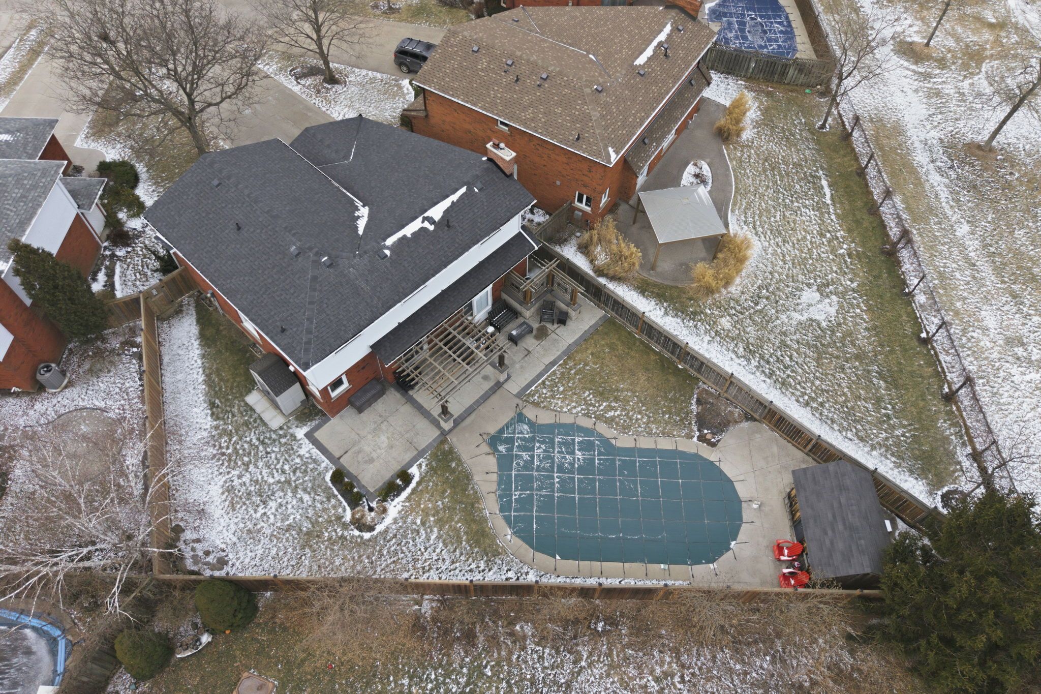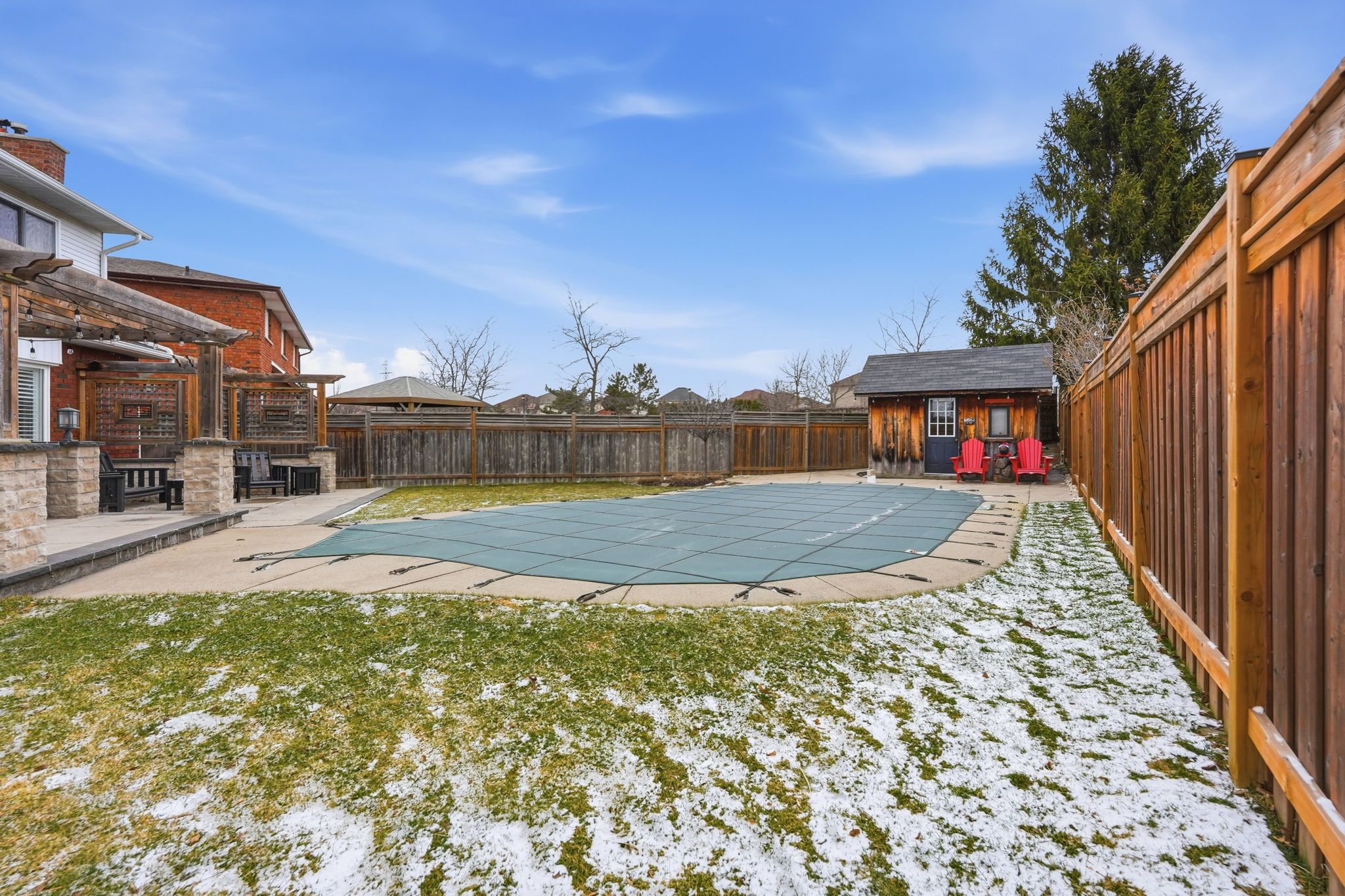 • Private backyard with heated pool, concrete deck, and pergola.