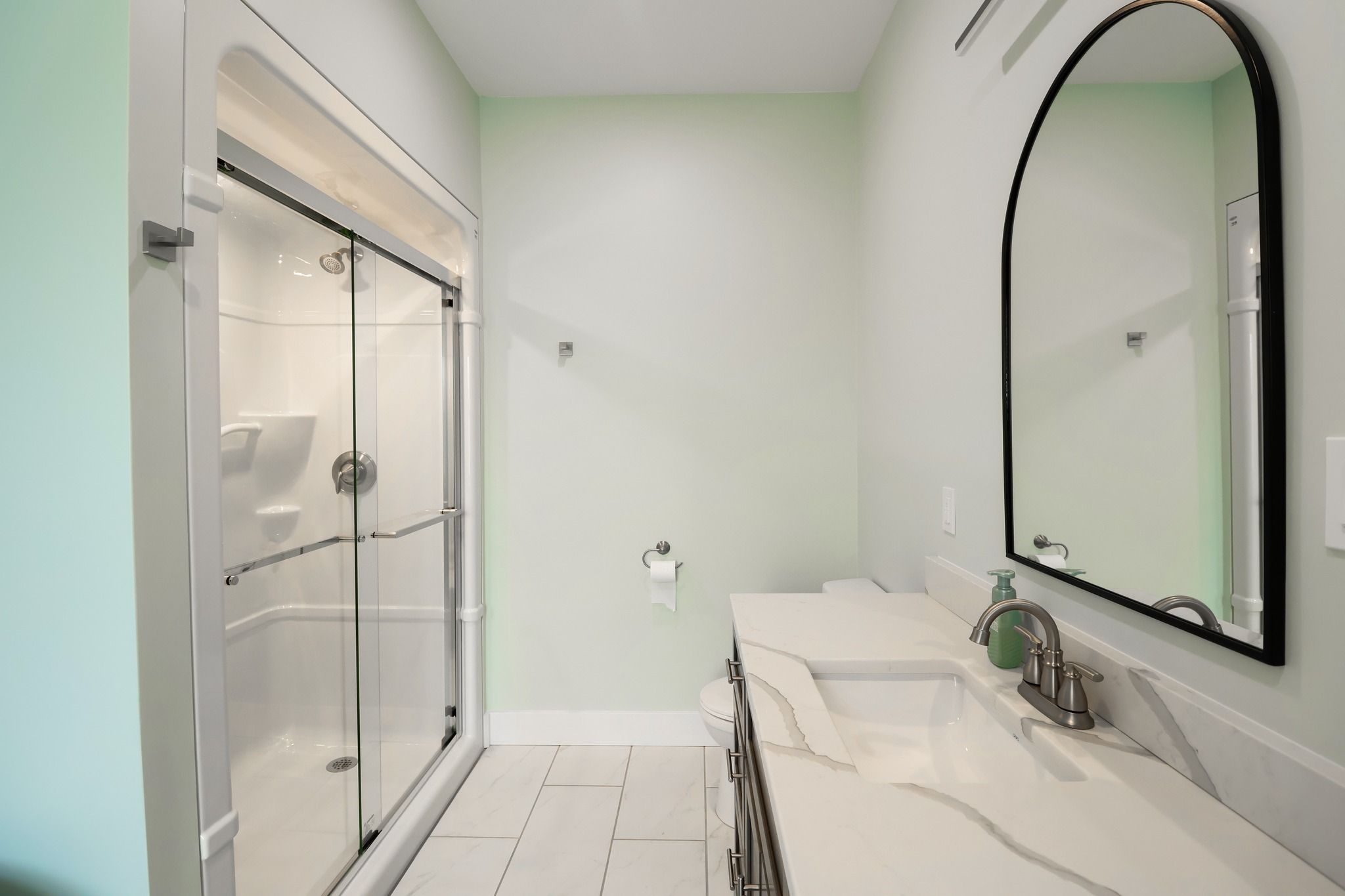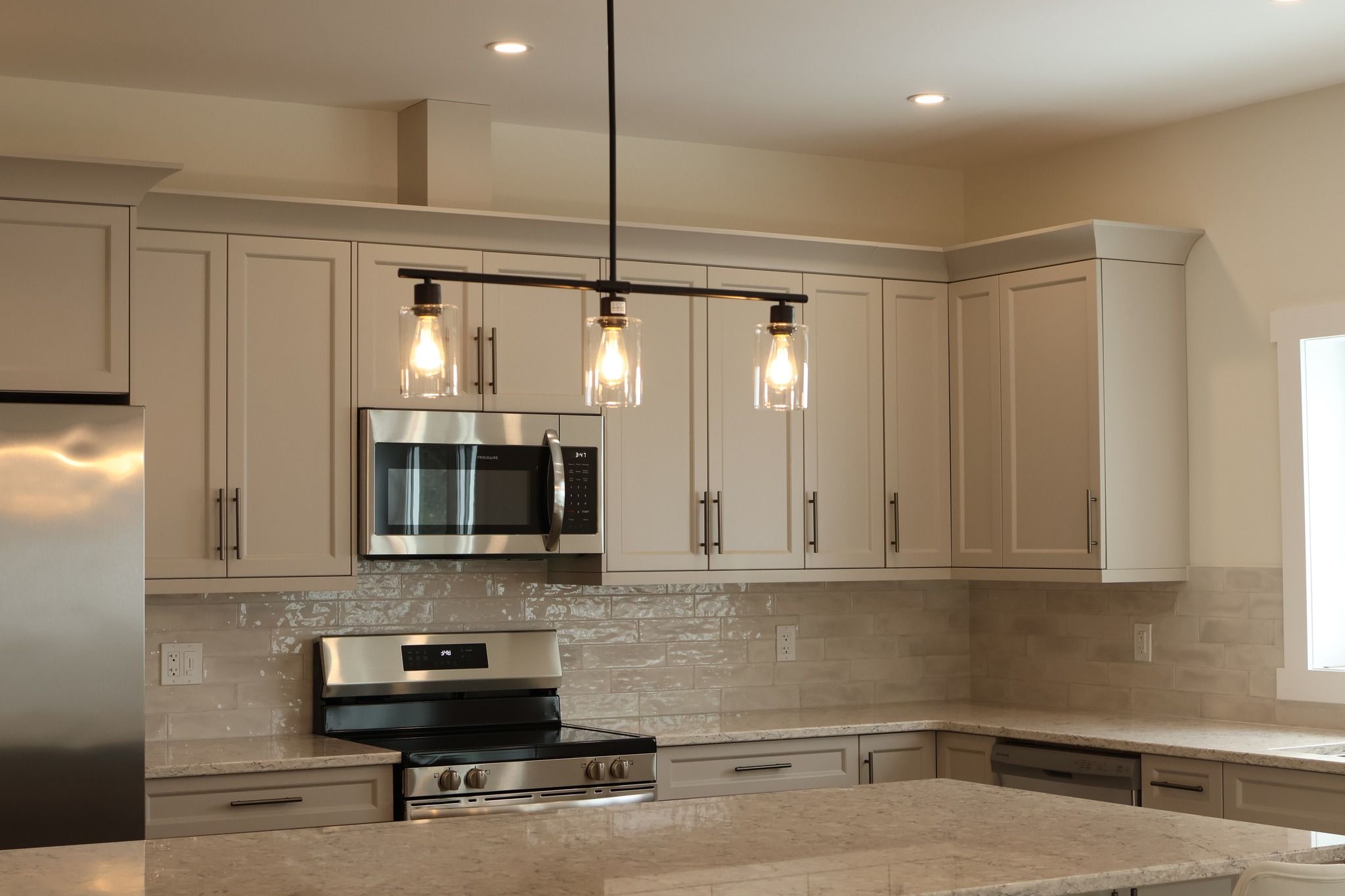 • Custom kitchen features quartz countertops and seating at the island.
