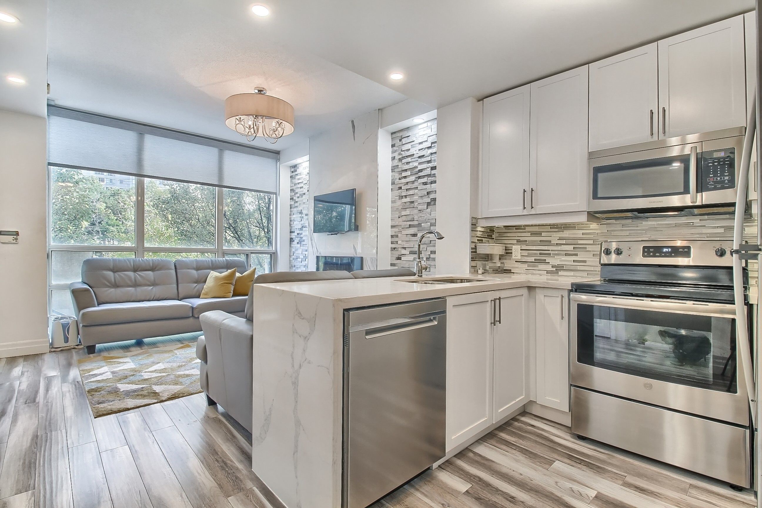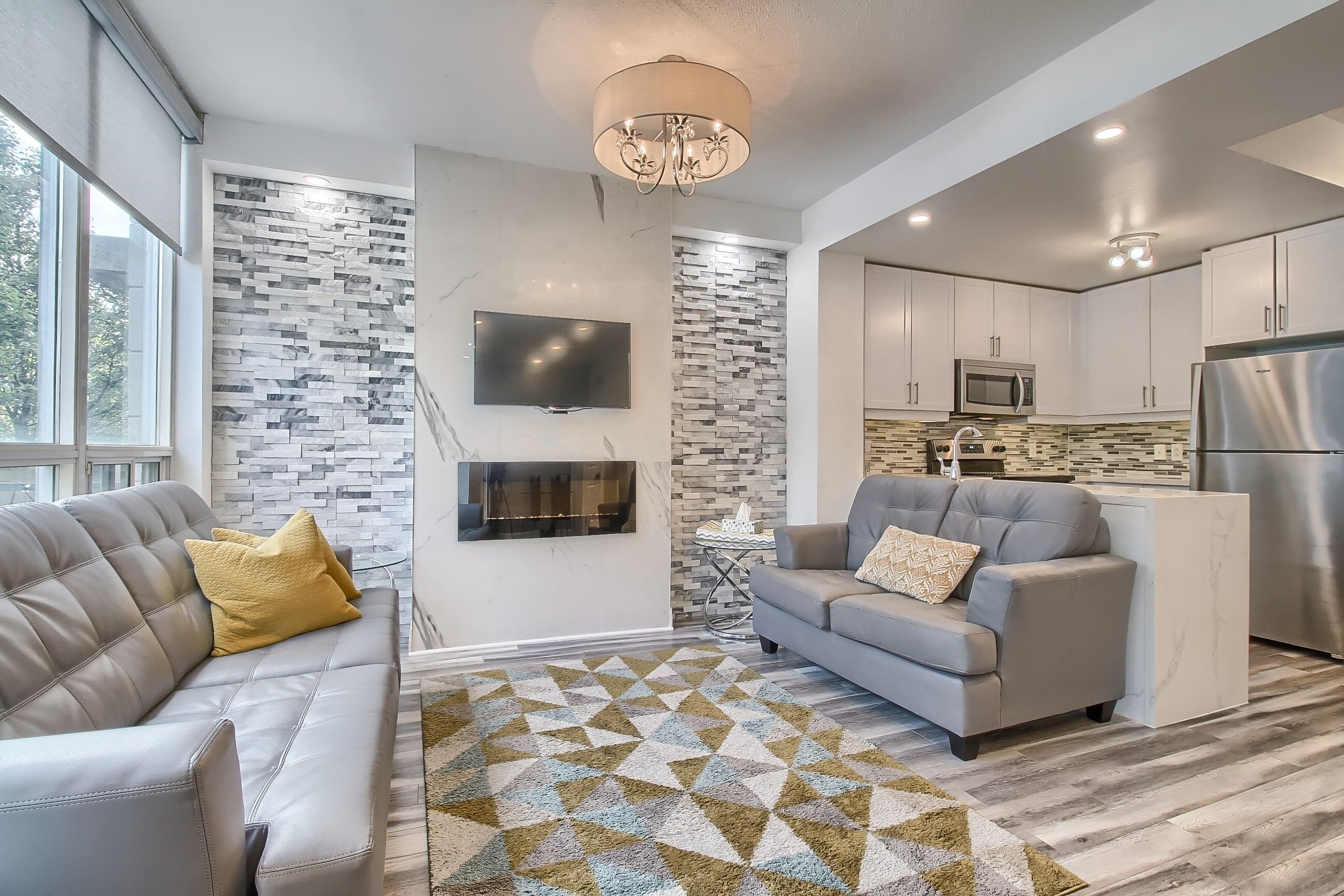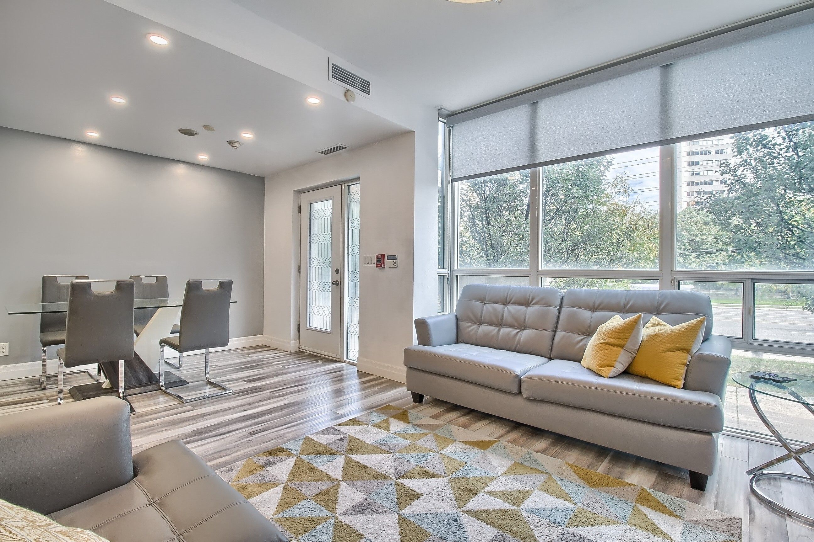 ***fully furnished***all utilities included (hydro, water, heat, ac)***this stunning 3 level condo townhouse is completely renovated top to bottom. 3 large bedrooms and 2 spa like baths. Upscale laminate throughout, modern kitchen with quartz counters, stone backsplash, stainless steel appliances, modern light fixtures, upper floor has patio doors to own private terrace that leads toa huge communal beautiful gardens!