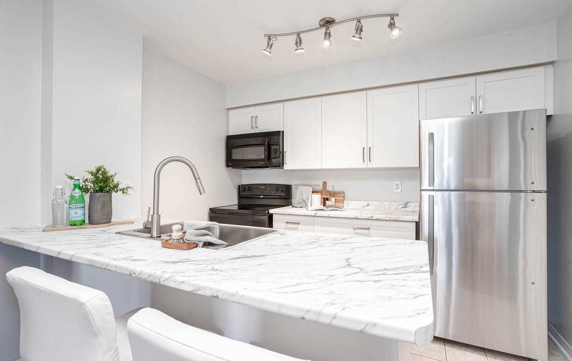 • Modern kitchen with stainless steel appliances and breakfast bar.