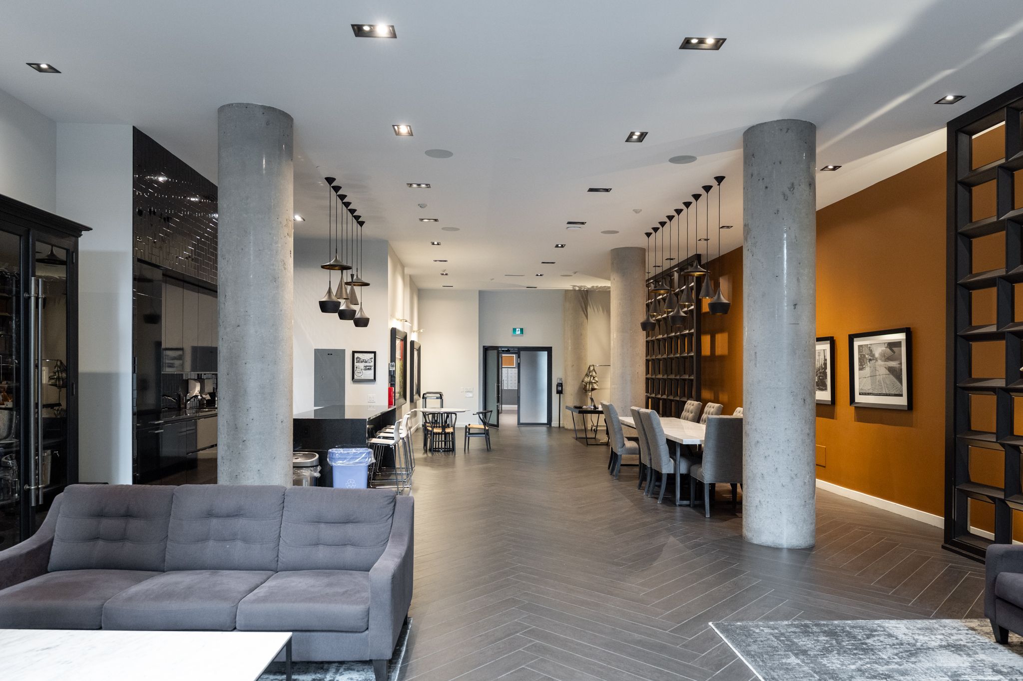• Modern kitchen paired with an open concept living and dining area.