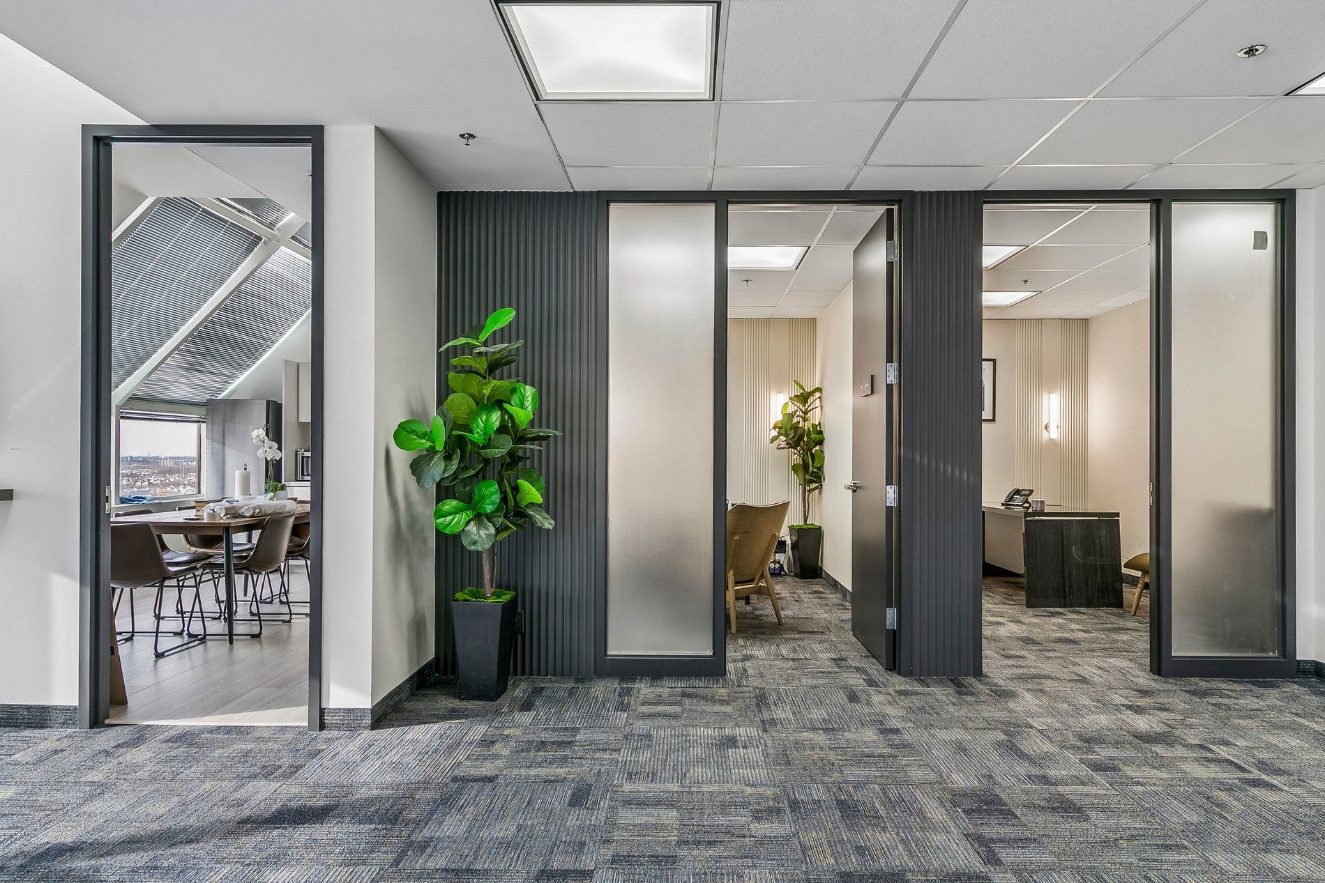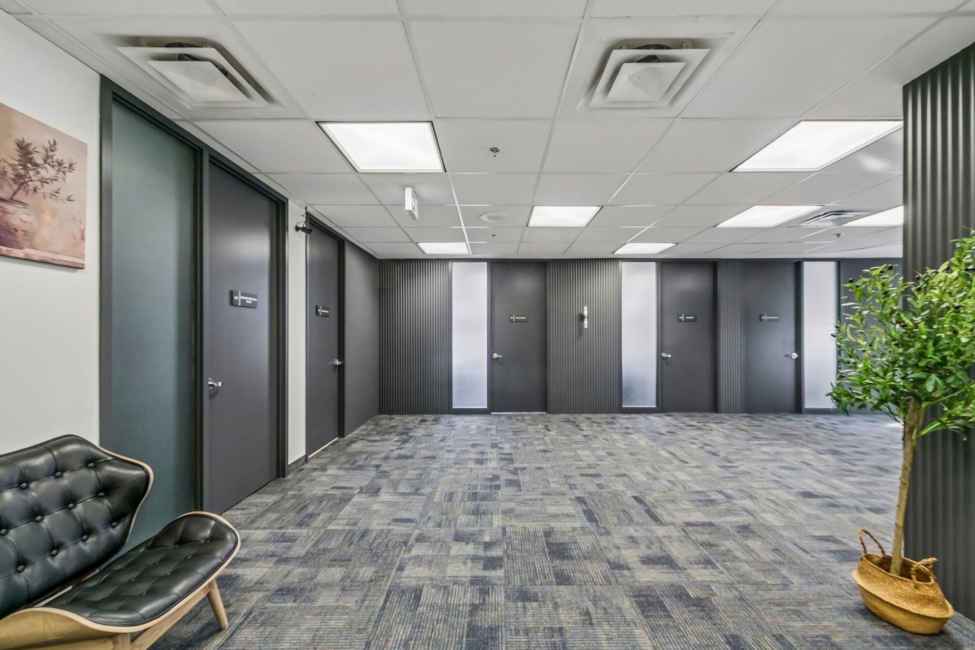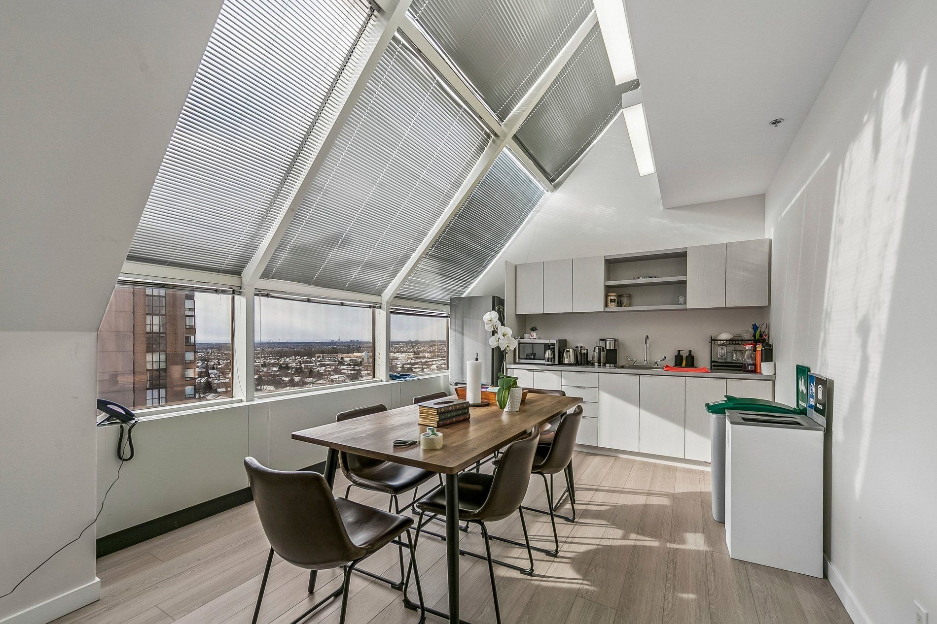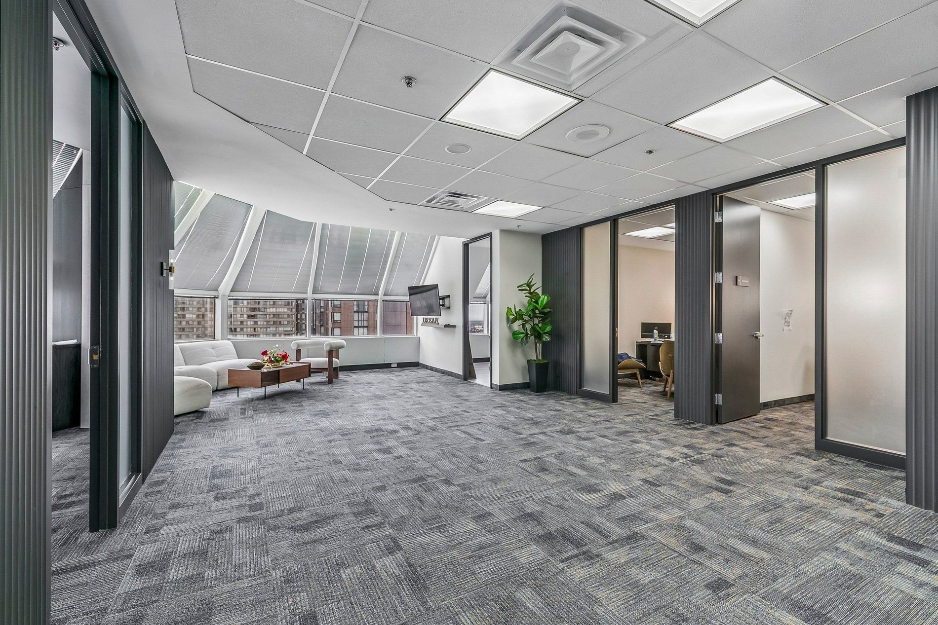 • Space includes private offices, a boardroom, kitchenette, and open area.