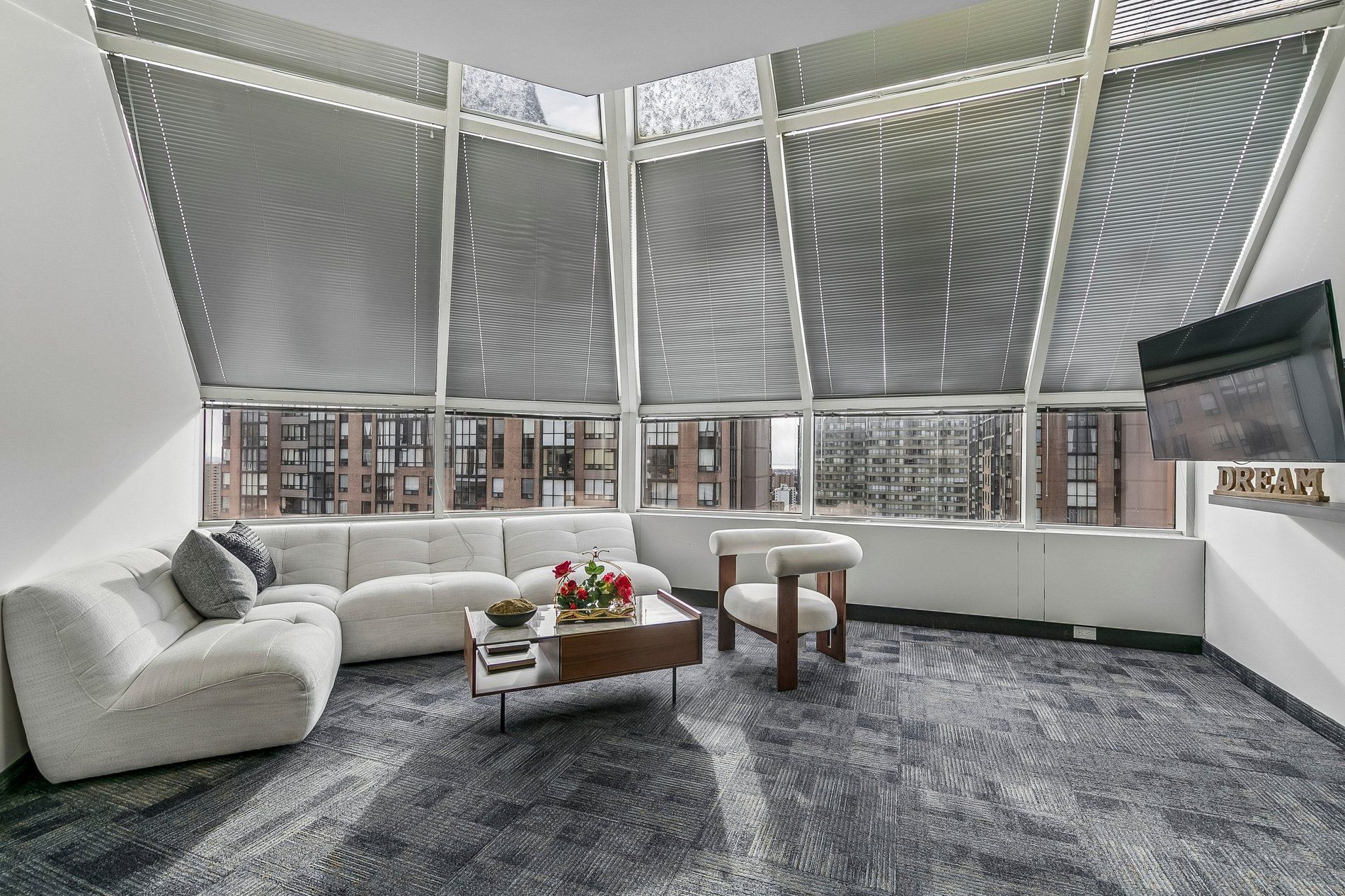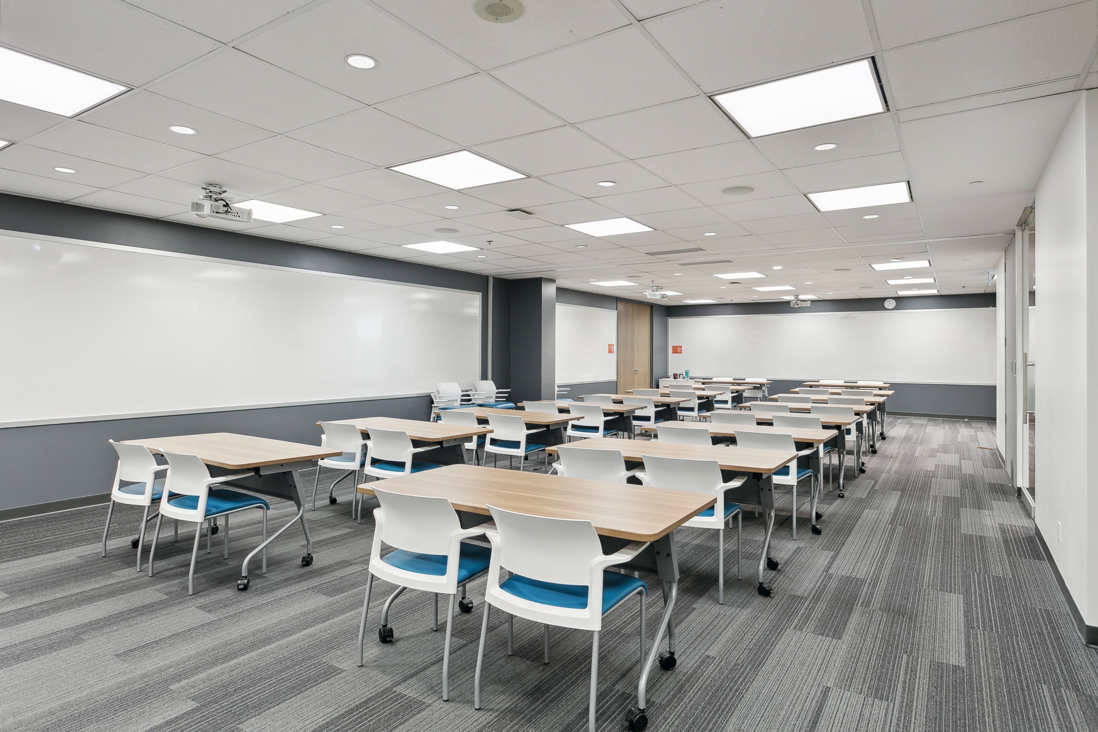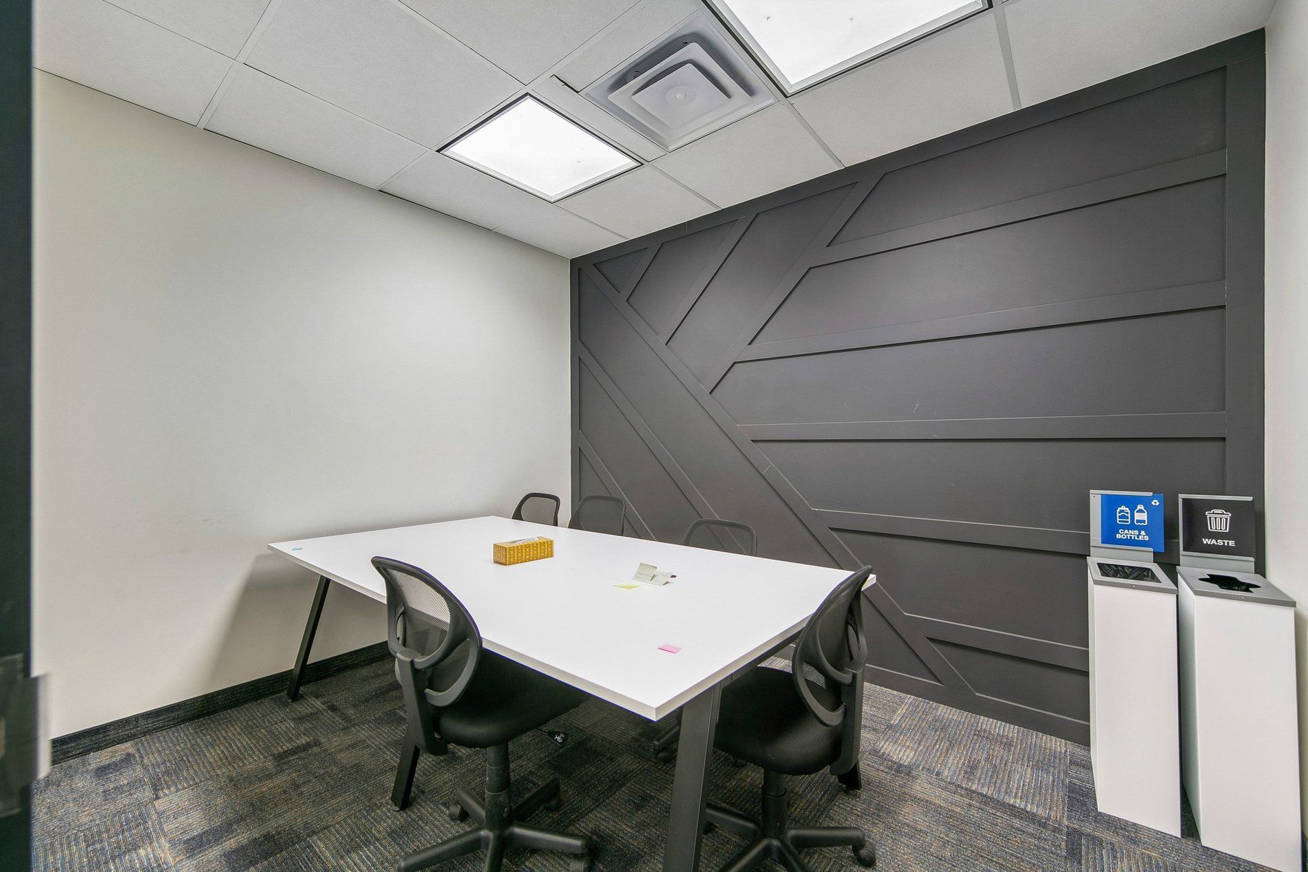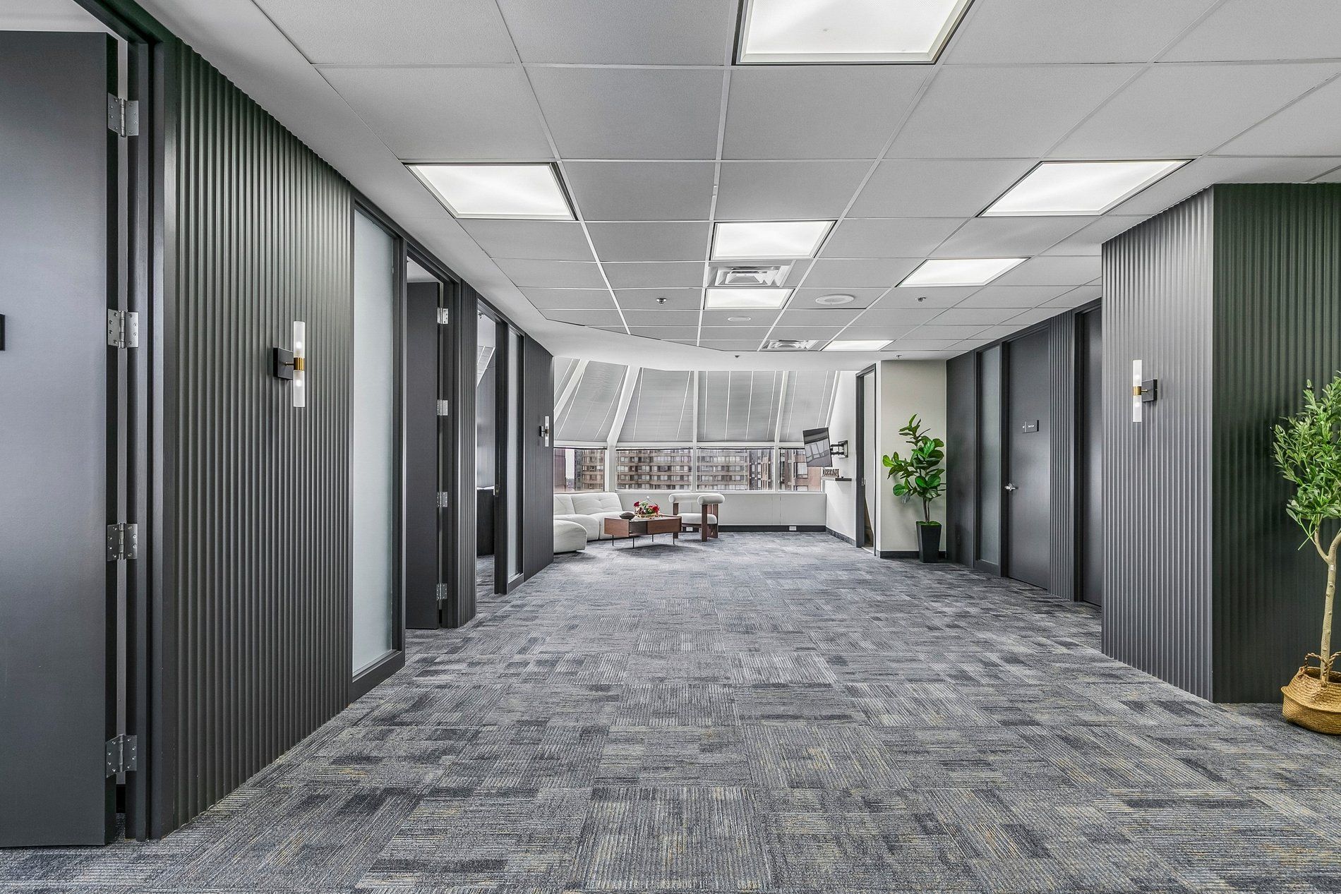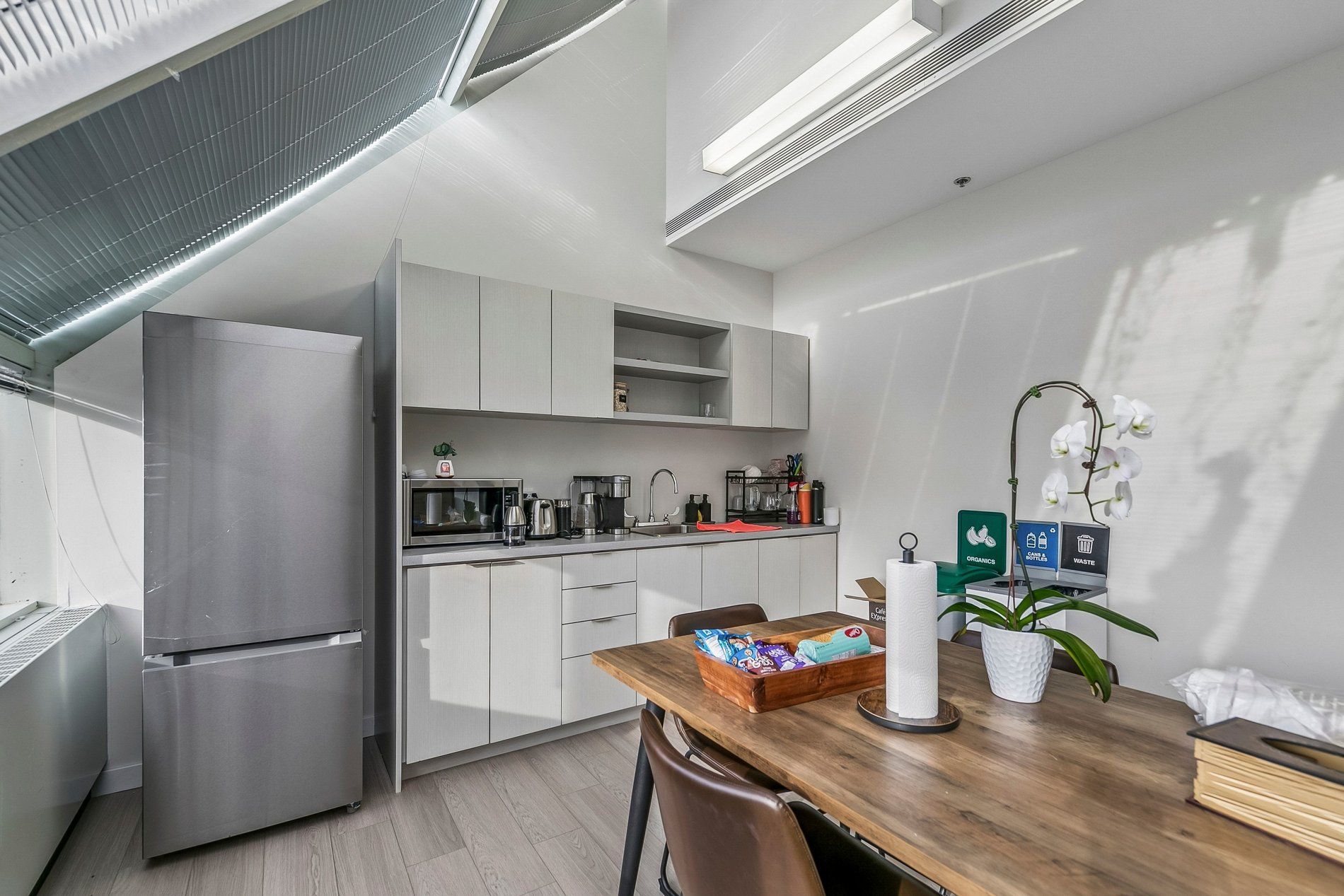 • Space includes private offices, a boardroom, kitchenette, and open area.
