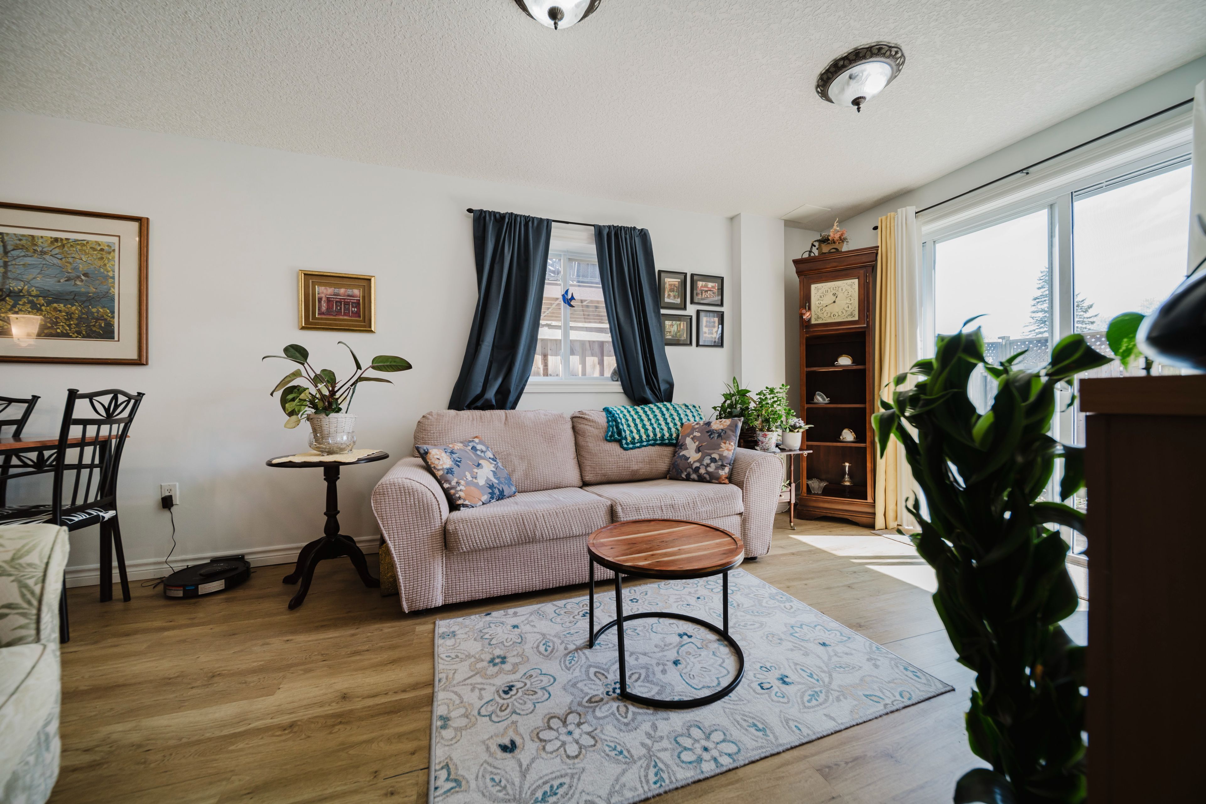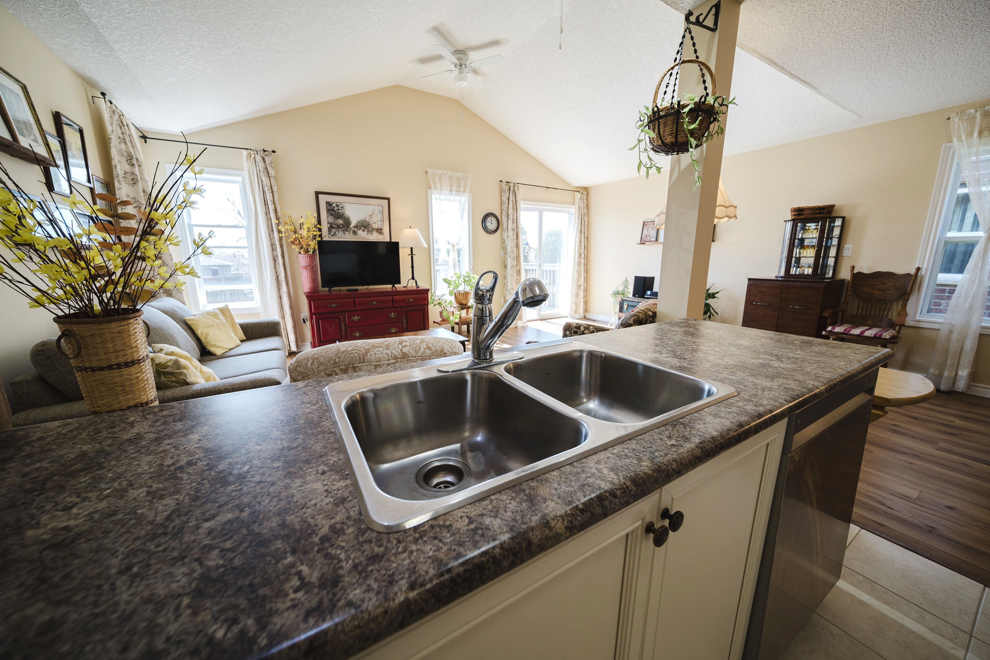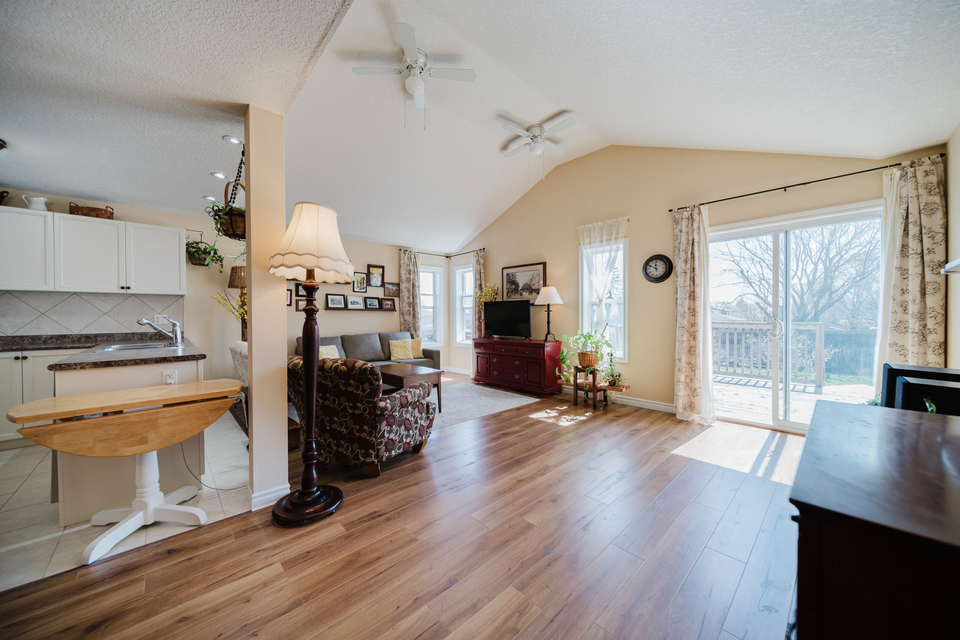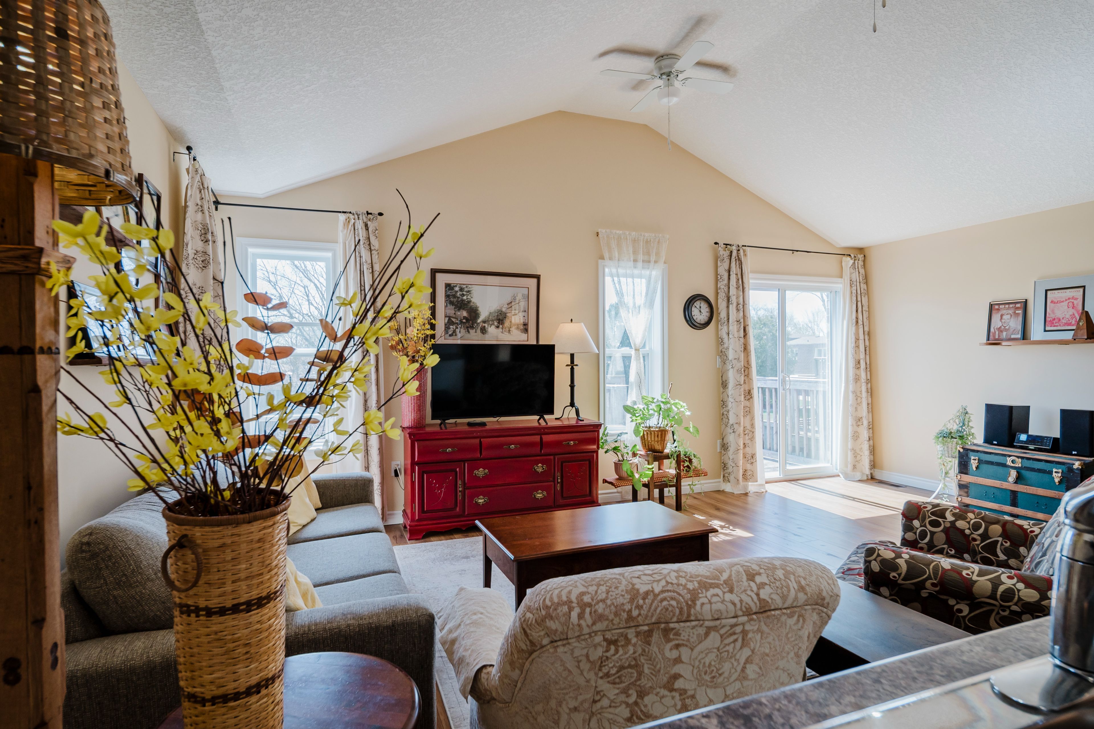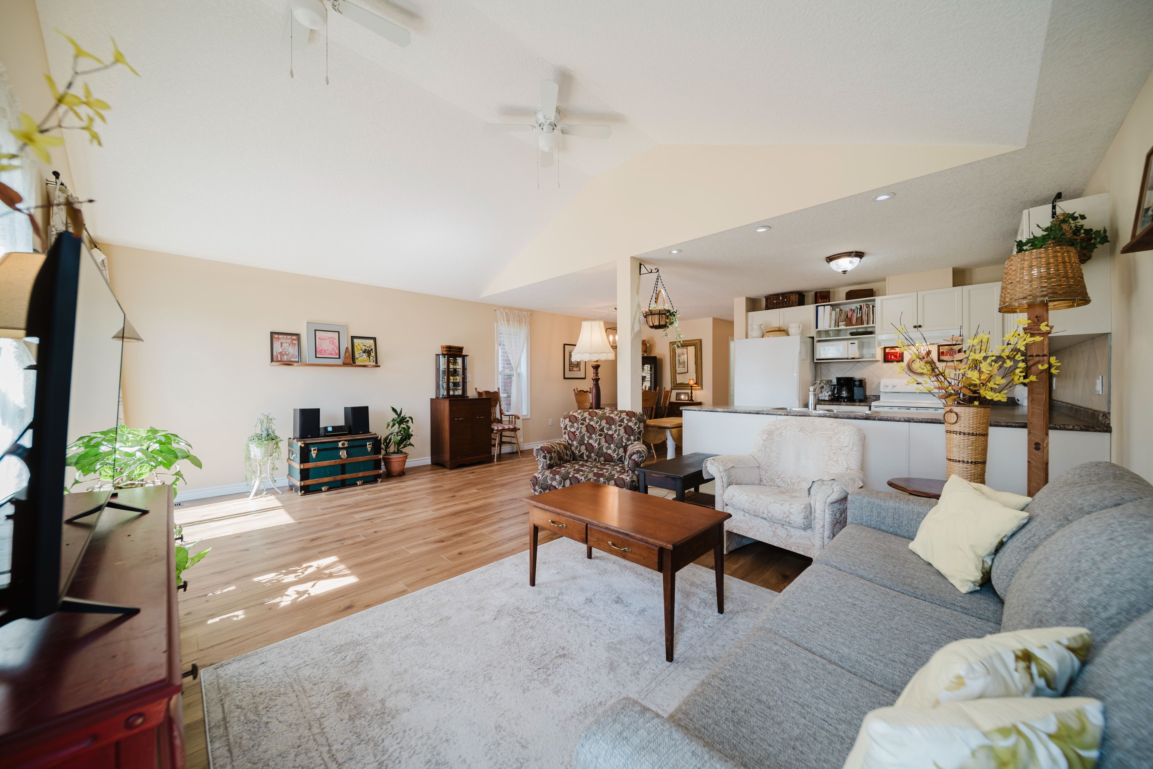 • Bright living room with vaulted ceilings and large windows for natural light.