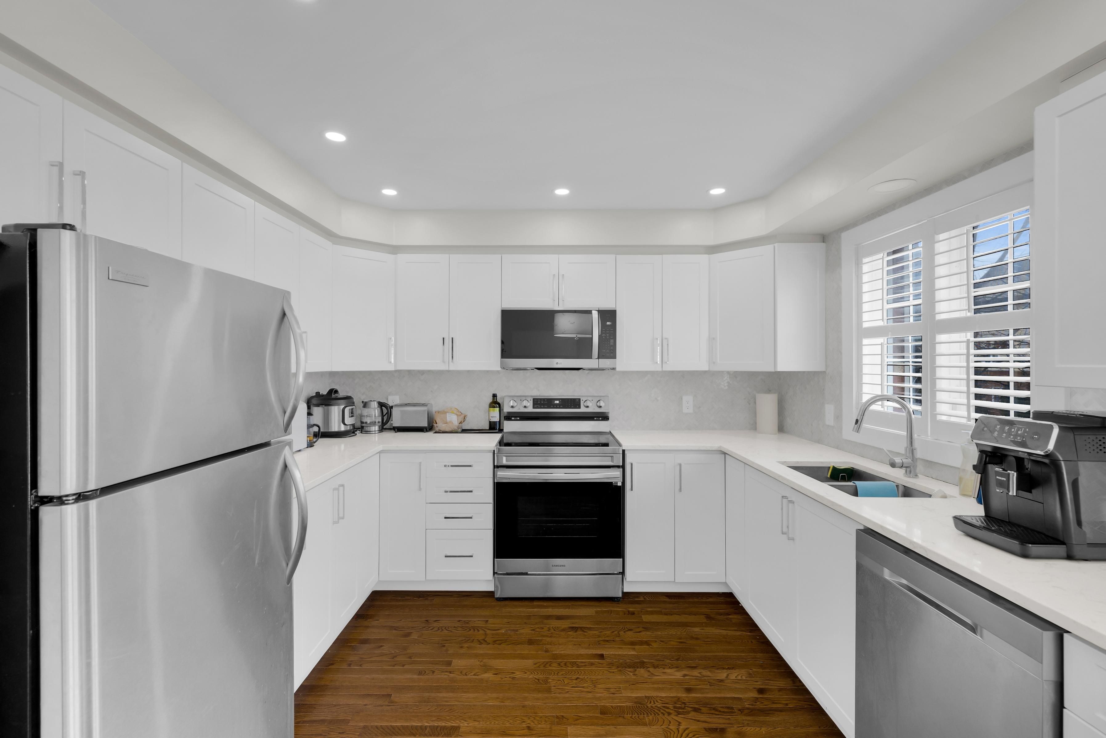 • Modern kitchen featuring white cabinetry, quartz countertops, and stainless steel appliances.