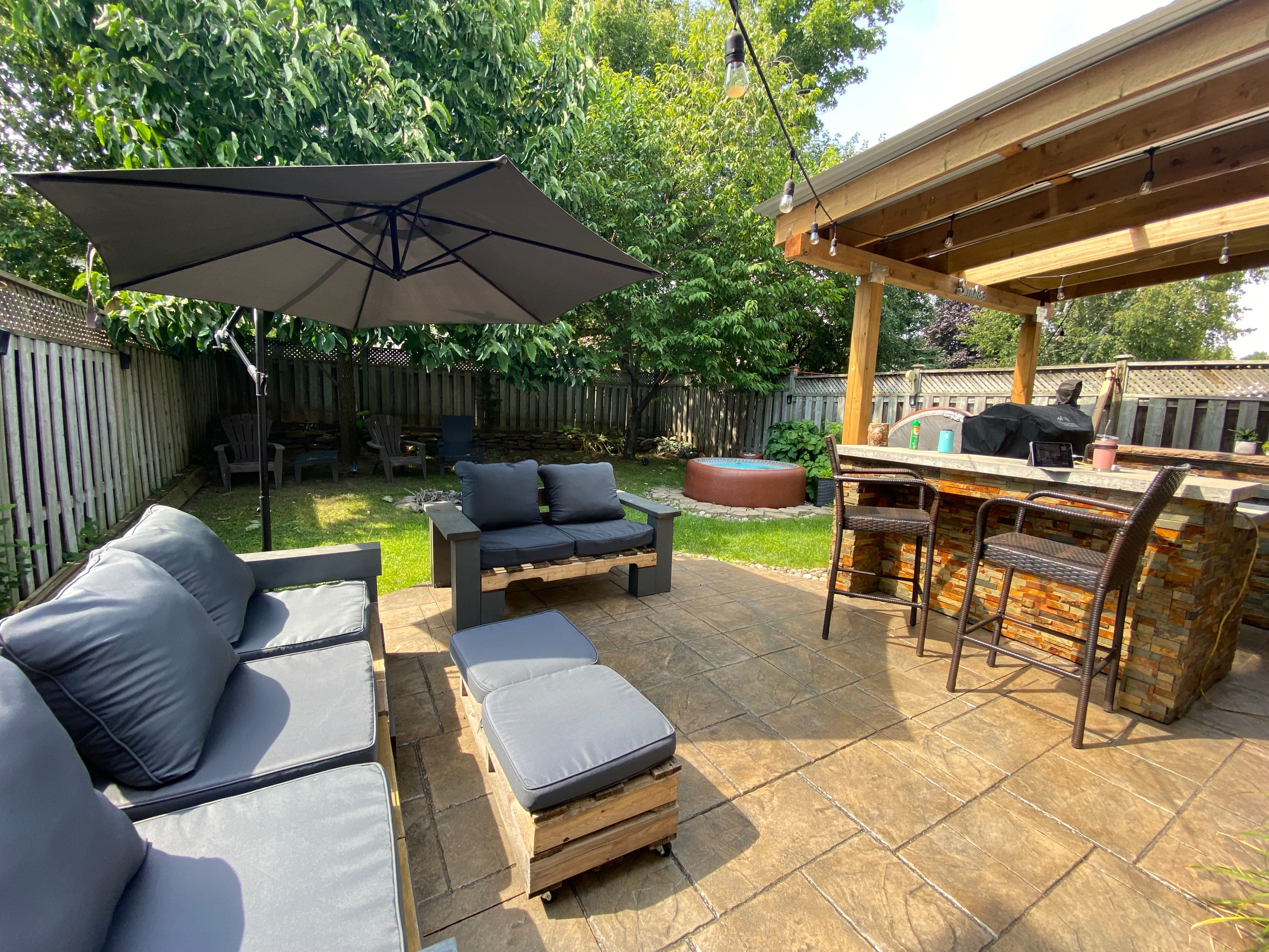 • Fully fenced backyard with a covered patio and outdoor kitchen.