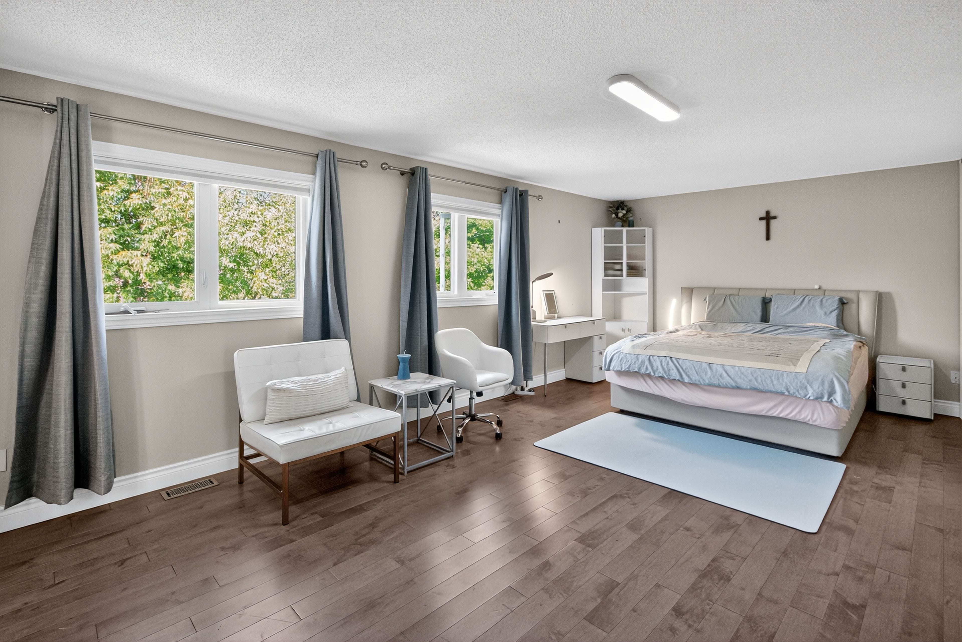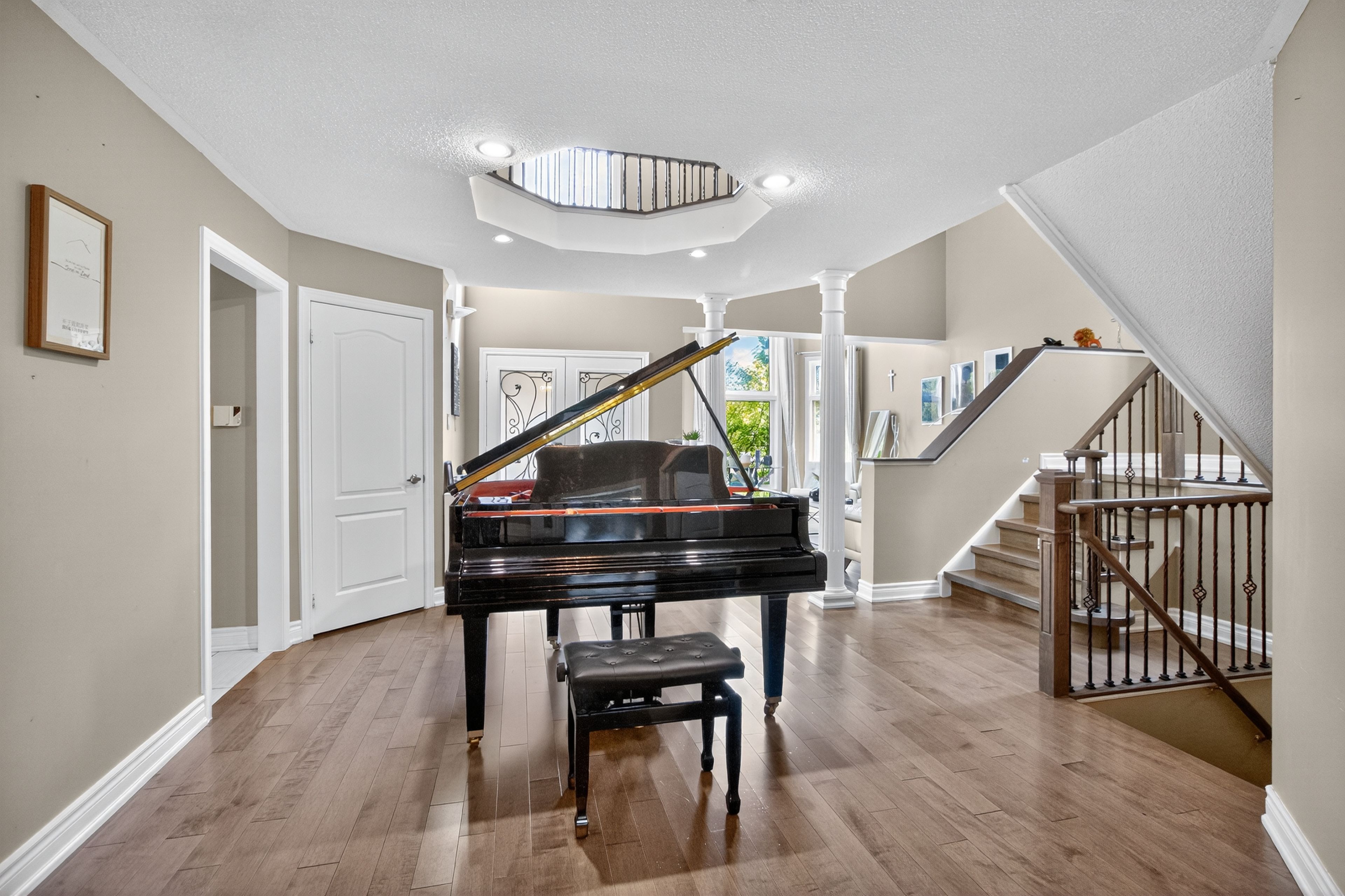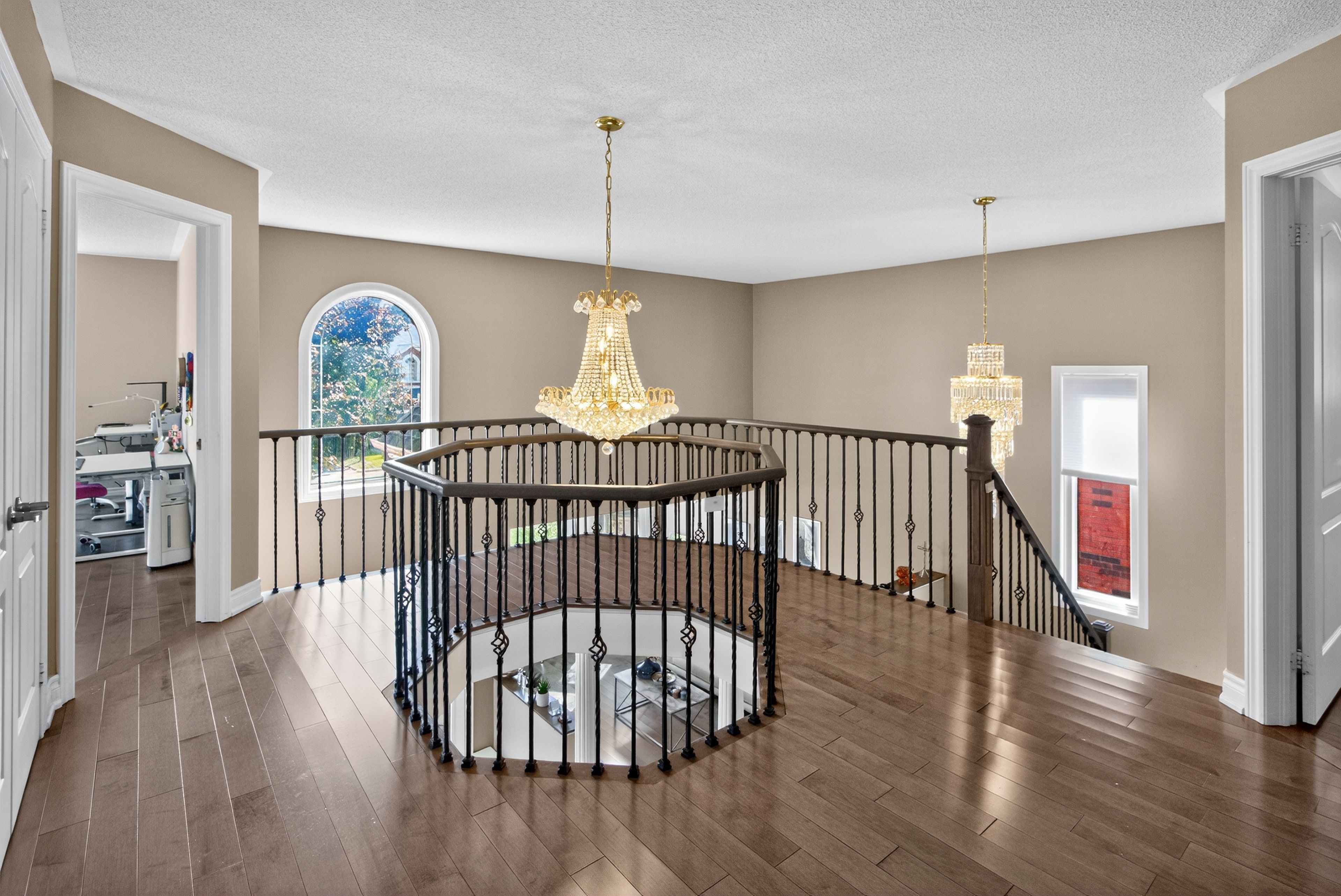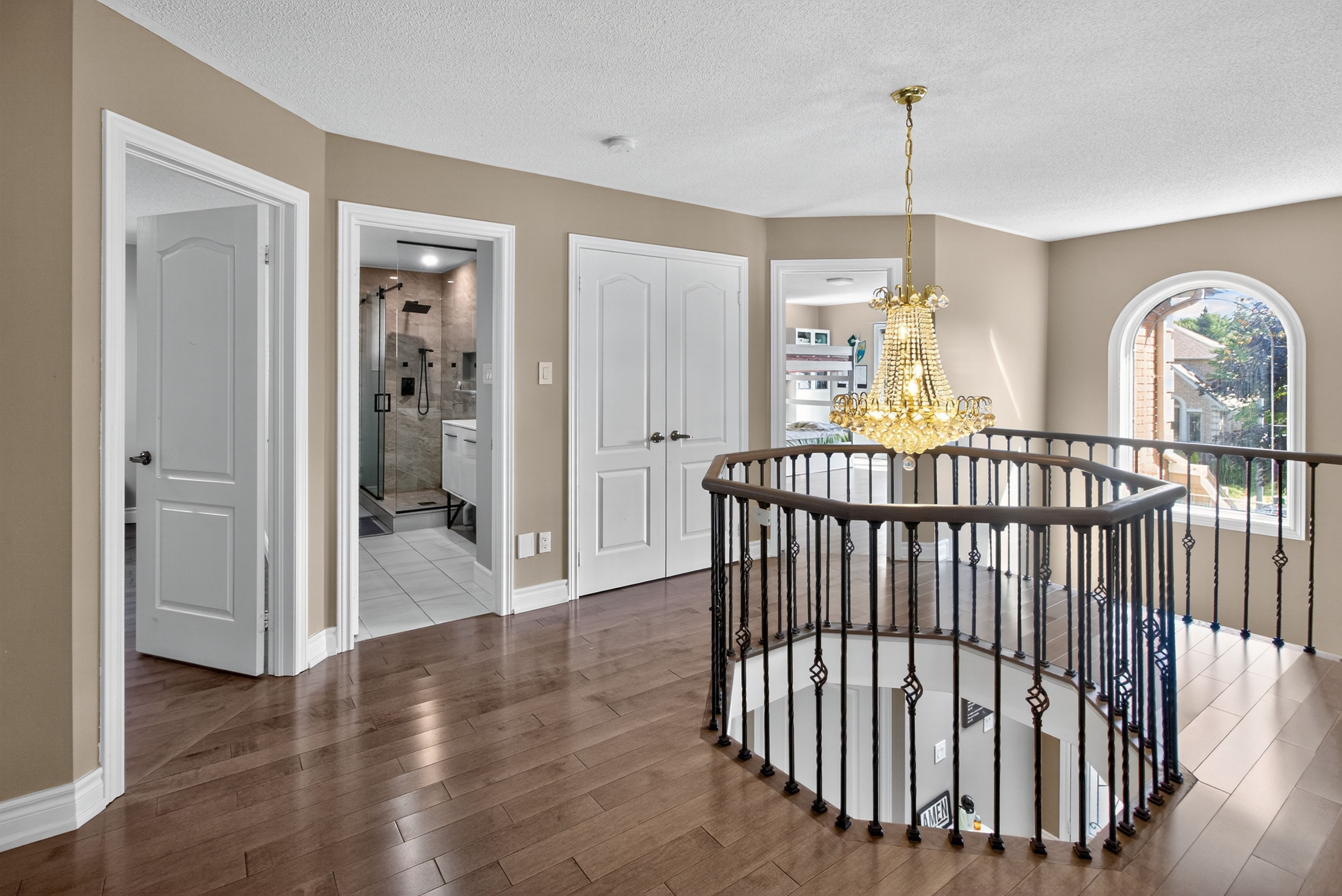Over 3,500 sf elegant detached home on quiet cul-de-sac, above grade with a spectacular 17 circular foyer, grand winding staircase with new wrought-iron pickets, and two crystal chandeliers. Features include hardwood floors, pot lights, and an upgraded chefs kitchen with large island, breakfast bar, wall oven, and multiple pantries. Second floor boasts a new modern master ensuite and renovated baths. All energy-efficient windows and designer crystal lighting throughout.