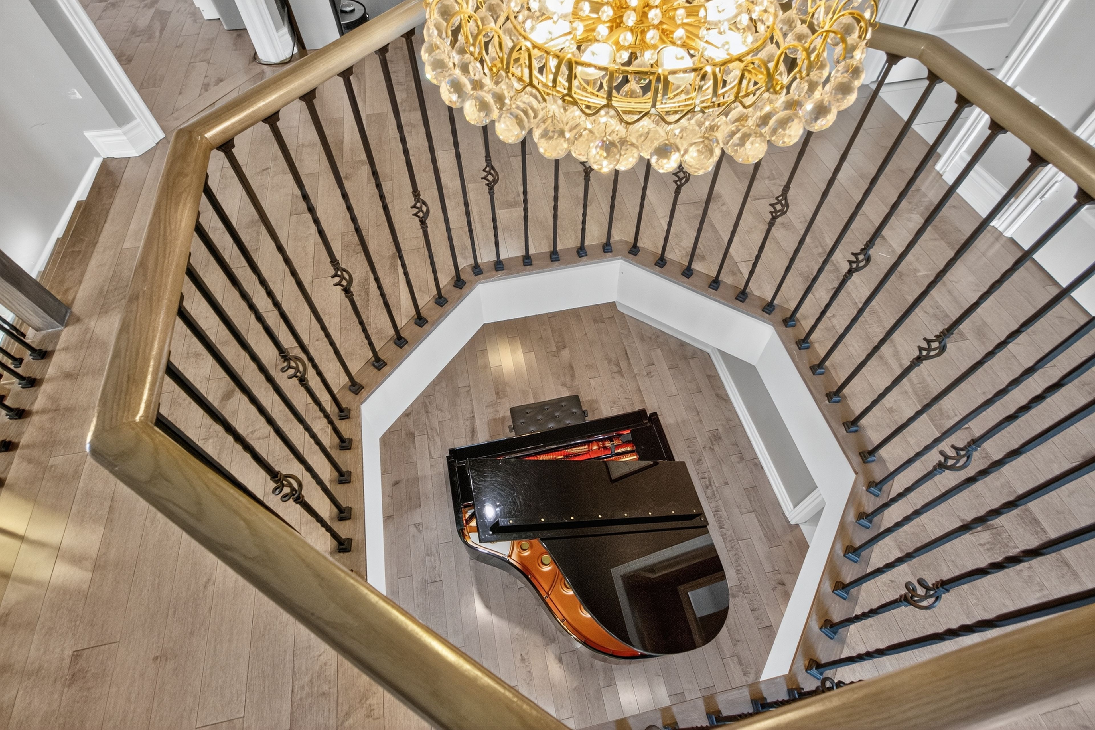 • Impressive circular foyer with a grand winding staircase and chandeliers.