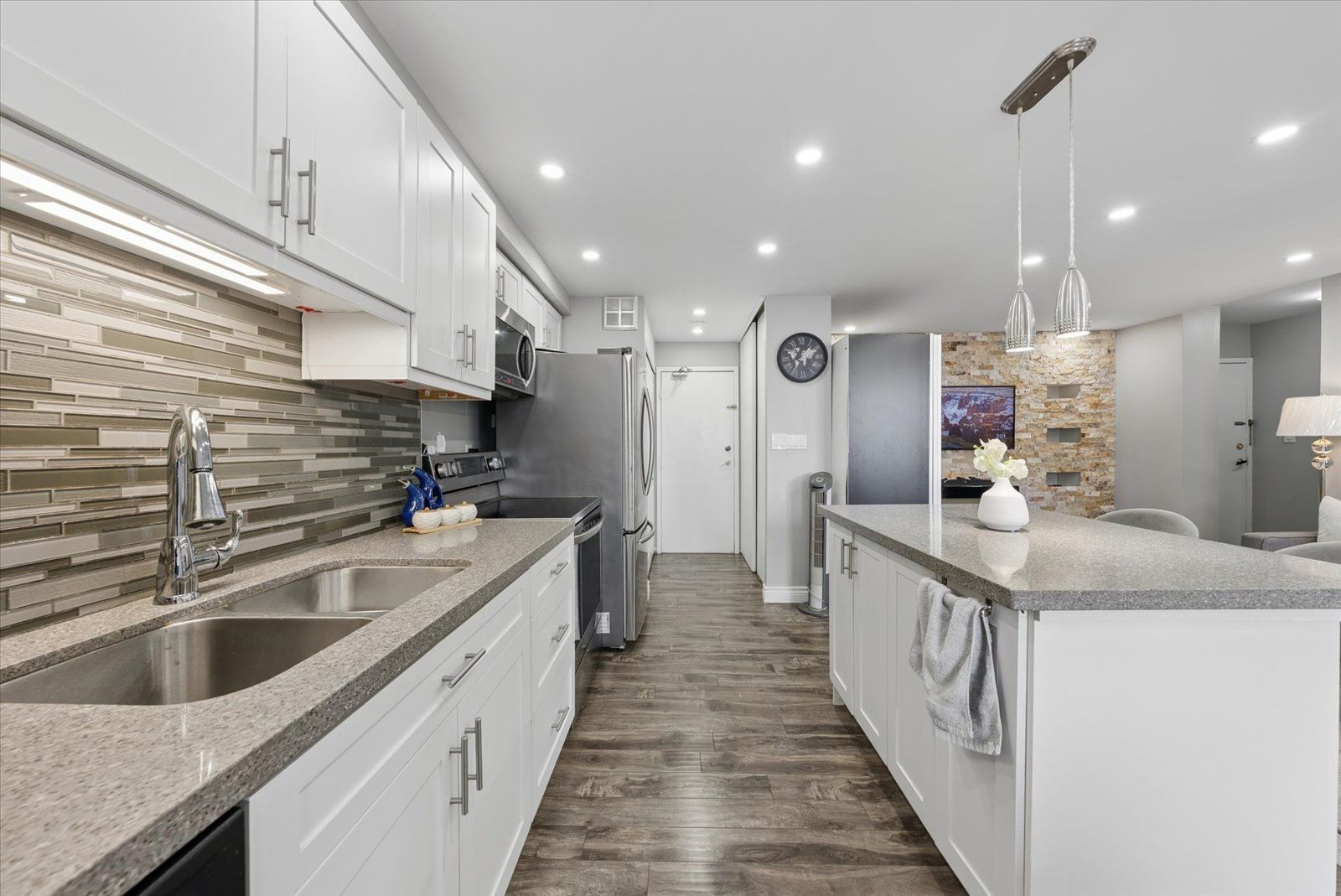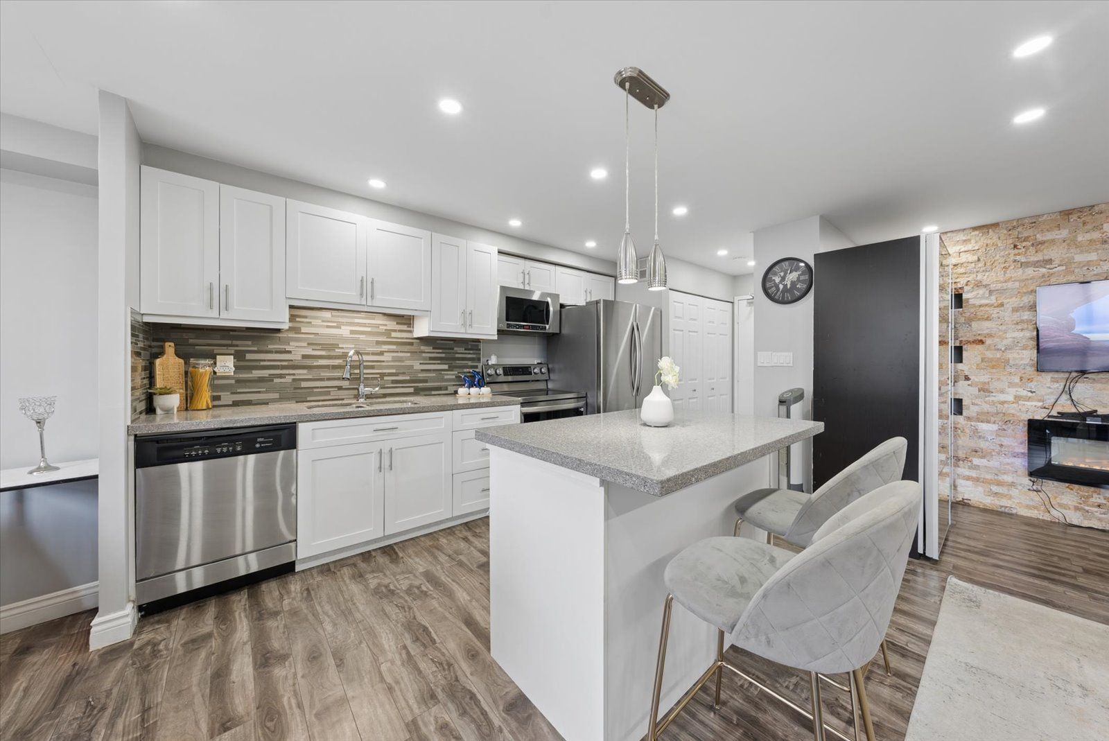 • Upgraded kitchen with modern finishes and a central island for dining.