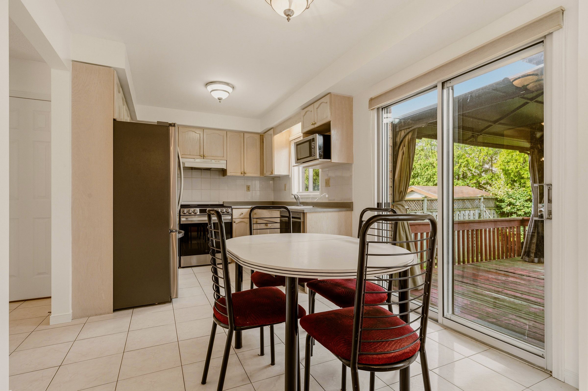 • Well-designed eat-in kitchen with modern appliances and backyard access.