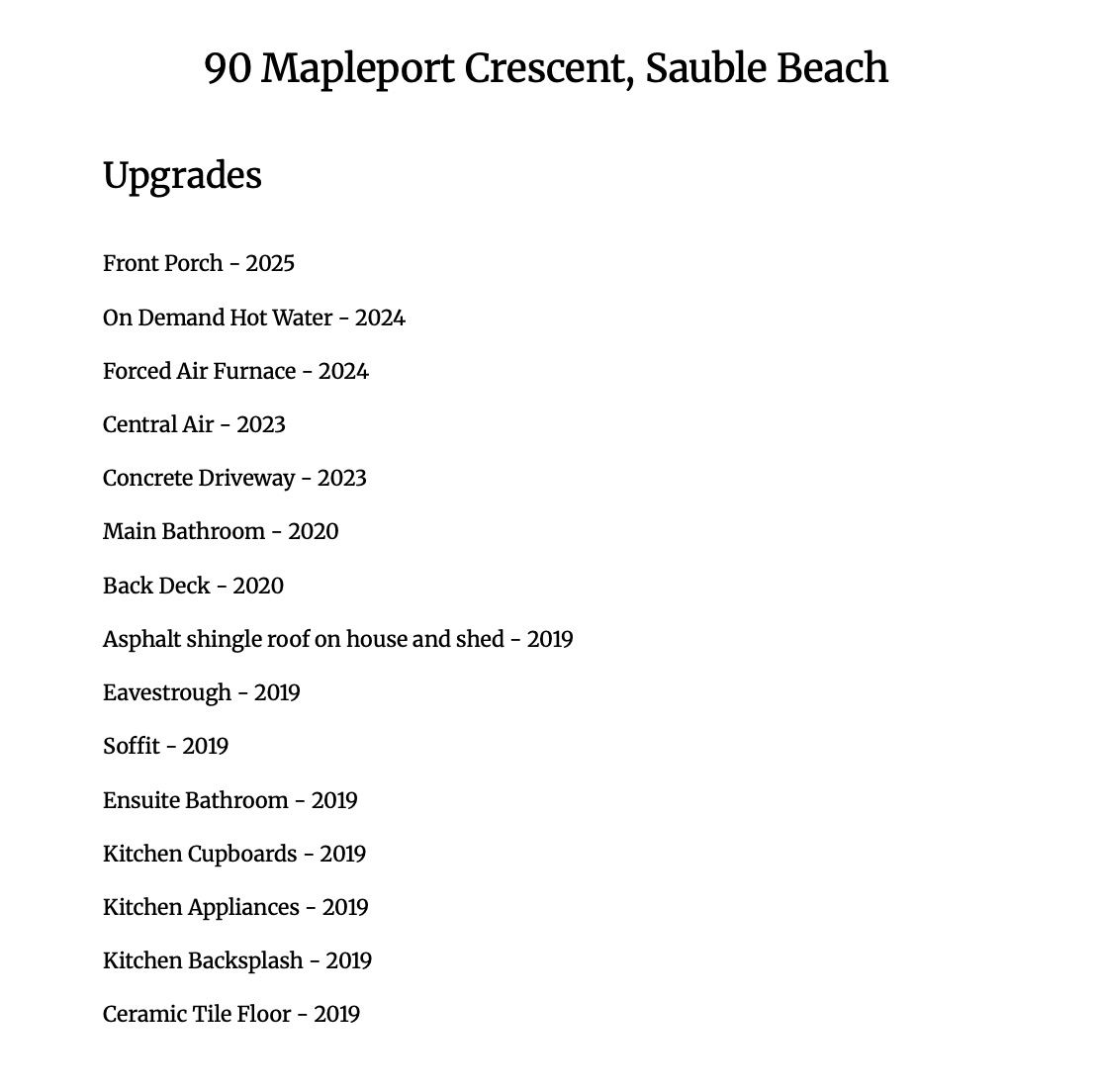 Location is everything and 90 mapleport crescent delivers. This beautifully renovated bungalow is set in the highly sought-after huron woods subdivision, known for its quiet, family-friendly atmosphere that remains peaceful even during peak summer months. The bright and spacious main floor living offers comfort and convenience, complemented by a heated 2-car garage, concrete driveway (2023), and a dedicated 50-amp outlet- perfect for rv hookup or ev charging. Situated on a generous 100ft x 150ft lot surrounded by mature trees, enjoy outdoor living on the large back deck, ideal for summer bbqs or morning coffee. You are just minutes away from the world-famous sands of sauble beach, downtown shops, local hiking trails, and community amenities. Full list of upgrades available.
