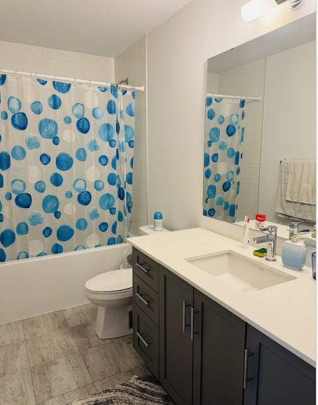 • Stylish kitchen with quartz countertops and stainless steel appliances.