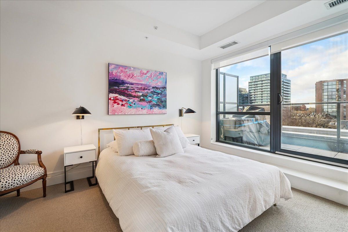 Rare two-storey king west condo with two private terraces. Large windows fill the home with abundant natural light creating a bright and welcoming 882 square feet of living space plus 160 square feet on 2 terraces. Picture your morning coffee on a private terrace while the city quietly wakes up below. The main level features soaring ceilings and an open living and dining area with a well-appointed kitchen, complete with jenn-air appliances and a fisher & paykel refrigerator and a powder room. The living area flows naturally to a private terrace with a gas bbq line-perfect for relaxed outdoor dining. A dedicated home office on the main floor provides a comfortable and practical workspace. Upstairs, the primary bedroom easily accommodates a king-size bed and offers unobstructed northern views along with access to a second private terrace. A professionally customized walk-in closet by simply closets and convenient second-floor laundry add everyday functionality. The locker is on the second floor and parking is for a motorcycle. A quiet boutique building residents enjoy a welcoming building community with a party room, bar, expansive outdoor terrace, tv and barbeque. Steps to king west restaurants, groceries, parks, 2 ttc street car access, the future ontario line at king & bathurst nearby and billy bishop airport is within walking distance.