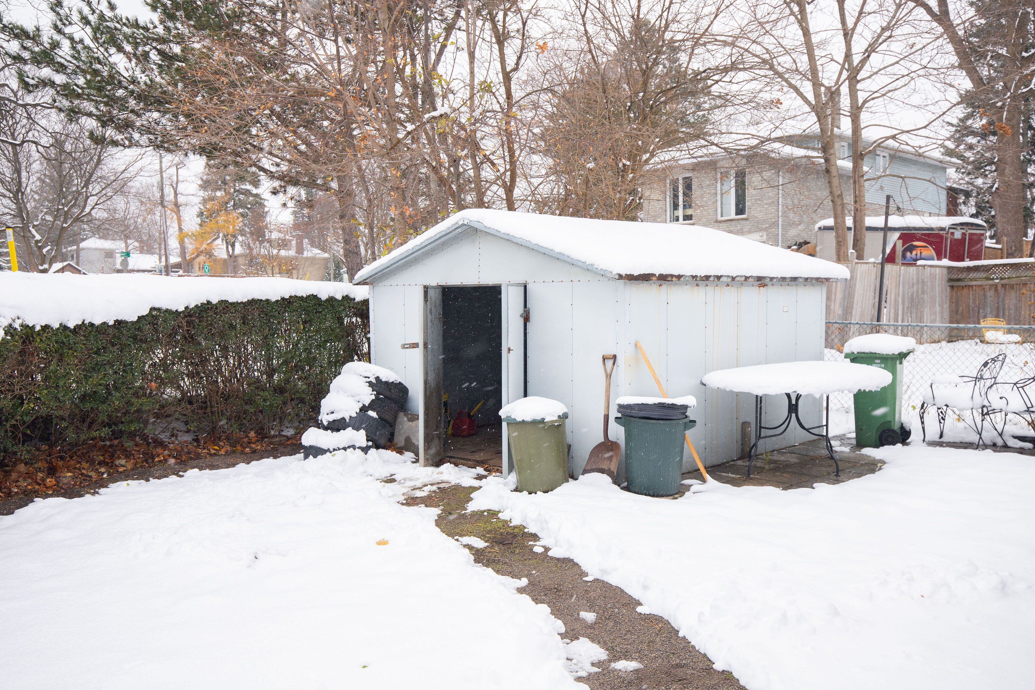 • Includes a detached garage and large shed for additional storage.