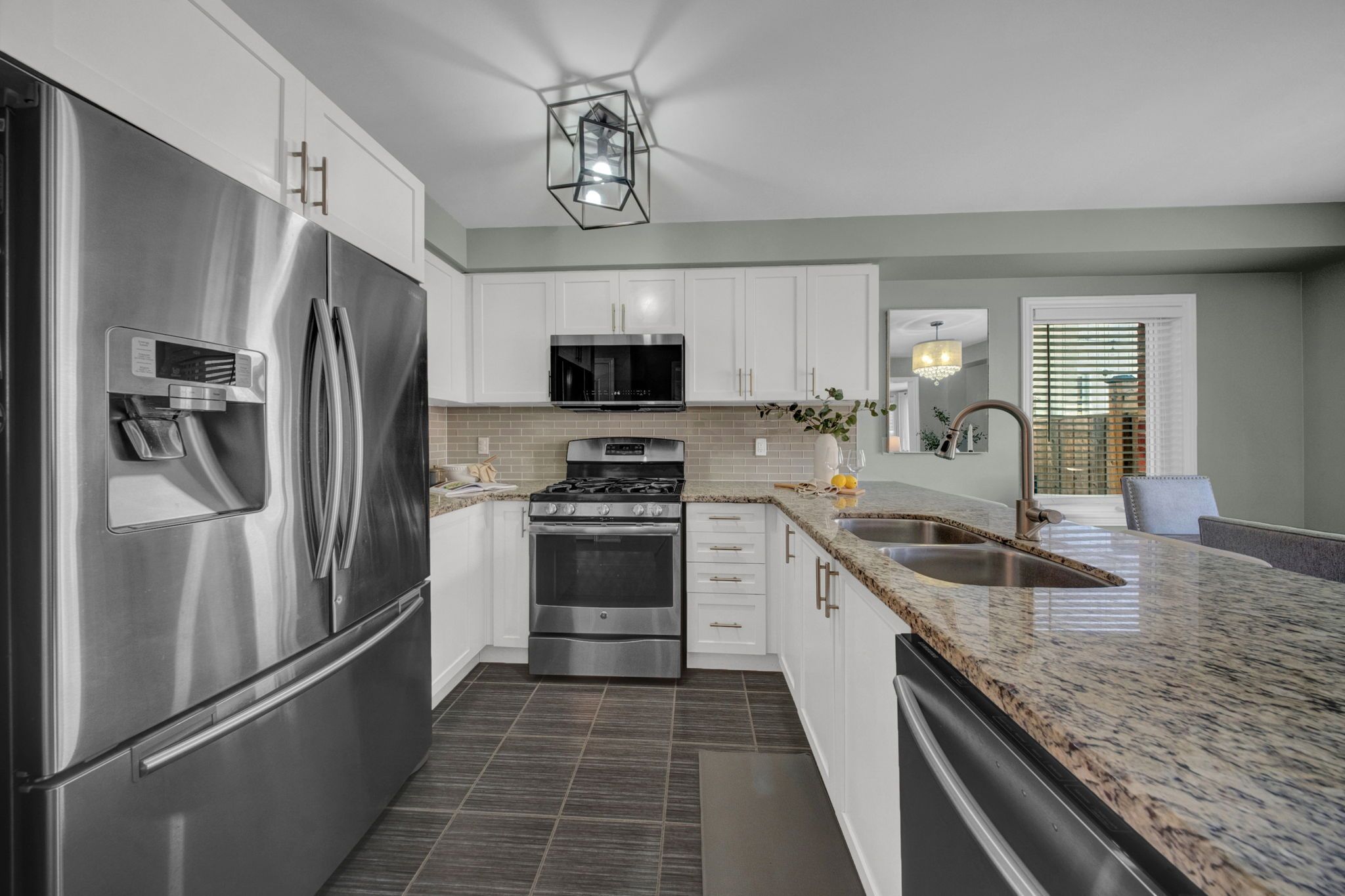 • Stylish kitchen with granite counters, stainless steel appliances, and gas range.