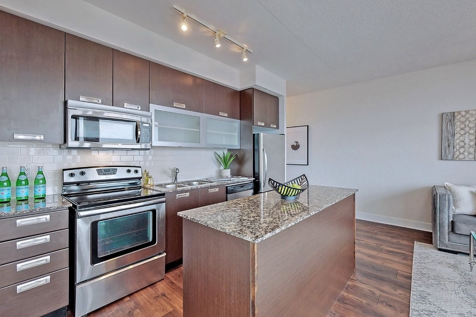 • Open concept modern kitchen with a center island.