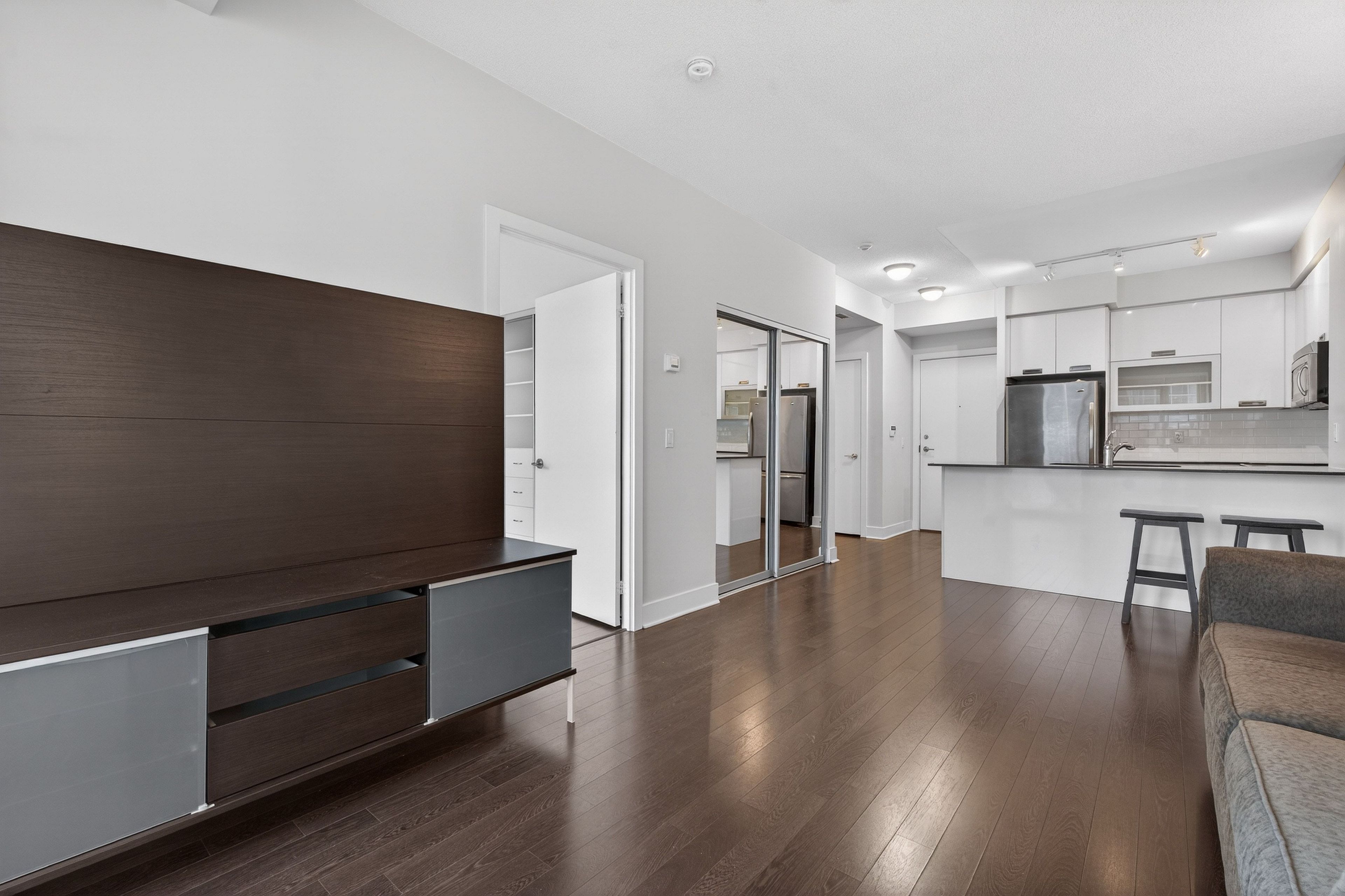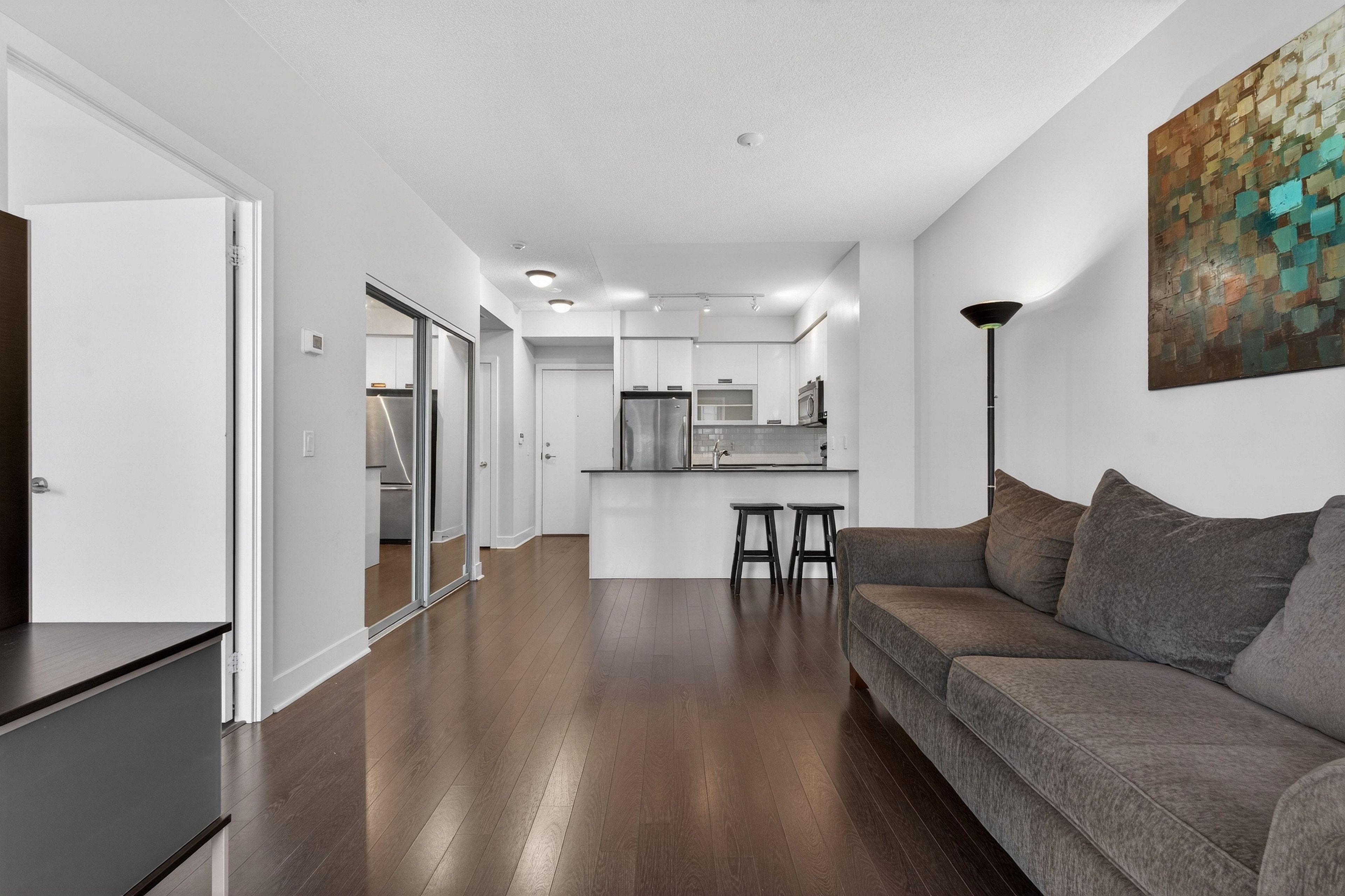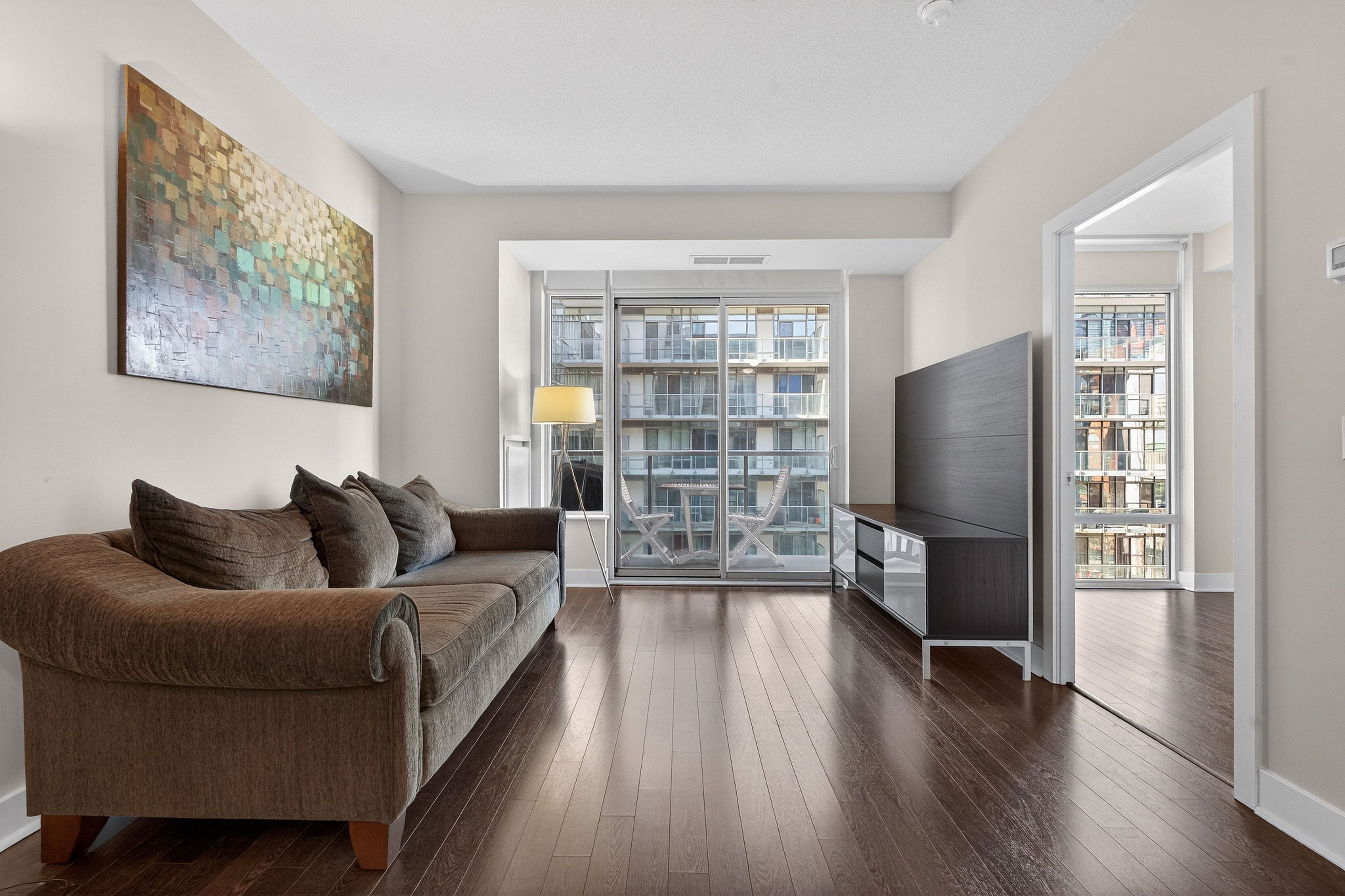 Live where toronto wakes up right at quay west condos, a boutique mid-rise perfectly positioned along the waterfront in marina quay west. This rarely available 1+den features a highly functional layout with a separate den ideal for a dedicated work-from-home setup, complemented by an open-concept living space and a full kitchen with ample counter space for everyday use and entertaining. Step outside to direct access to the lakefront trail and coronation park, offering an unmatched lifestyle of morning runs, waterfront walks, and everyday escape from the city noise. Enjoy the added convenience of generous closet storage throughout, a rare find in condo living. Experience a quieter, boutique environment without the congestion of high-rise buildings, while still having access to premium amenities including a fully equipped gym, spa, sauna, whirlpool, co-working lounge, theatre room, party room, and guest suites. Opportunities to lease in this waterfront building are limited, making this an ideal option for stable tenants seeking a refined waterfront lifestyle with space, function, and convenience. Landlord is open to a 2-year lease for strong tenants. The couch, lamps, bar stools, shelving, and tv stand can also be included partially furnished for your convenience.