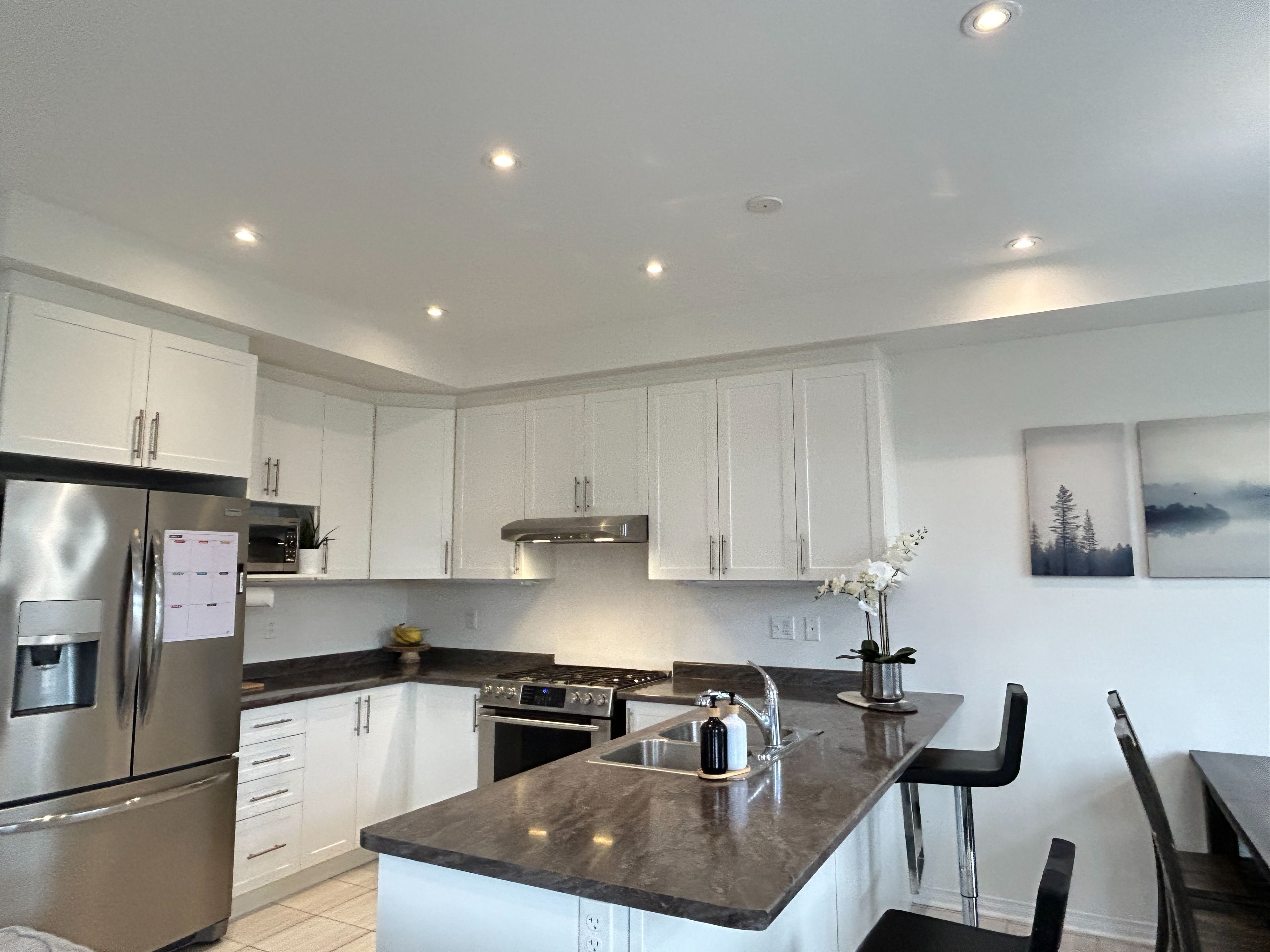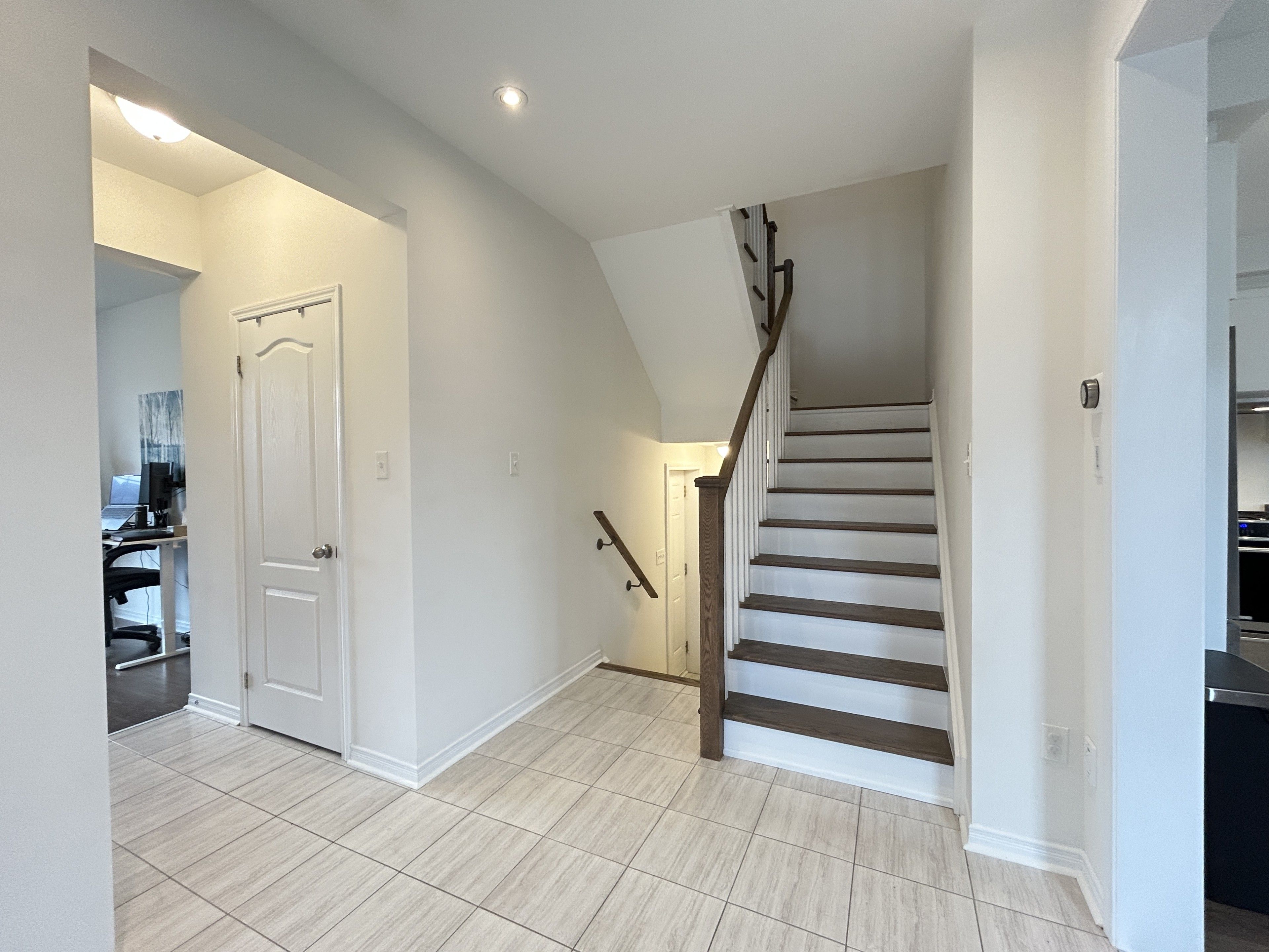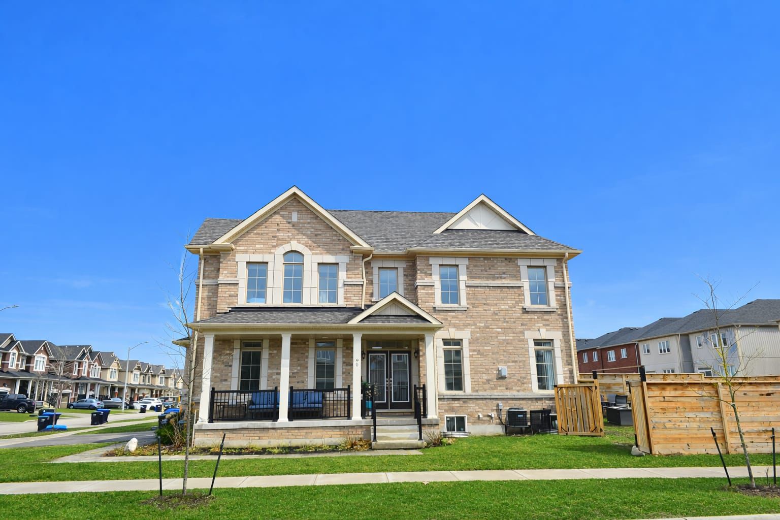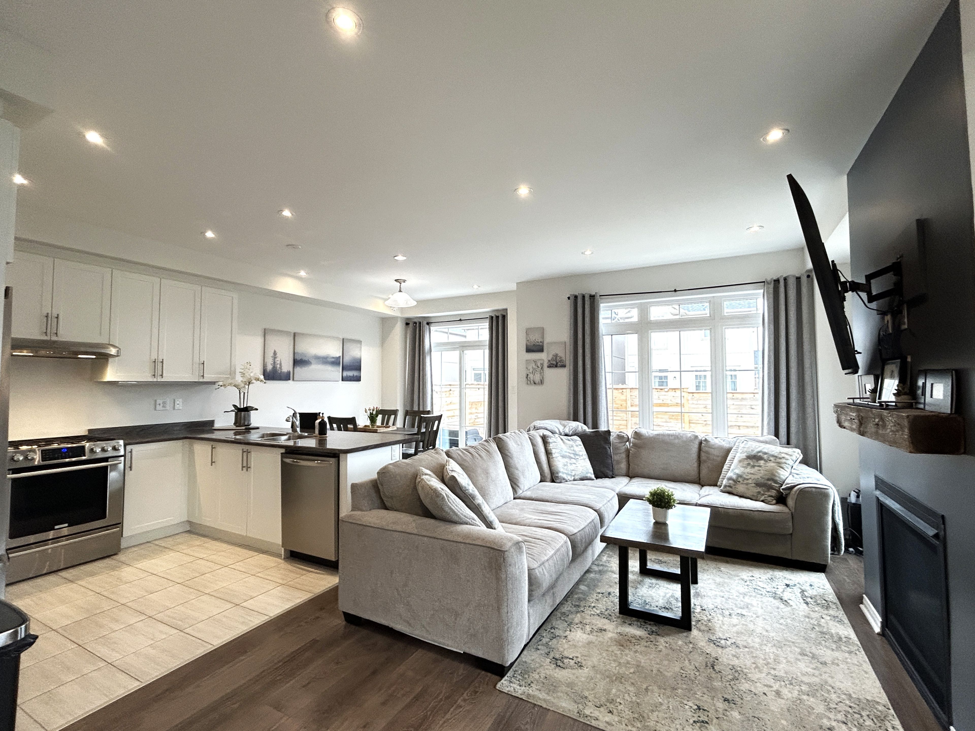 Welcome to 90 tracey lane, a stunning 3-bedroom, 3 bath home, that hits all the high notes for a family home nestled in collingwood's highly sought-after admiral school district. Bathed in natural light from oversized windows on 3 sides, this home glows from sunrise to sunset. This freehold townhome is unique in that it is only attached to the neighbouring property at the garage, meaning no direct interior wall connection, providing more privacy and quietness. Step through the double front doors into a spacious, tiled foyer designed for effortless family transitions. The heart of the home is a bright, open-concept, featuring a living room featuring stylish vinyl flooring and a cozy gas fireplace. The kitchen is a chef's delight, boasting stainless steel appliances, double sinks, plenty of counter space and breakfast bar. The dedicated dining area offers sliding glass doors leading you to a fully fenced backyard, your private oasis to enjoy spectacular sunsets and fun filled family times. The main floor highlights a versatile bonus room perfect for home office or den, a convenient powder room and large front hall closet. Direct interior access to the single-car garage. The upper-level retreat features an oversized primary suite. A true sanctuary with a walk-in closet and a spa-like 4-piece ensuite featuring a standalone soaking tub and frameless glass shower. Two additional spacious bedrooms featuring large window space with the second bedroom showcasing a dramatic cathedral ceiling window plus a side window and extra-large closet. The lower level offers a laundry area and a generous, unfinished footprint-a blank canvas ready for your custom basement design. 9' ceilings throughout both main and second floors, 8' in lower level, central vac, gas bbq hook up. A generous corner end lot, in a newer development, walking distance to public schools and high schools, minutes to downtown collingwood, parks and trails and a short drive to blue mountain.