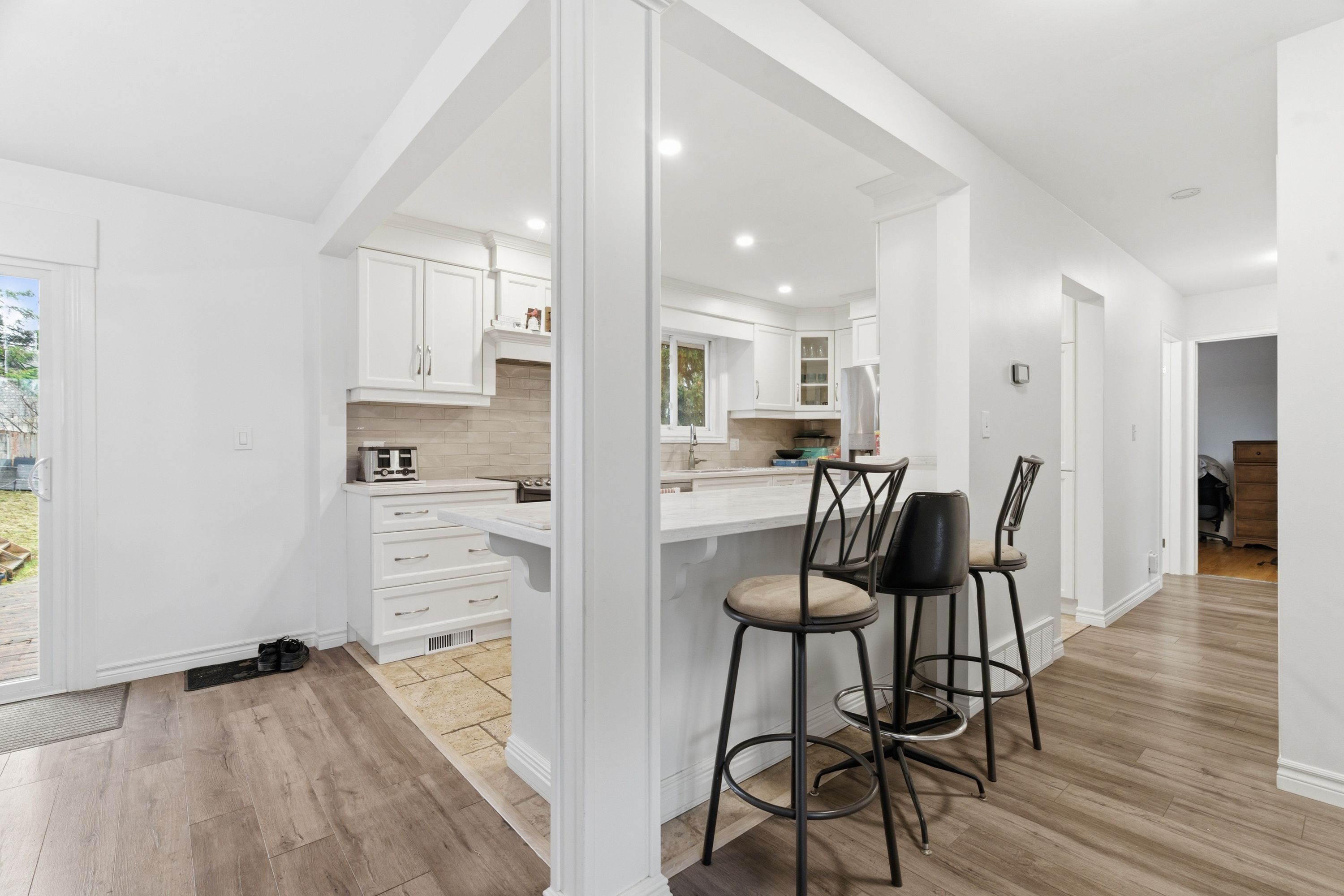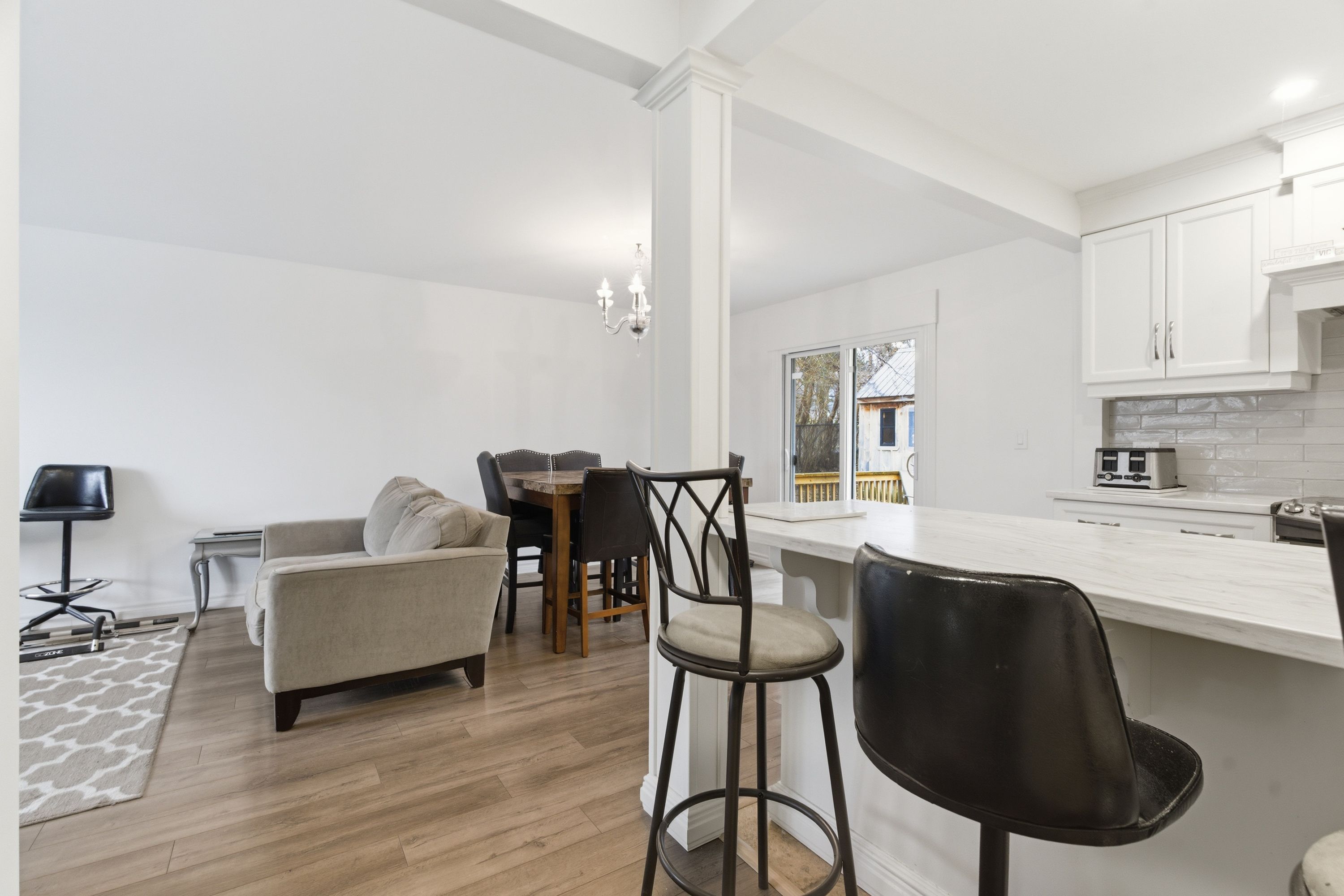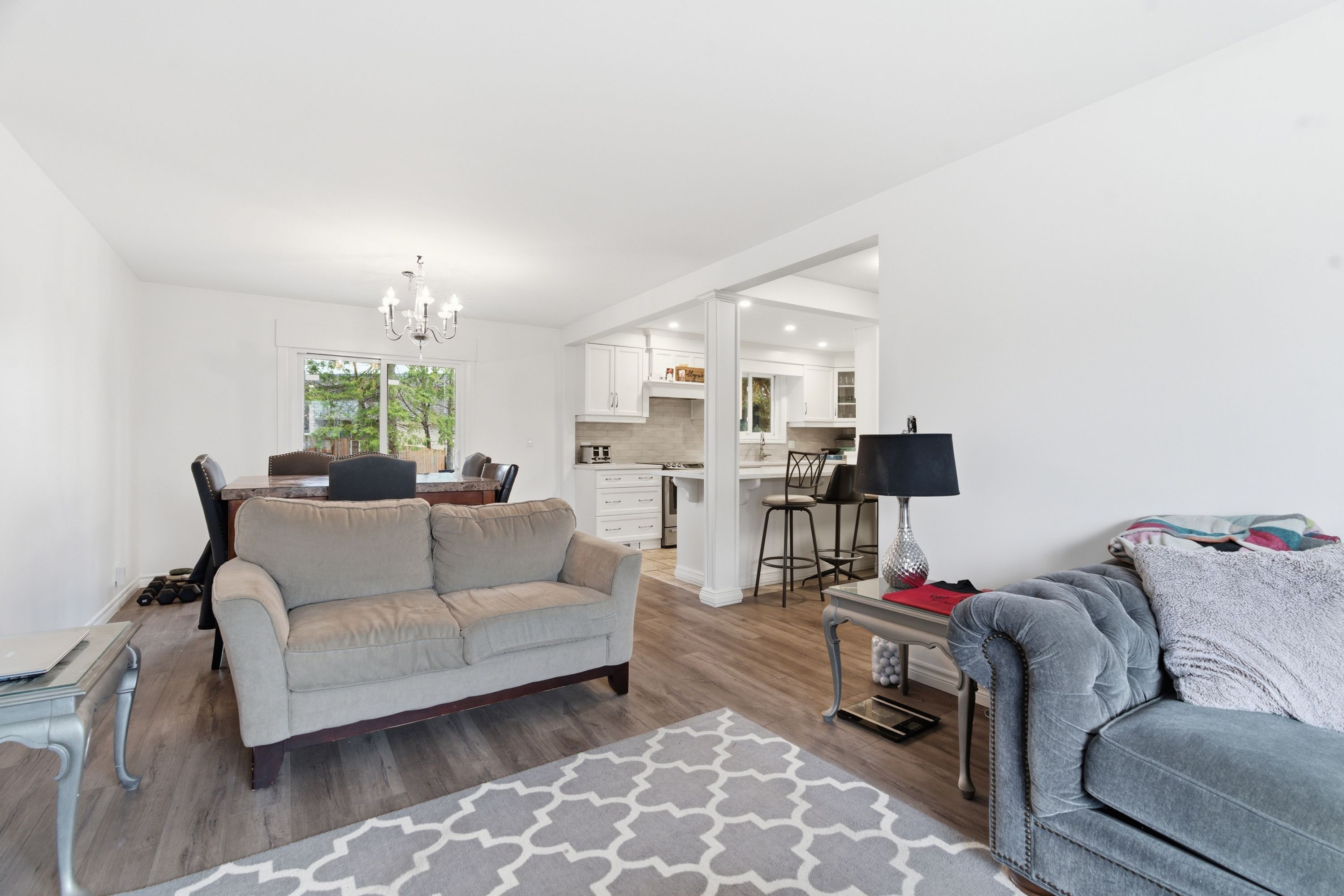 • Updated modern kitchen with an open concept living area.
