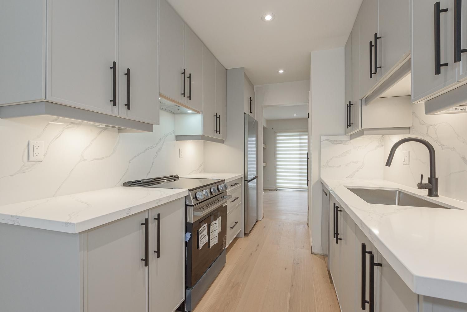 • New kitchen features quartz countertops and built-in pantry.
