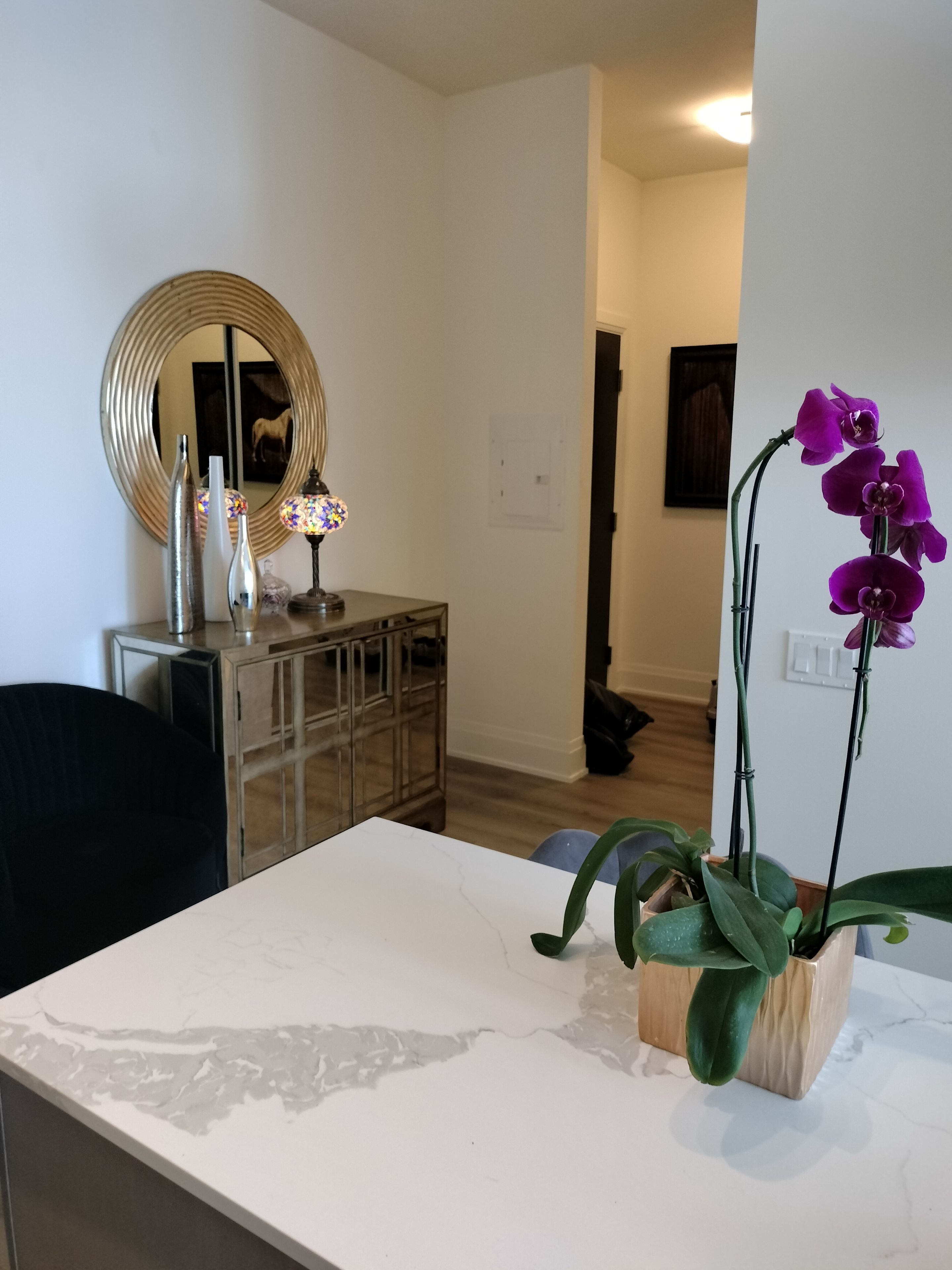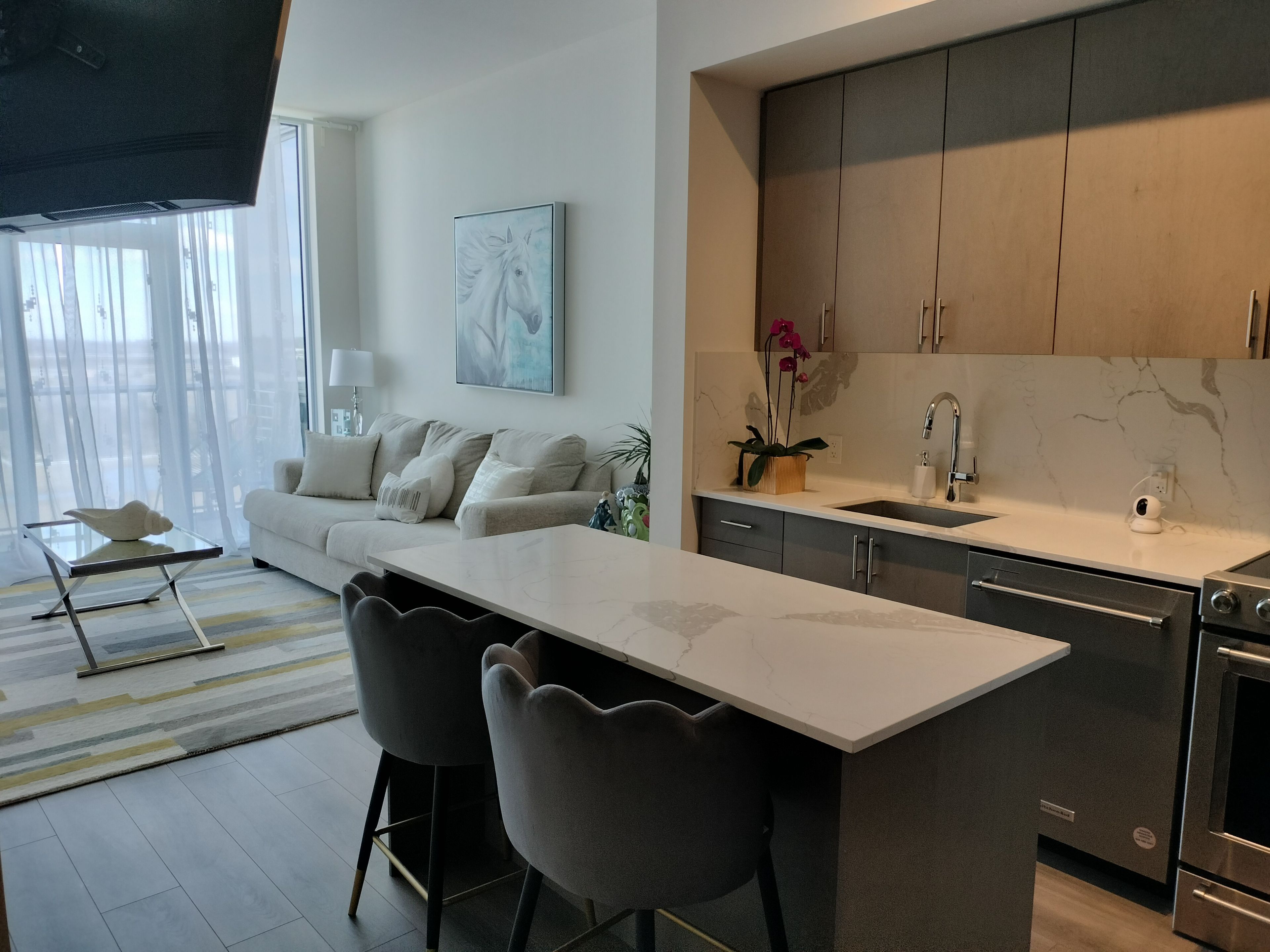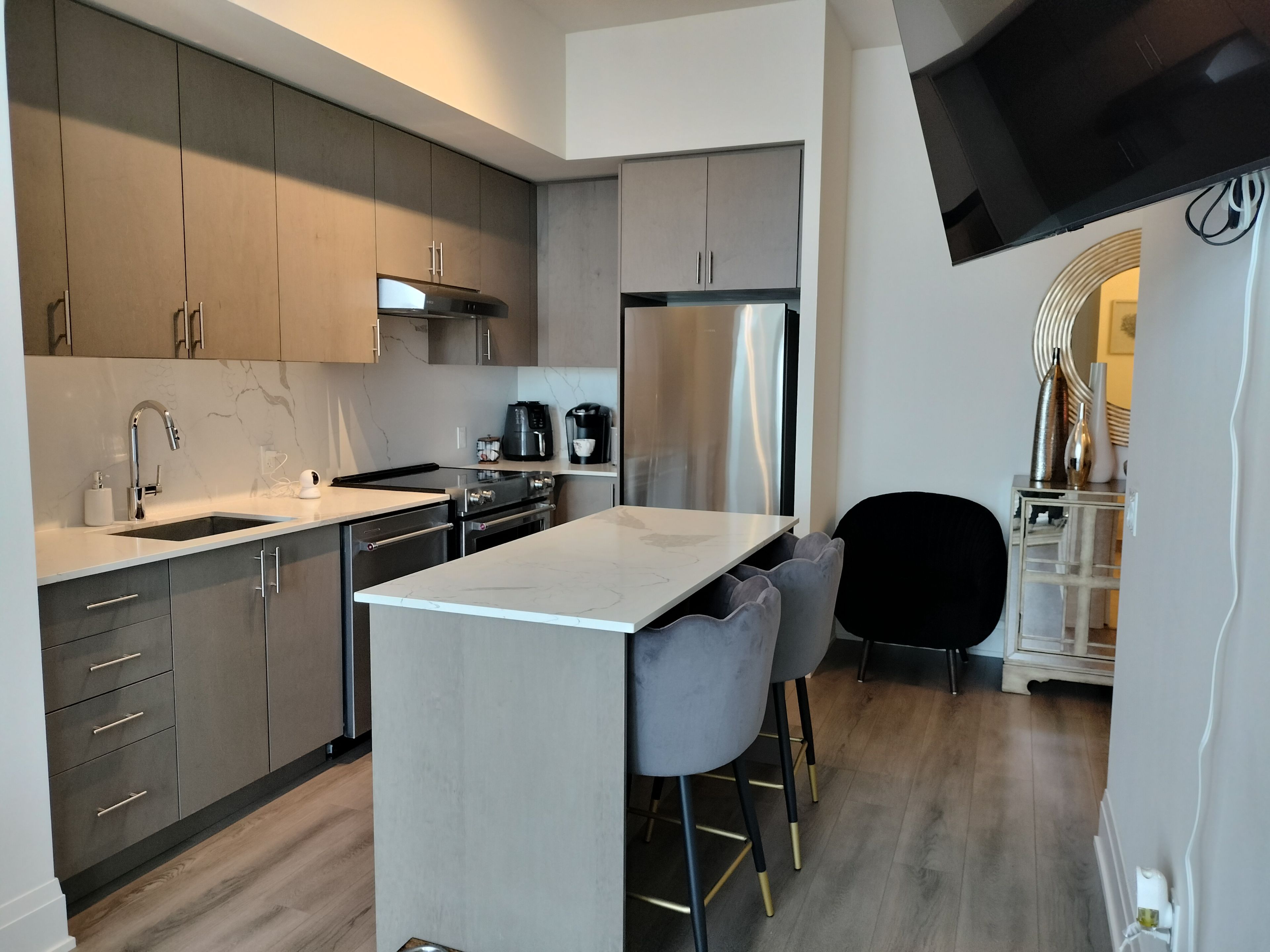 • Modern kitchen featuring quartz countertops and stainless steel appliances.