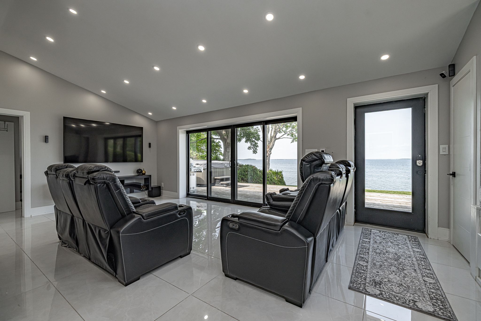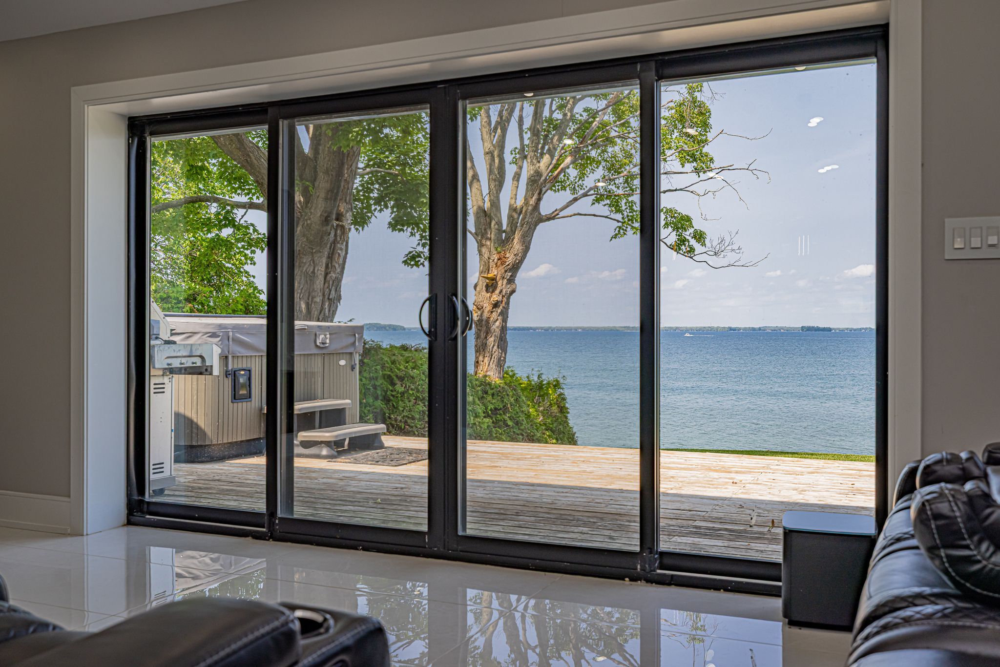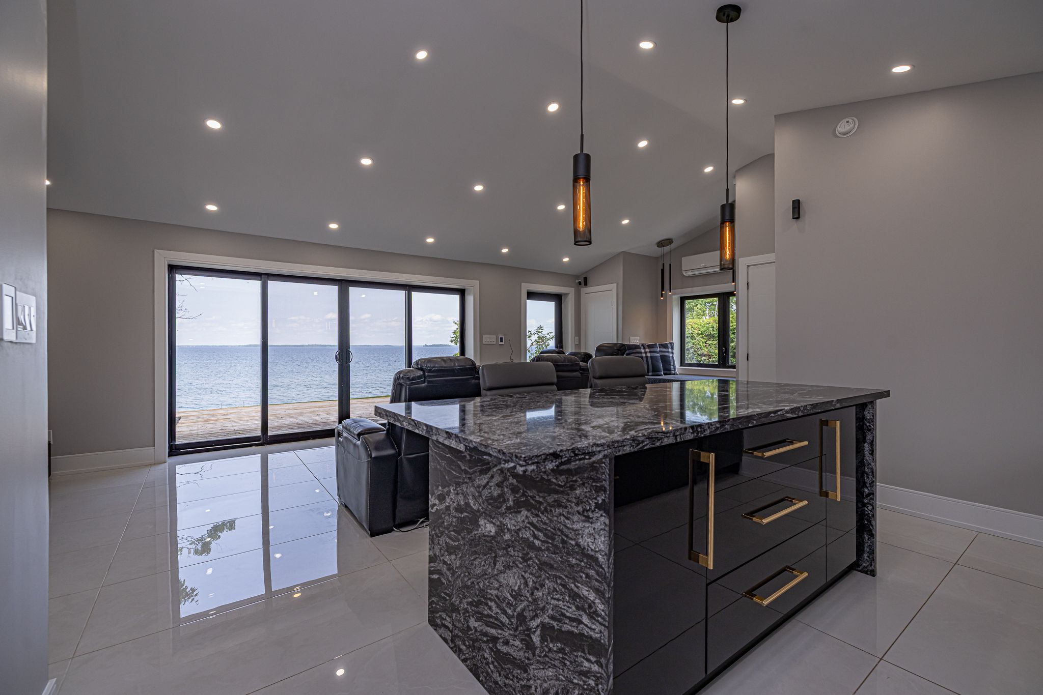 Stunning waterfront, air conditioned, home with vaulted ceiling on a spacious lot with breathtaking panoramic views! This beautifully finished property features vaulted ceilings, new windows and wide triple-pane sliding doors that flood the space with natural light and highlight the spectacular scenery. The gourmet kitchen is a chef's dream with granite countertop island and high-end appliances. The elegant bathroom boasts a modern glass shower while heated, premium porcelain flooring runs throughout the home for year-round comfort. Enjoy cozy evening and entertaining guests in the bright living spaces or step outside to soak in the hot tub or relax in the wide waterfront sitting area. This home combines luxury, comfort, and lifestyle for seasonal and everyday living.