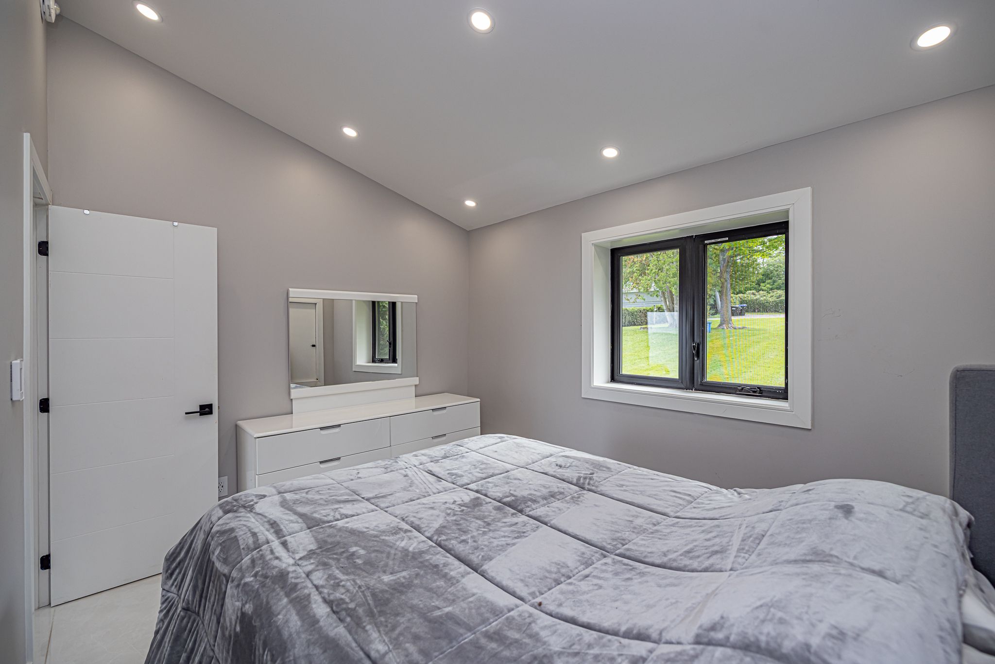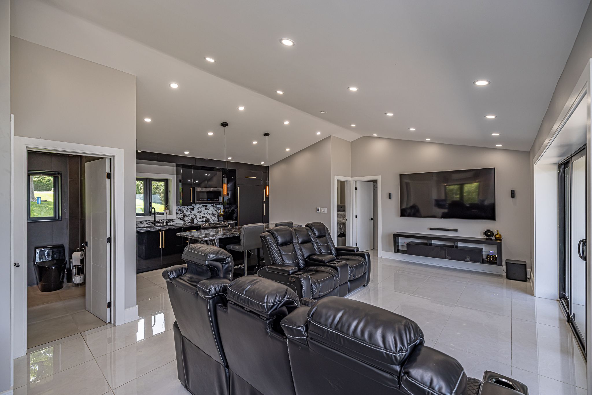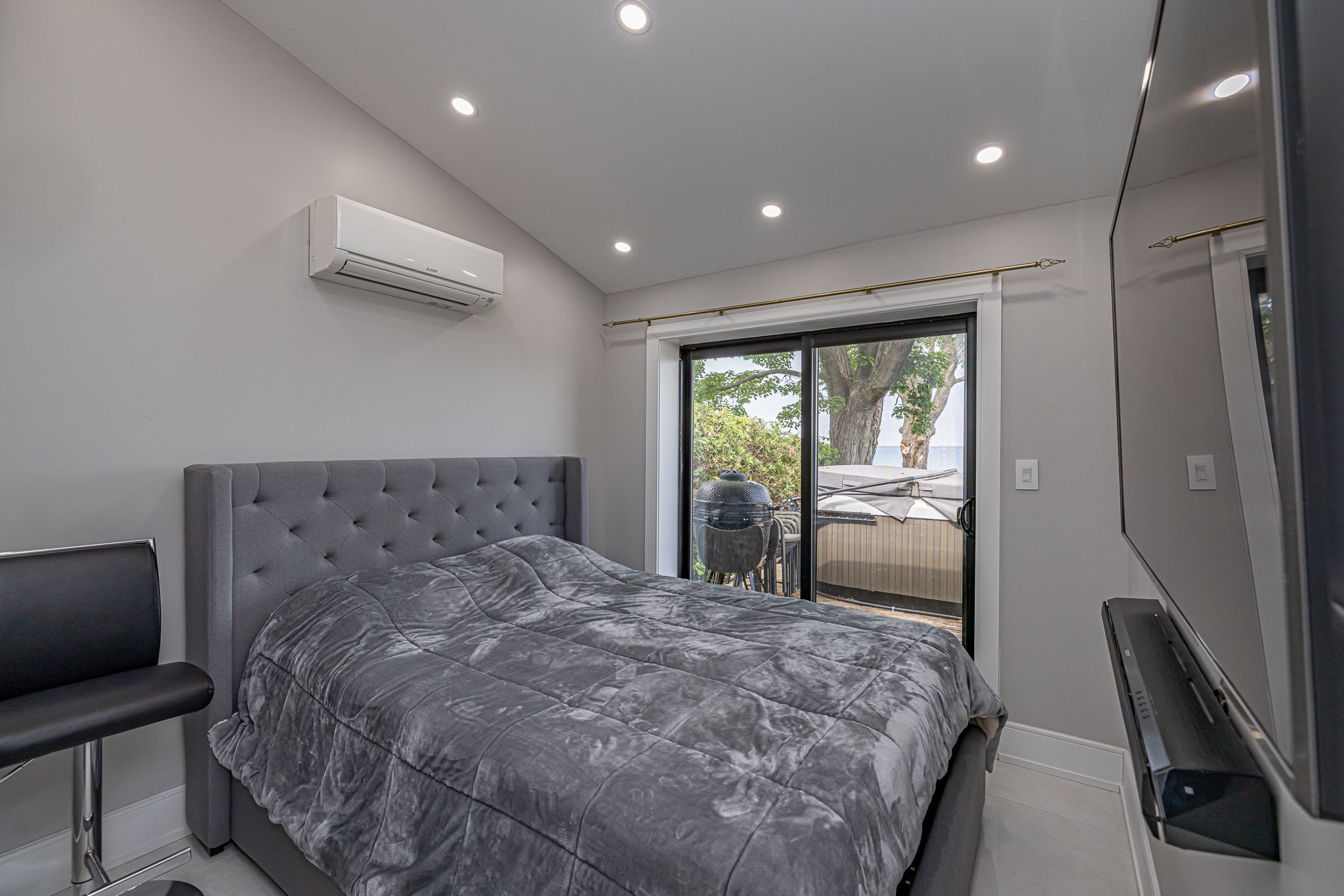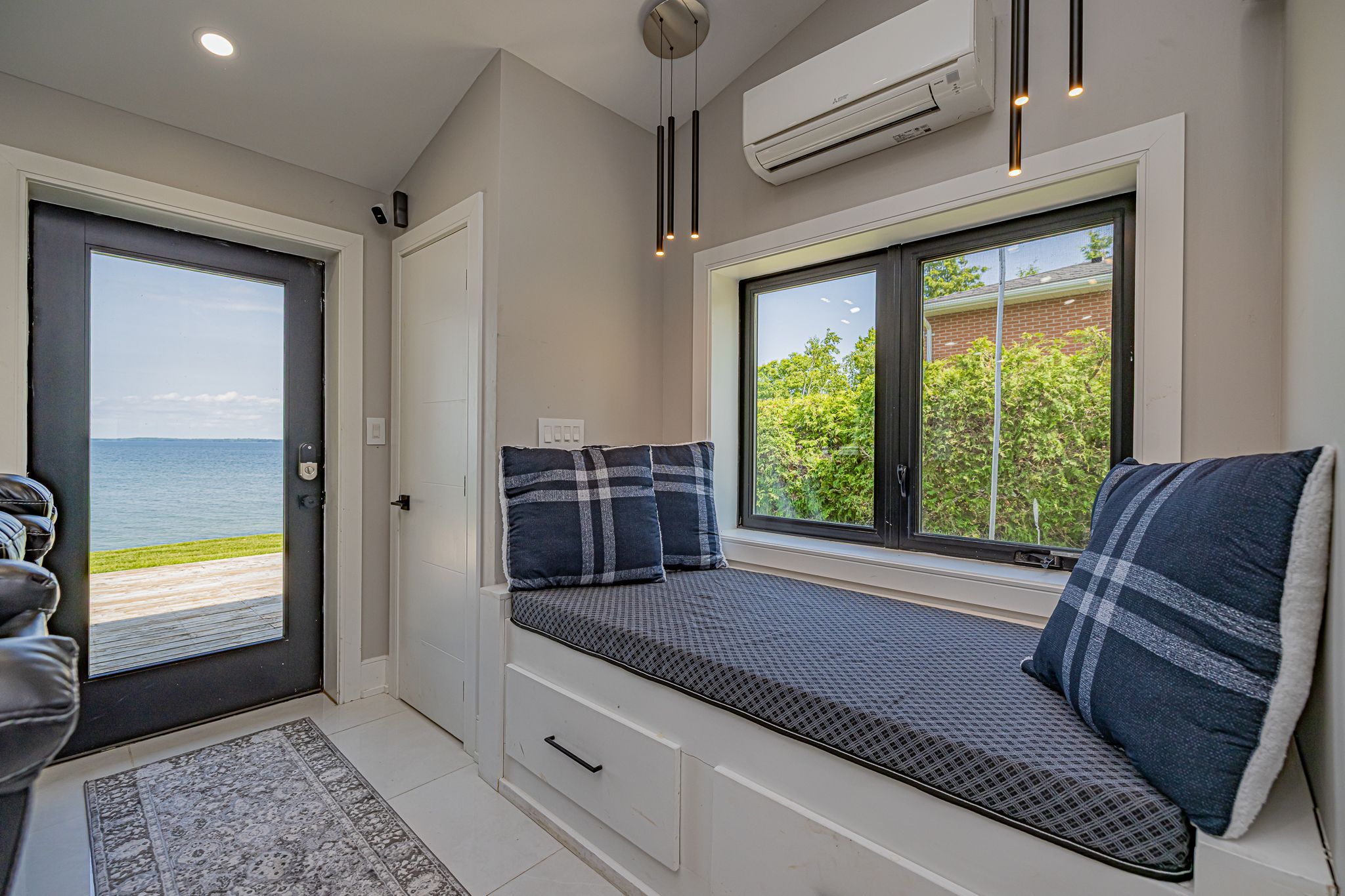 Stunning waterfront, air conditioned, home with vaulted ceiling on a spacious lot with breathtaking panoramic views! This beautifully finished property features vaulted ceilings, new windows and wide triple-pane sliding doors that flood the space with natural light and highlight the spectacular scenery. The gourmet kitchen is a chef's dream with granite countertop island and high-end appliances. The elegant bathroom boasts a modern glass shower while heated, premium porcelain flooring runs throughout the home for year-round comfort. Enjoy cozy evening and entertaining guests in the bright living spaces or step outside to soak in the hot tub or relax in the wide waterfront sitting area. This home combines luxury, comfort, and lifestyle for seasonal and everyday living.