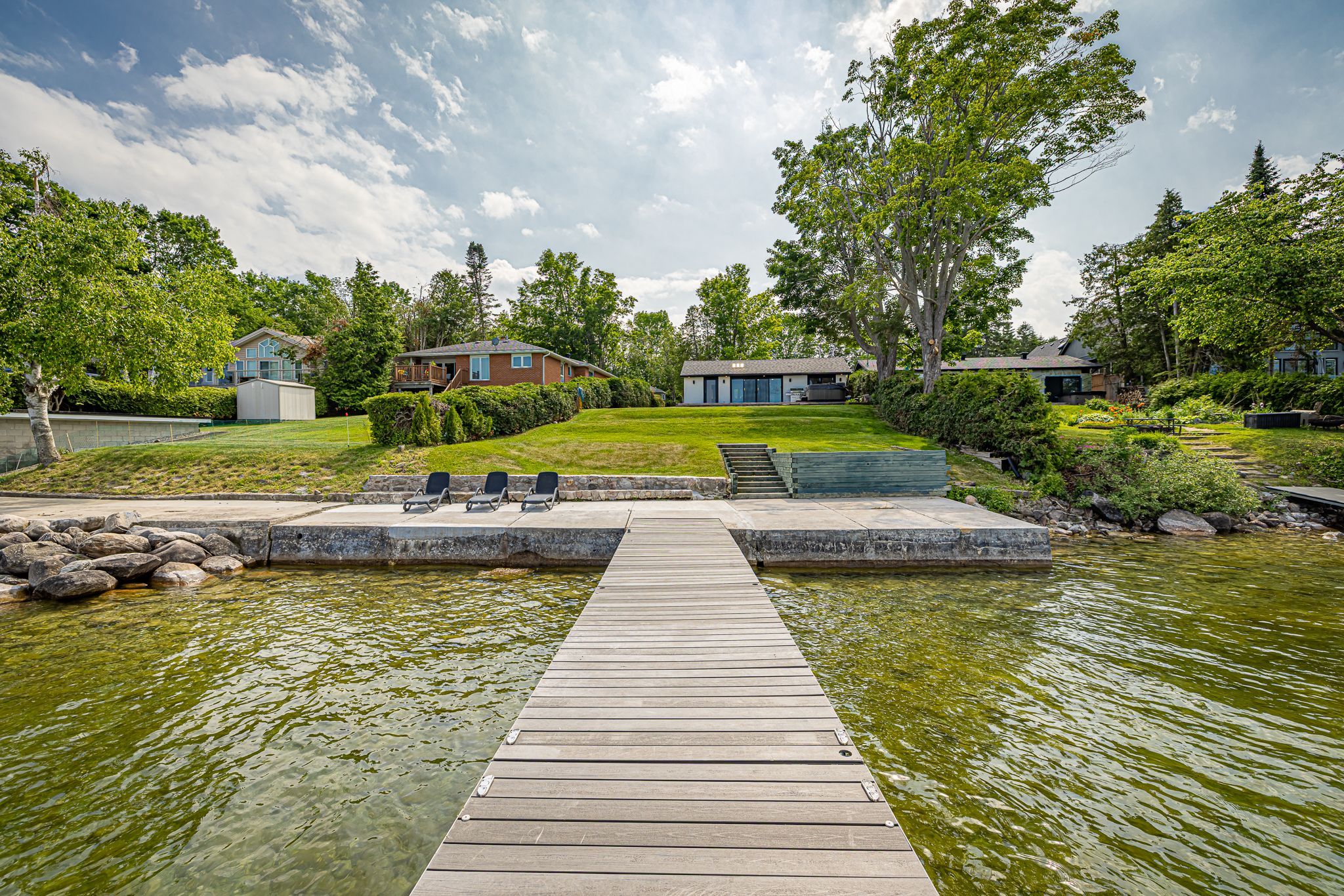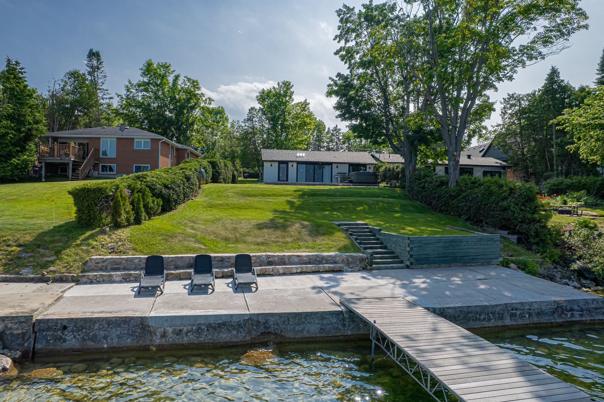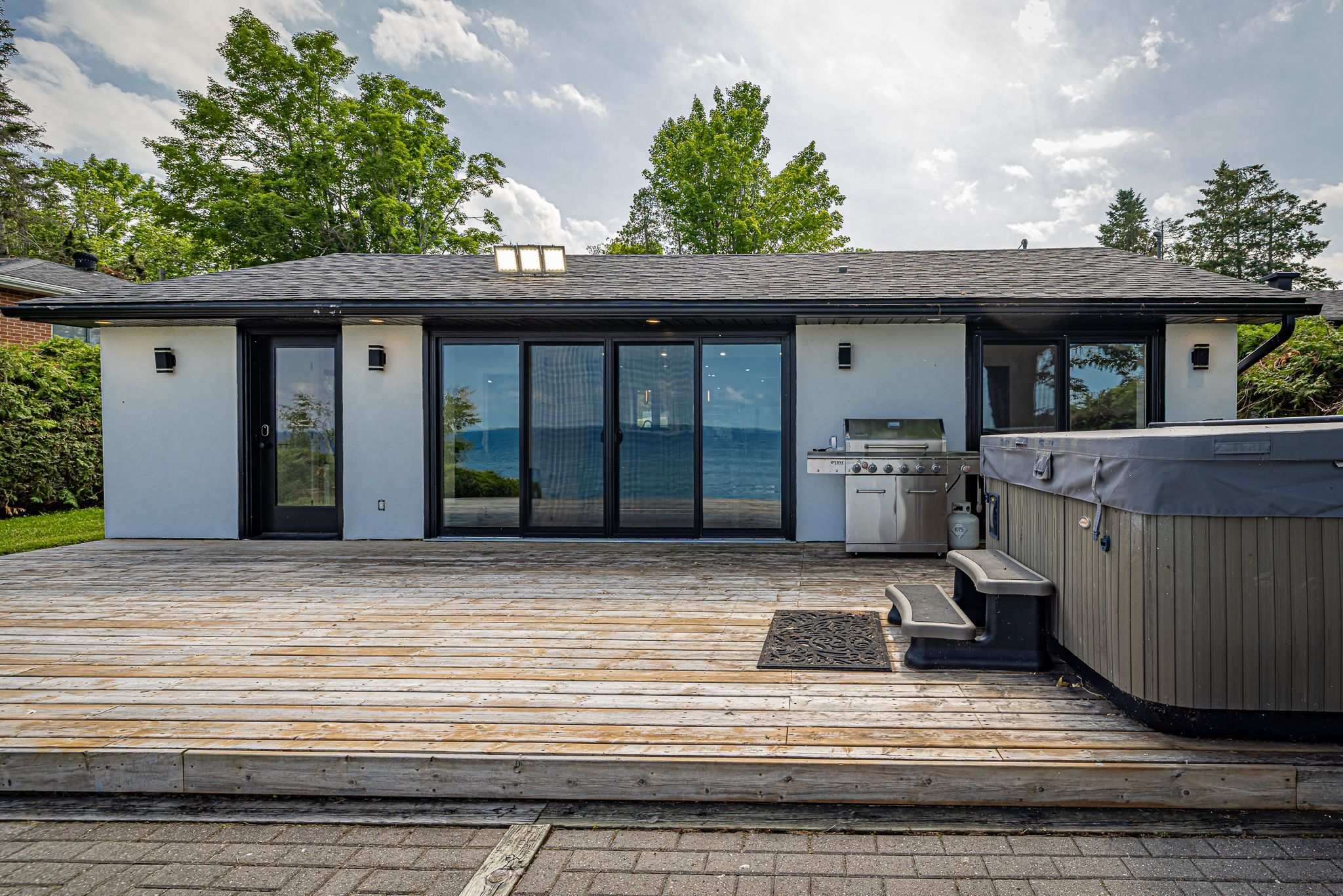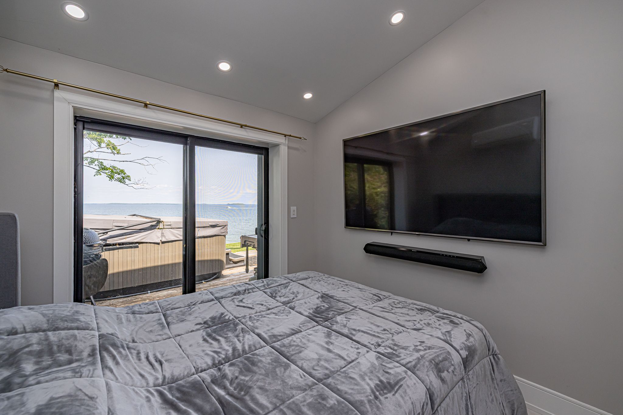 • Spacious lot with outdoor hot tub and waterfront sitting area.