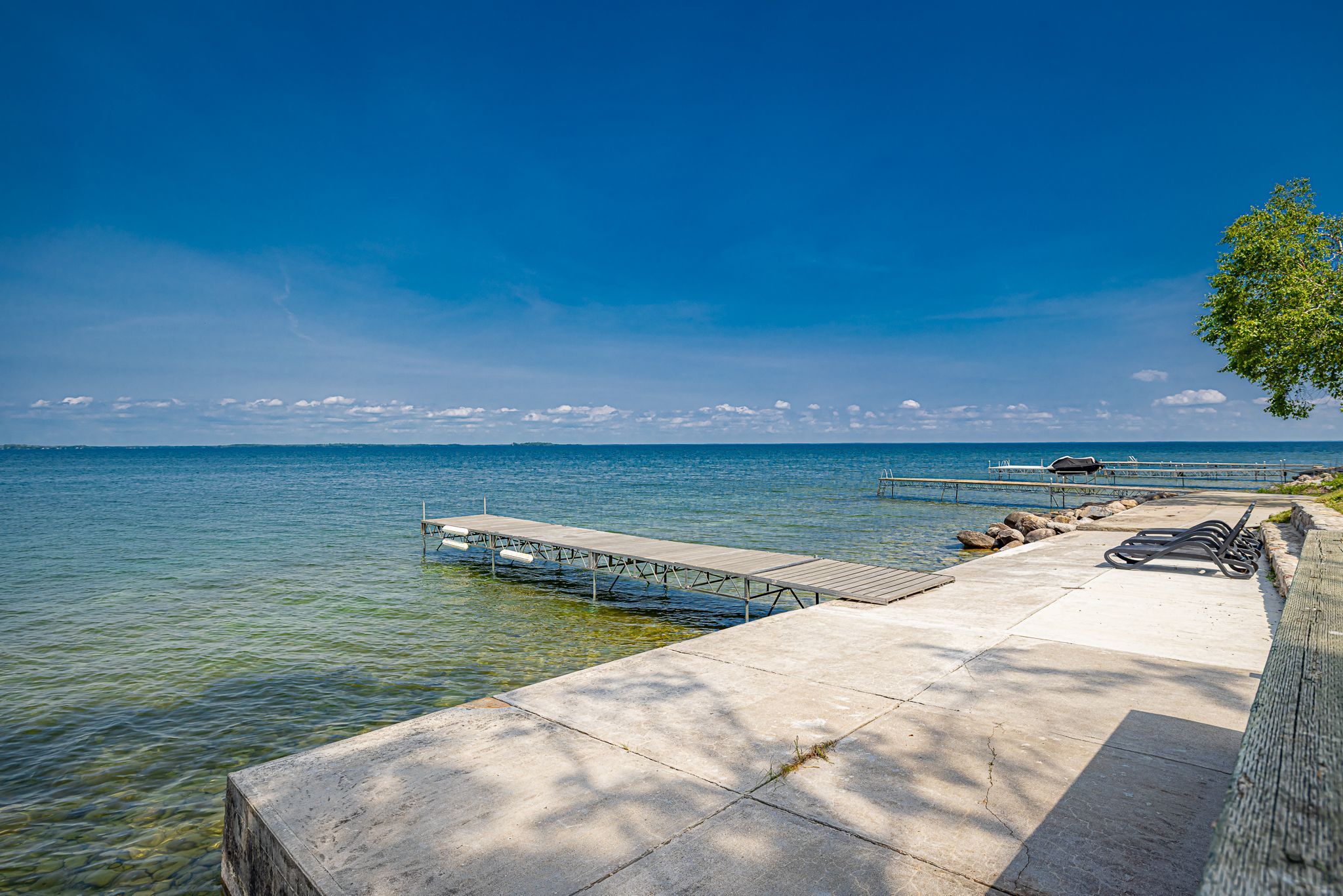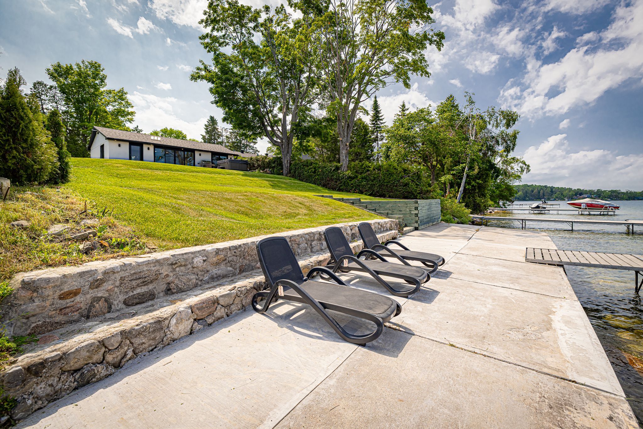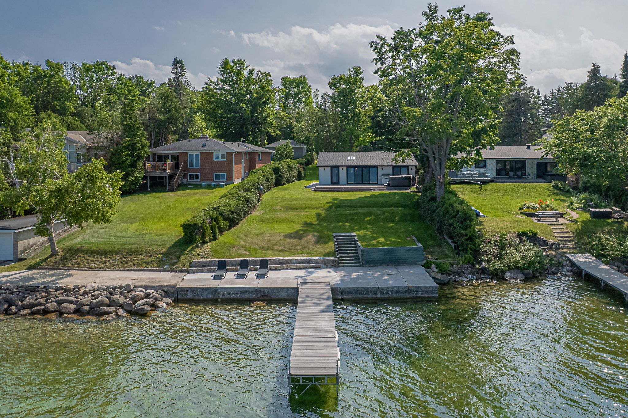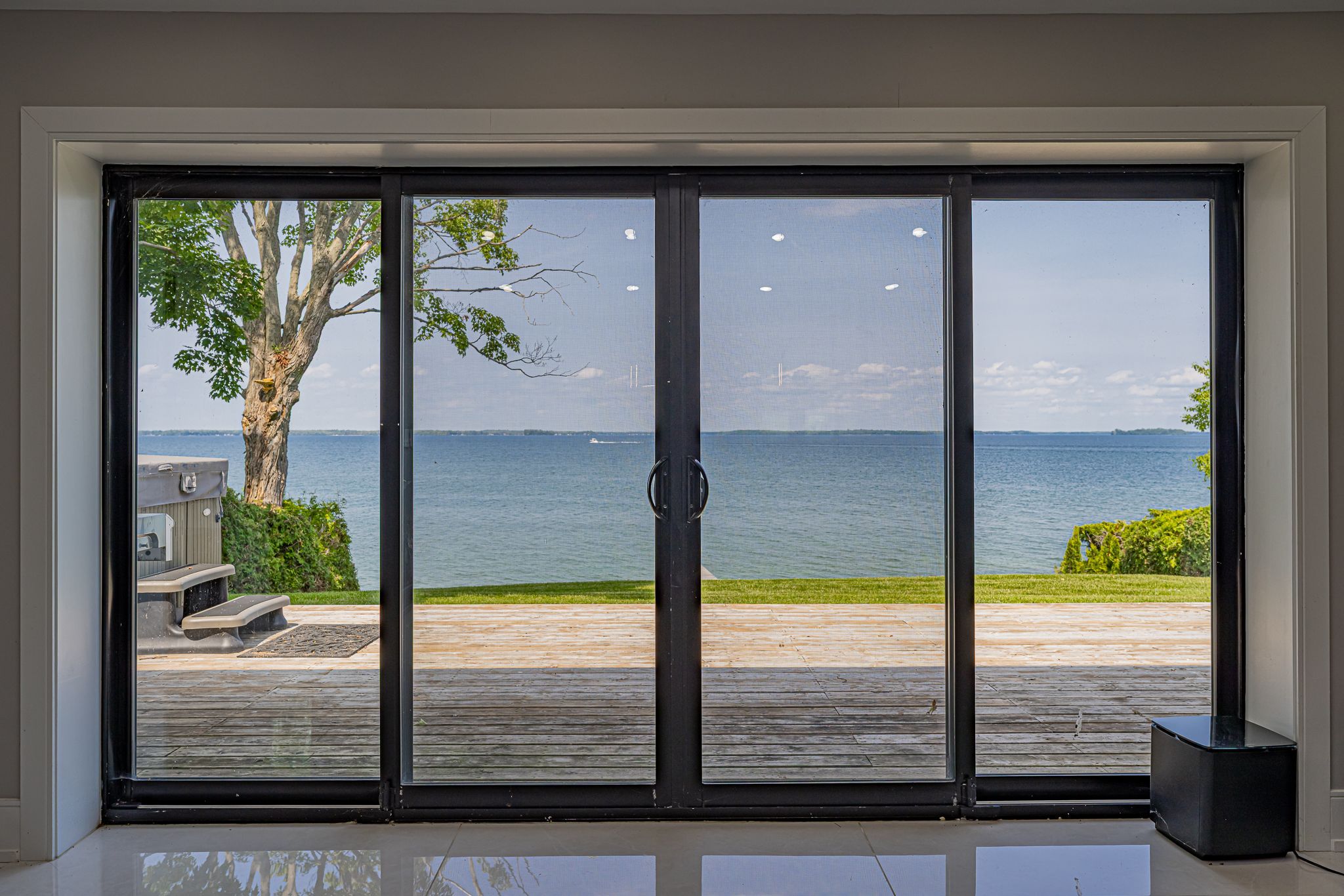 • Spacious lot with outdoor hot tub and waterfront sitting area.