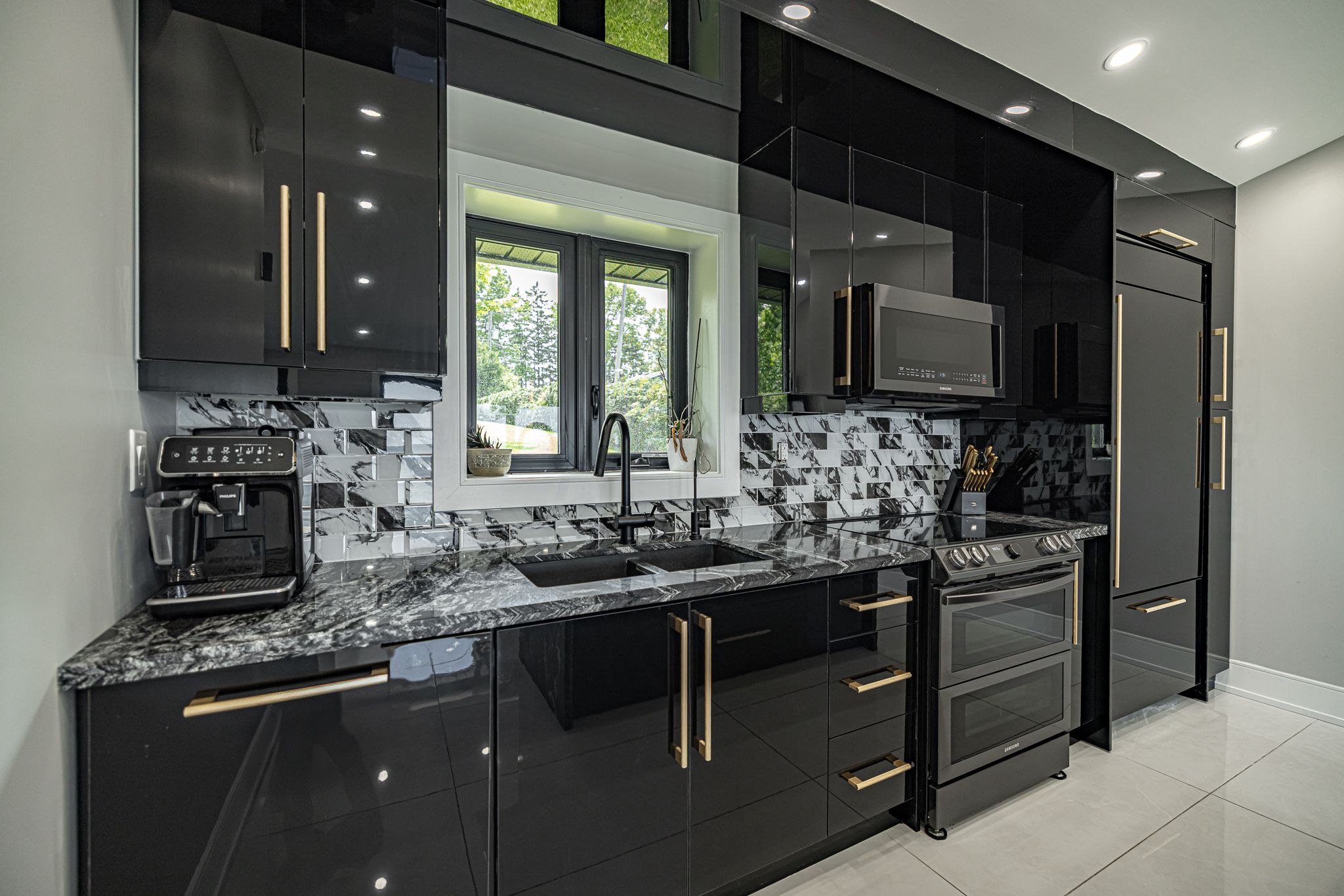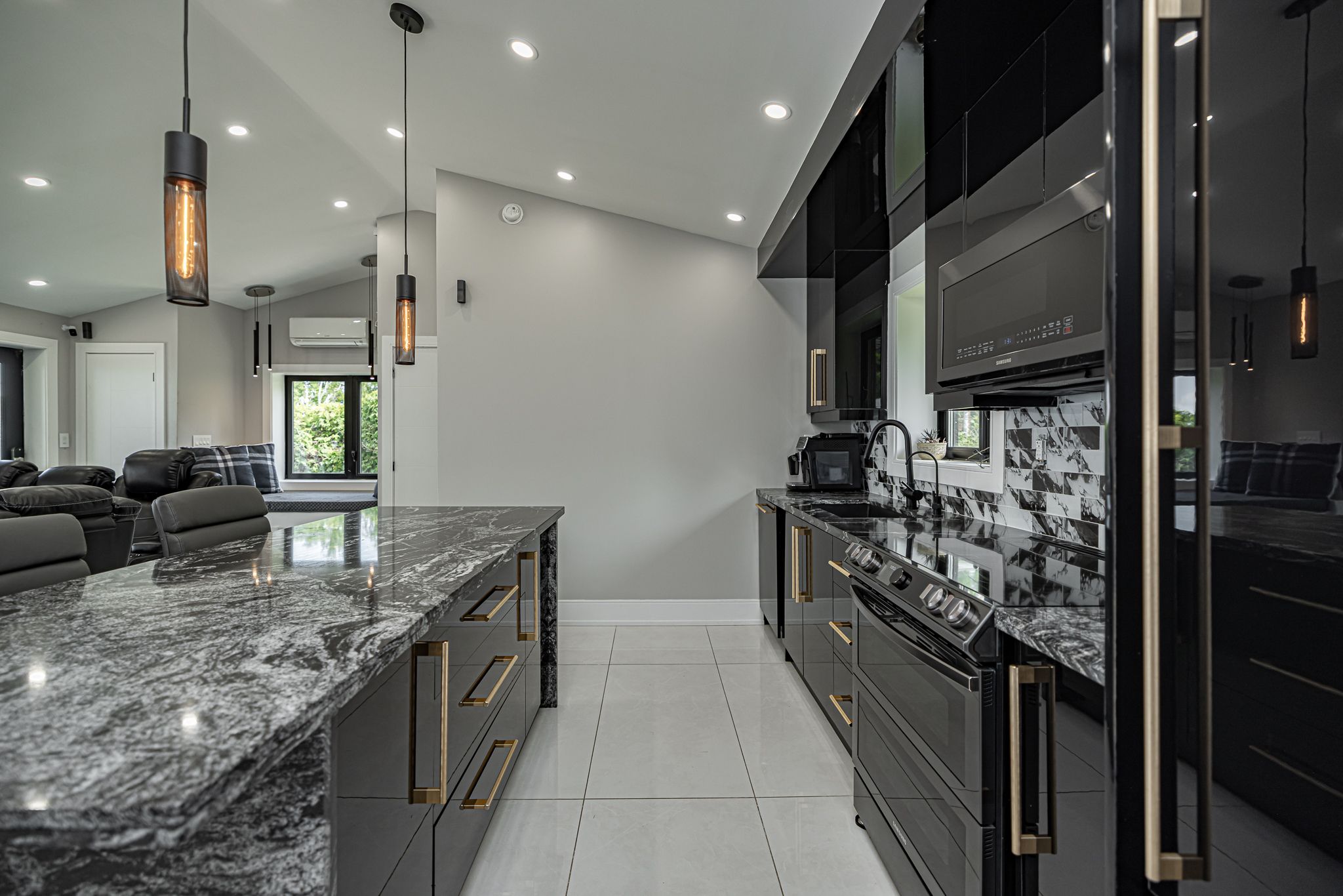 • Gourmet kitchen featuring granite countertop island and high-end appliances.