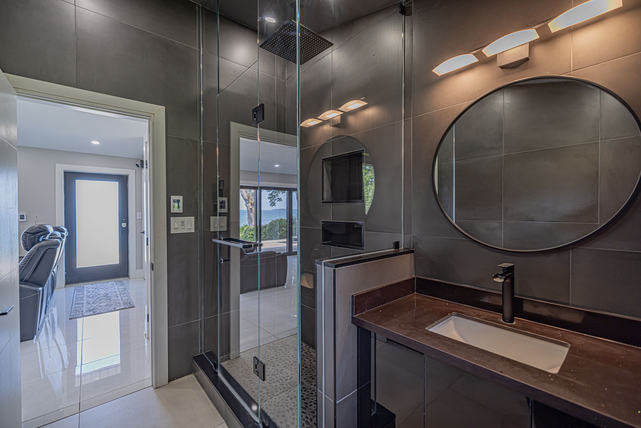 • Elegant bathroom with modern glass shower and heated porcelain flooring.