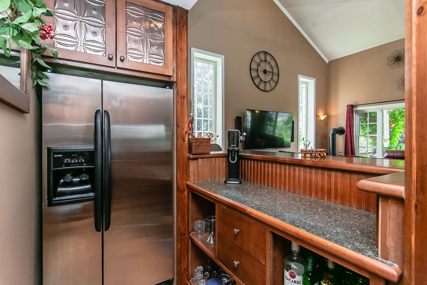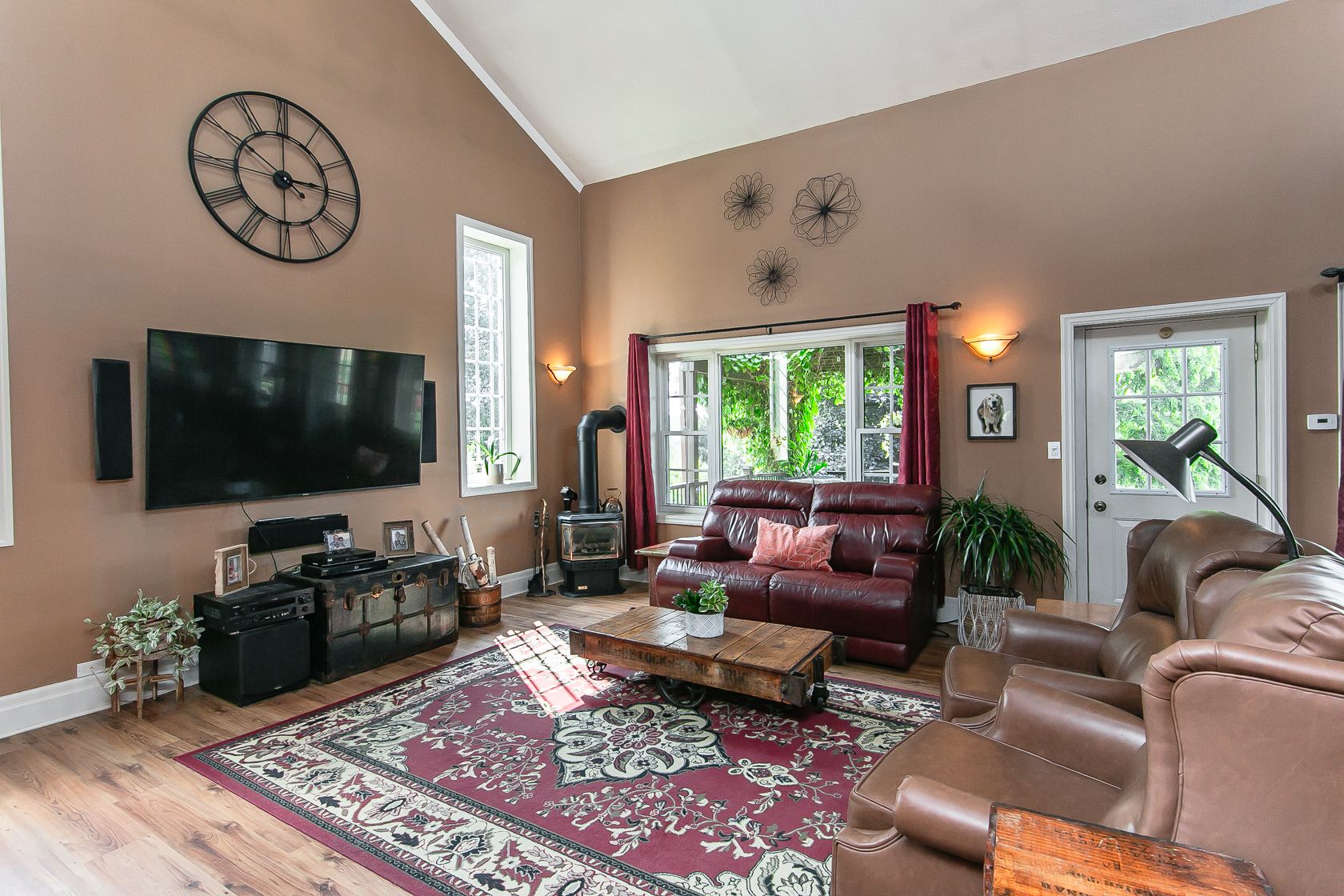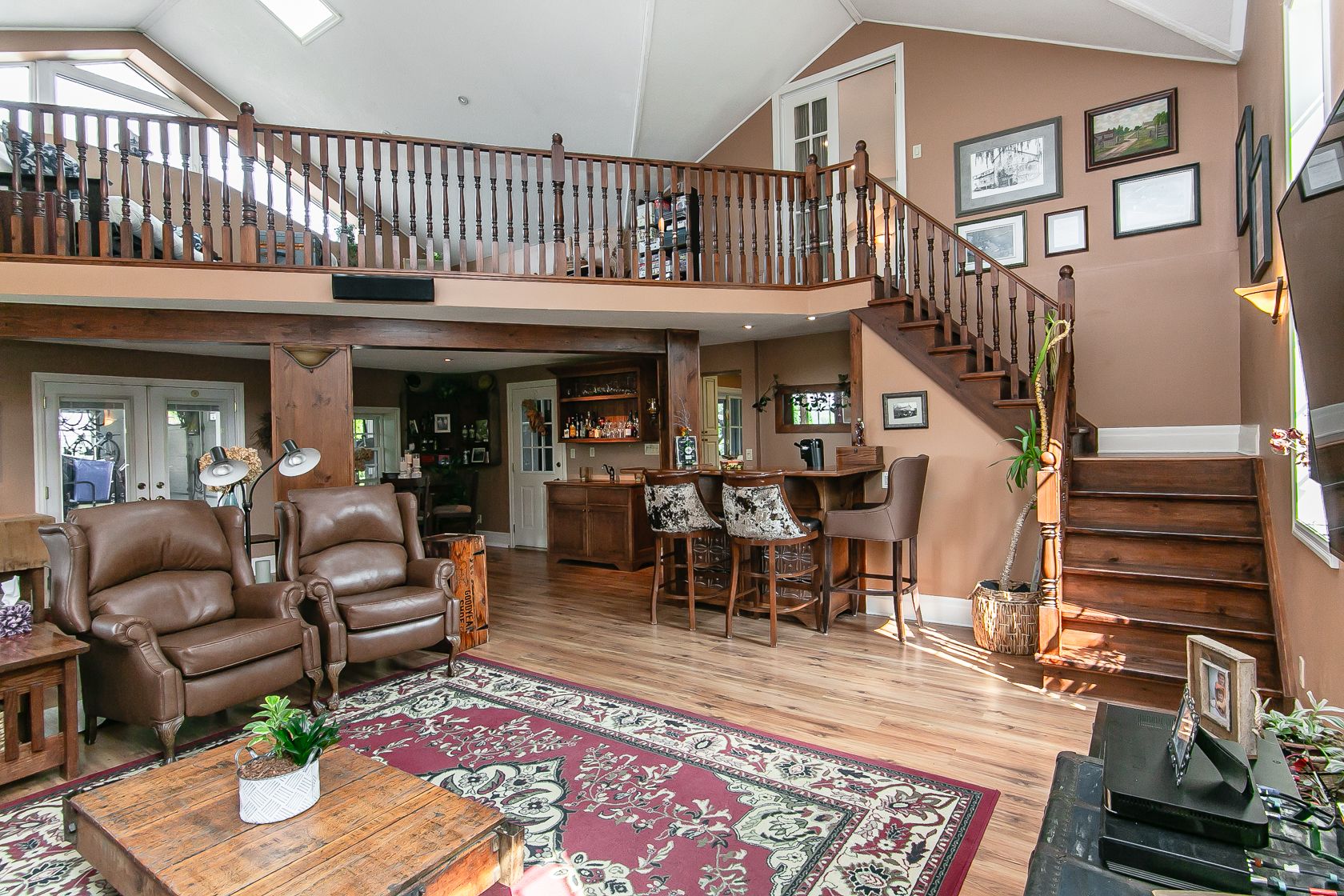 • Bright family room featuring cathedral ceilings and a cozy gas fireplace.