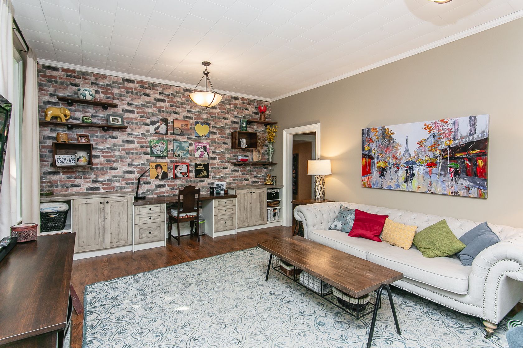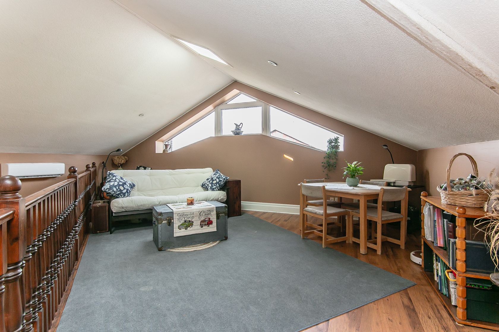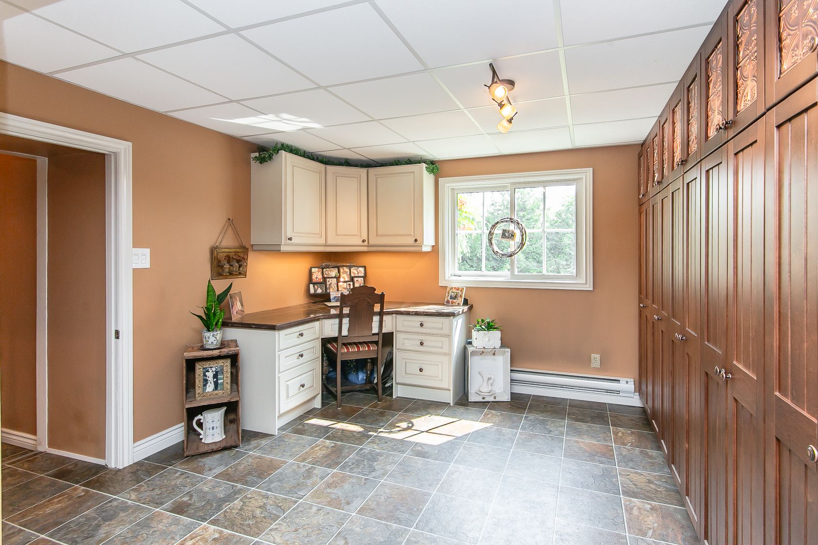 • Bright family room featuring cathedral ceilings and a cozy gas fireplace.