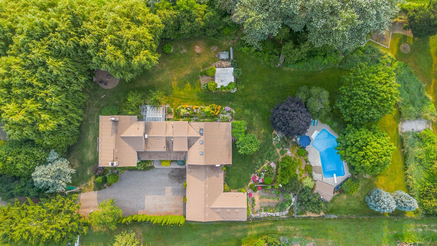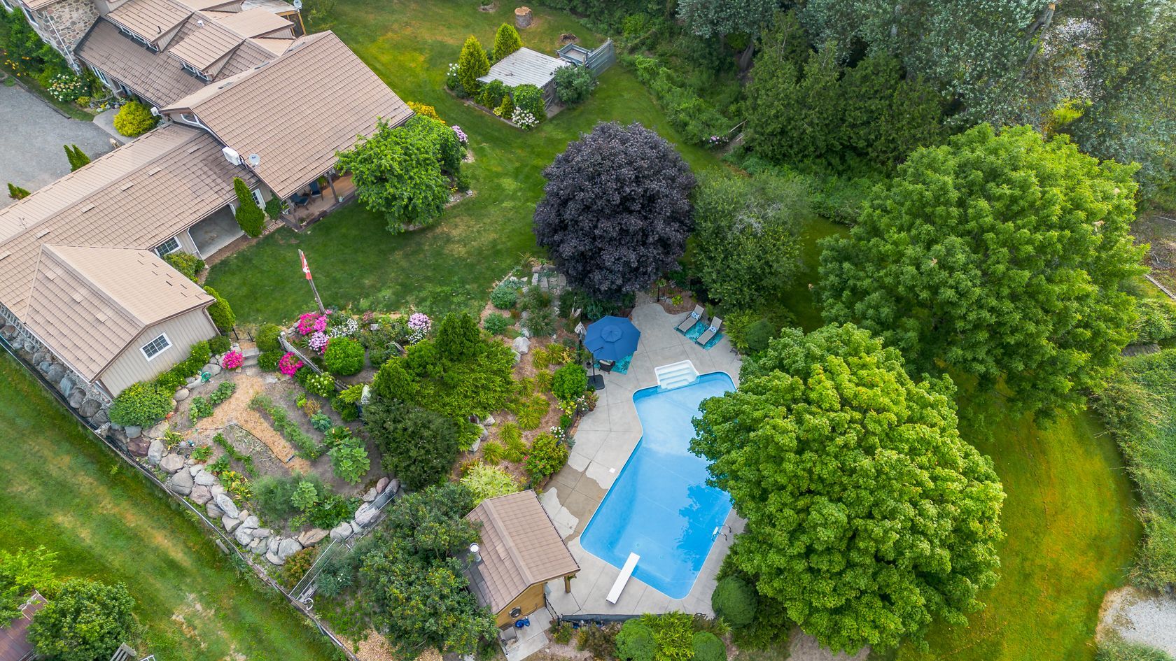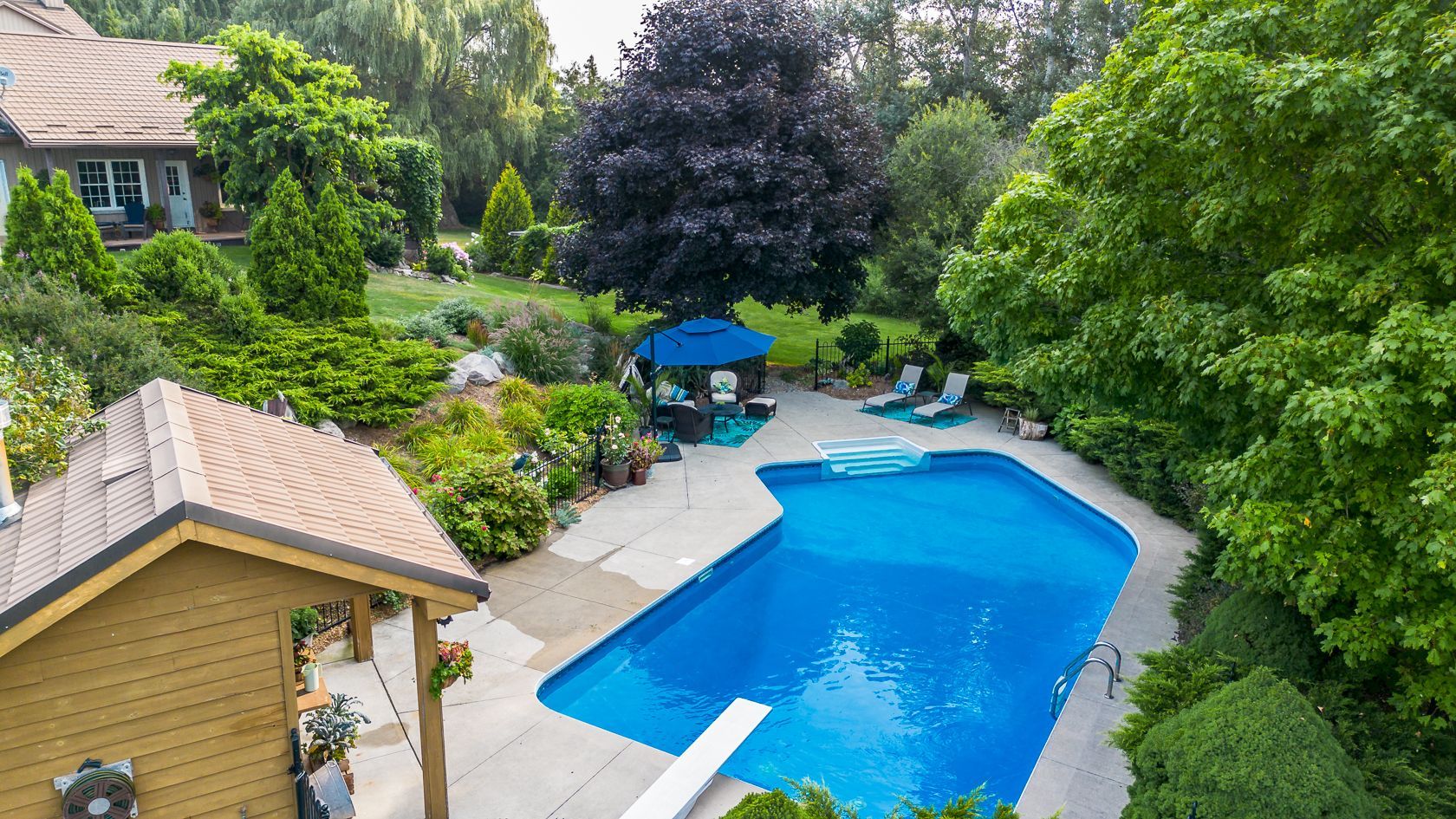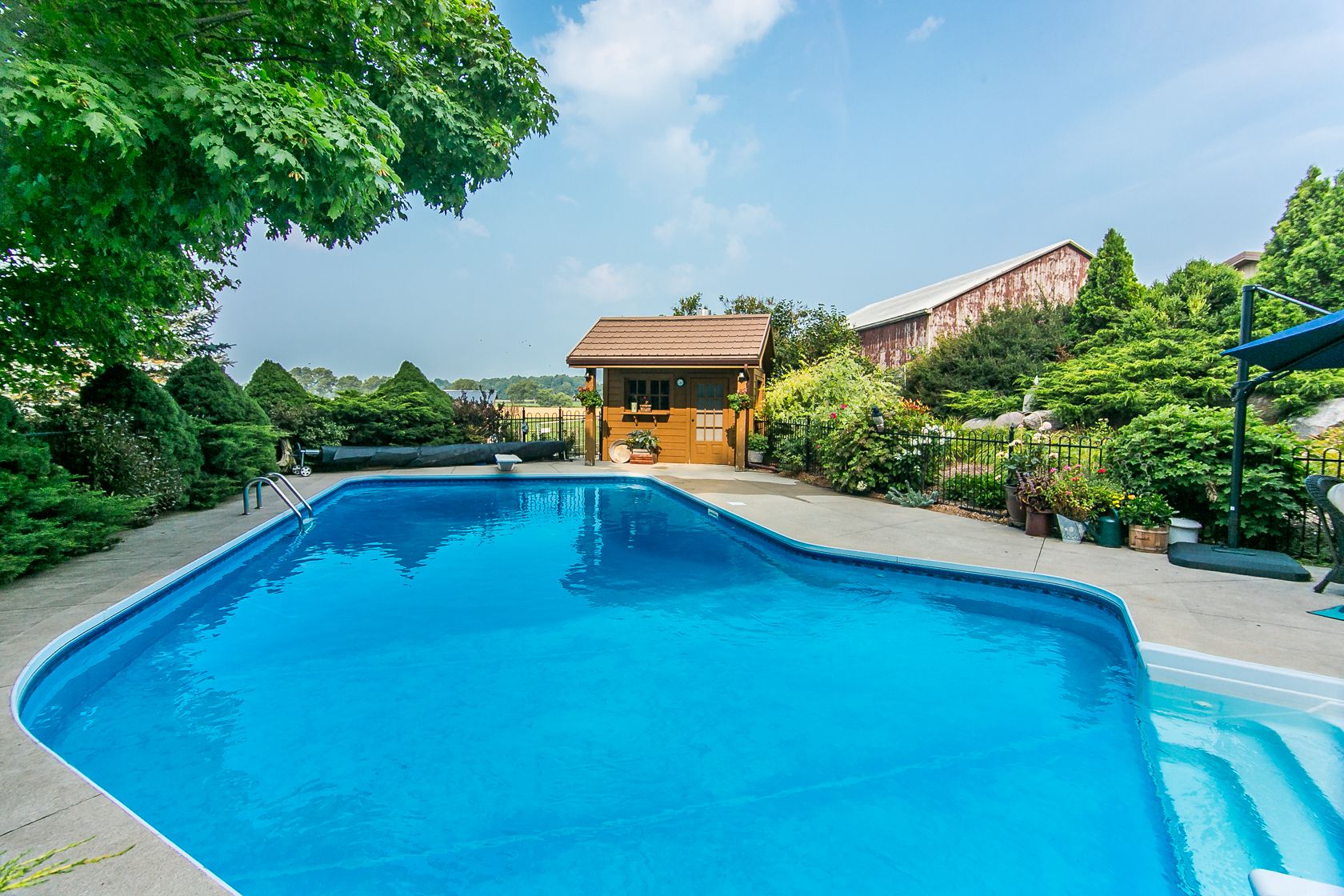 • Heated inground pool in a secluded area, surrounded by mature trees.