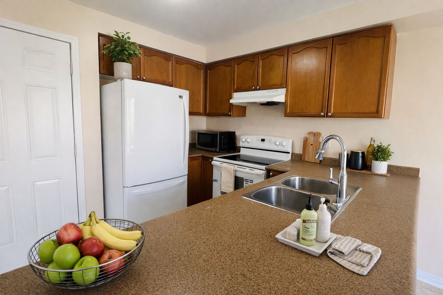 • Modern kitchen with stainless steel appliances and backyard access.