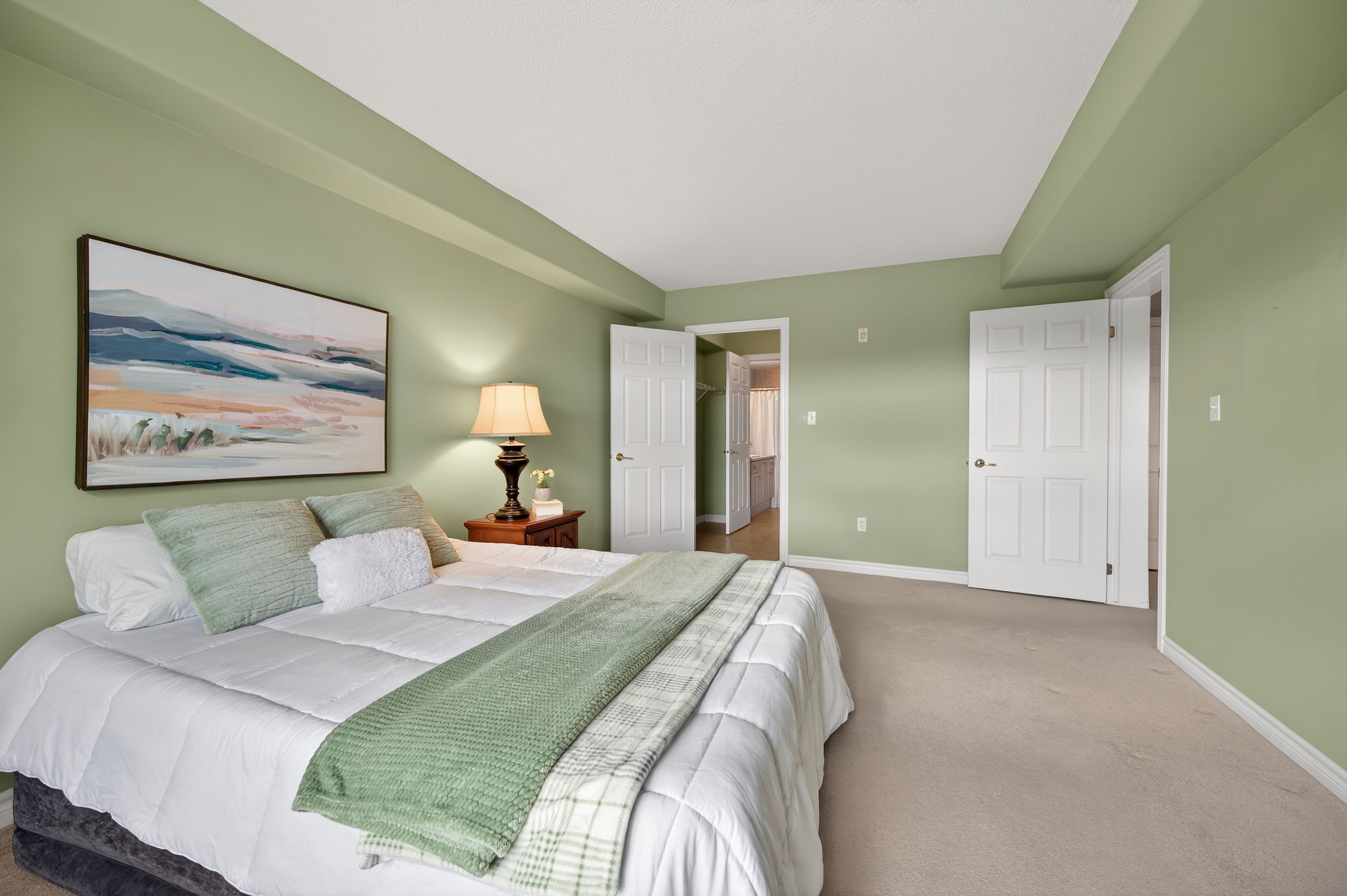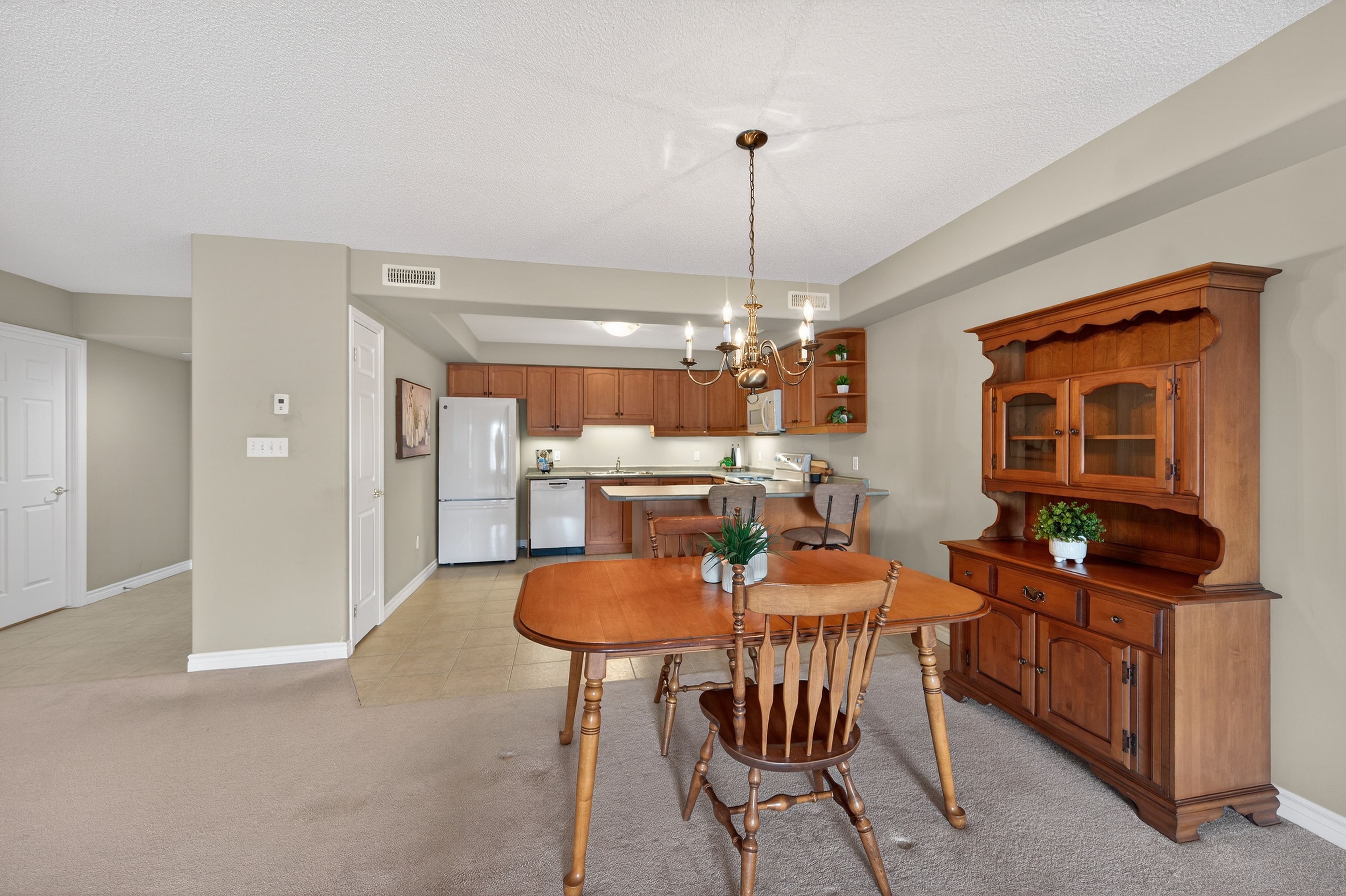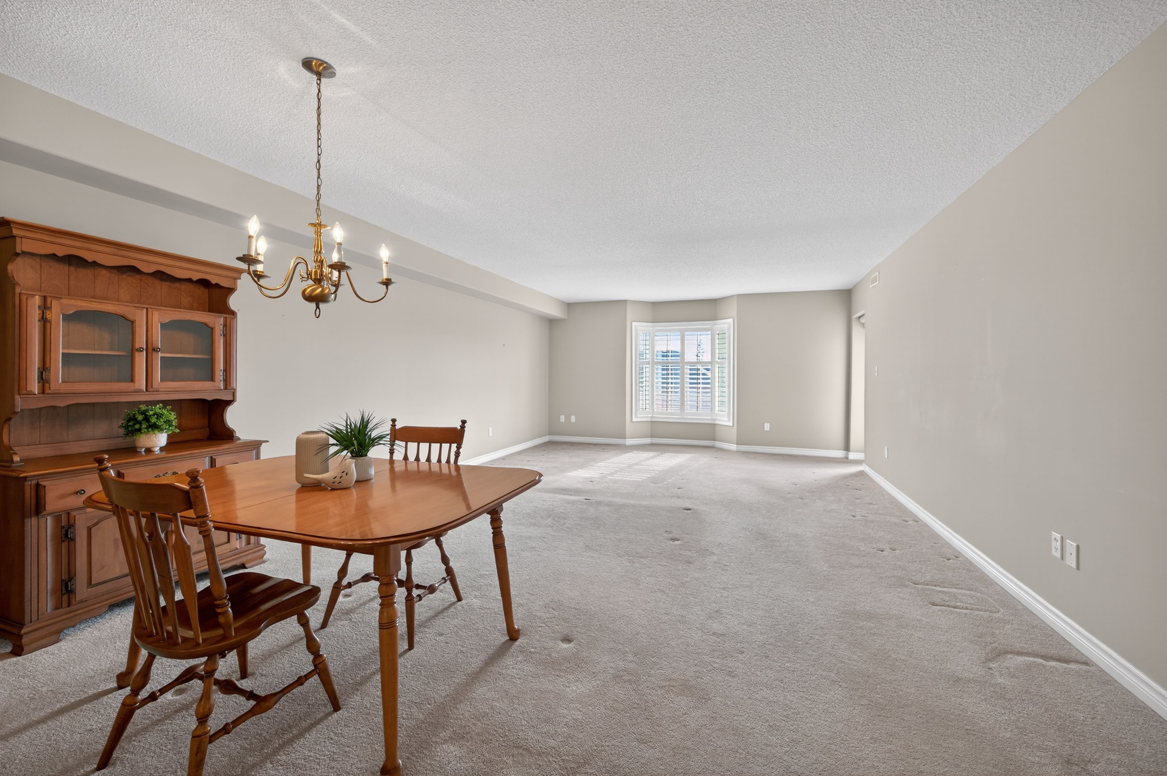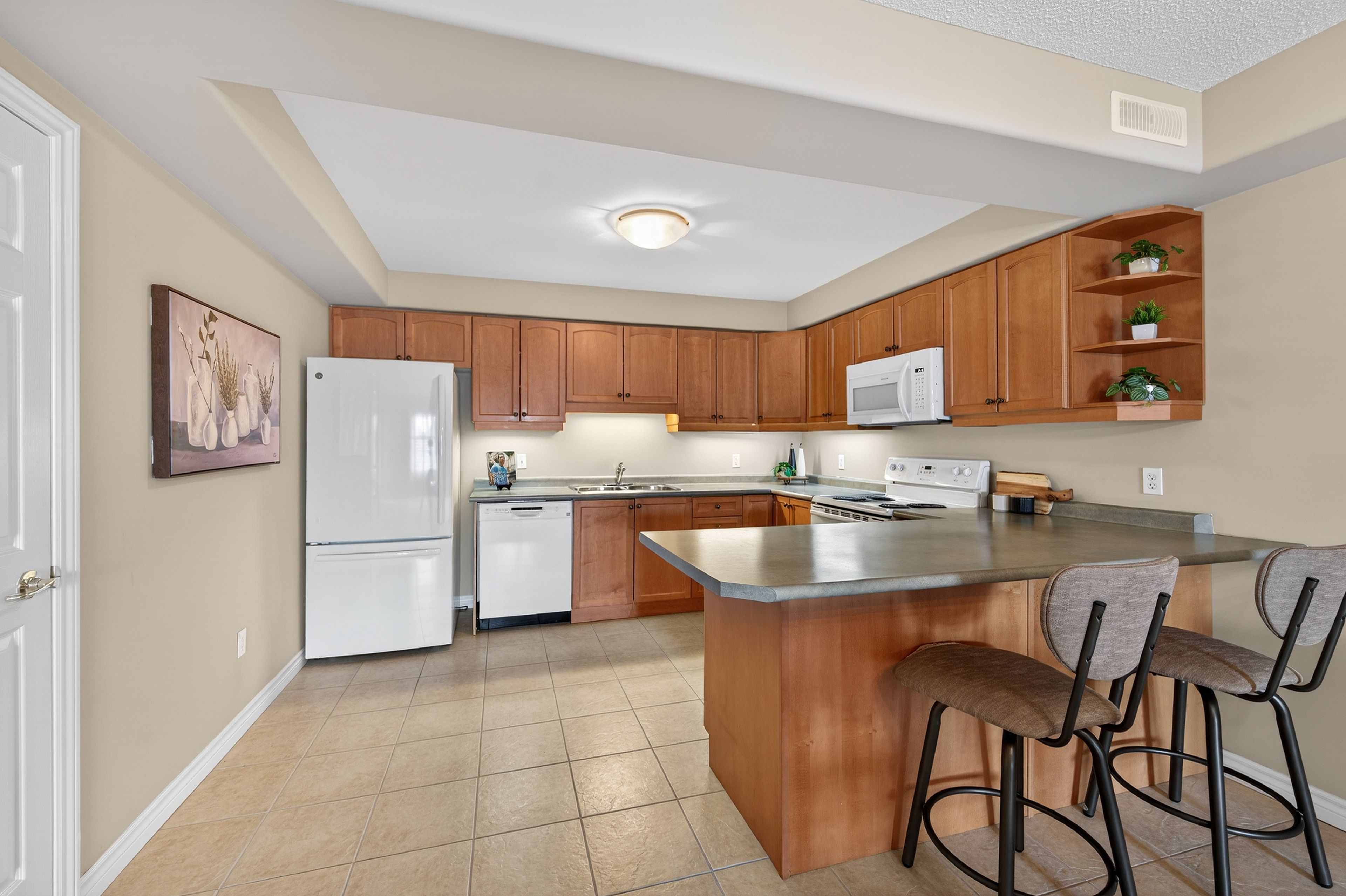 Condo living in a desirable east hamilton mountain neighbourhood, perfectly positioned near local recreation, nature, and everyday conveniences. This spacious two-bedroom, two-bathroom condominium offers approximately 1,362 sq ft of well-planned living space. The kitchen features warm wood cabinetry, a pantry, ample counter space, and a peninsula with breakfast bar ideal for casual meals or entertaining. The generous dining room flows seamlessly into the bright living room, with walk-out access to a covered balcony for year-round enjoyment. The thoughtful layout includes a main 3-piece bathroom with a tiled shower with glass door, while the large primary bedroom boasts a walk-through closet and a private ensuite bathroom. A second well-sized bedroom provides flexibility for guests, a home office, or hobbies. Enjoy the convenience of one underground parking space, a extra large storage unit, and building amenities that include a small gym with a washroom on the lower level. The building offers accessible features throughout the common areas, along with visitor parking located on the west side. Ideally located close to bernie arbour memorial stadium, liuna 4 ice centre, scenic trails along the mountain brow, and the natural beauty of albion falls. Close to public transit, shopping and public library. This home is a fantastic opportunity to enjoy comfortable, low-maintenance living in a vibrant community. Some photos are virtually staged.