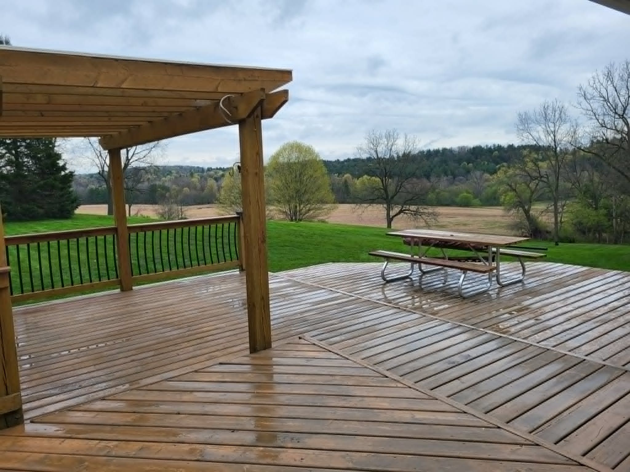 • Large tiered deck with a pergola for relaxation and outdoor enjoyment.