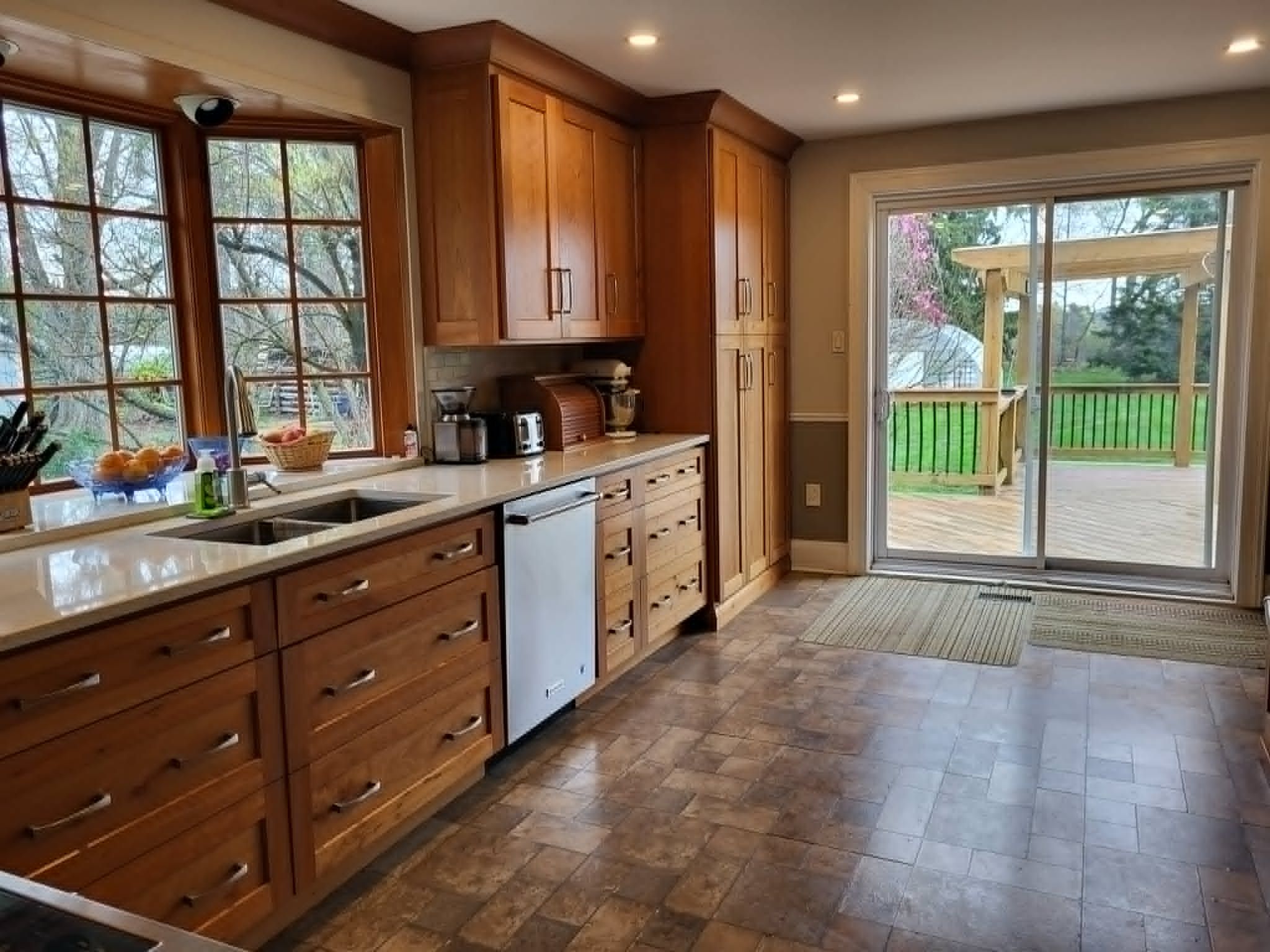 • Renovated kitchen featuring quartz tops and cherry cabinetry.