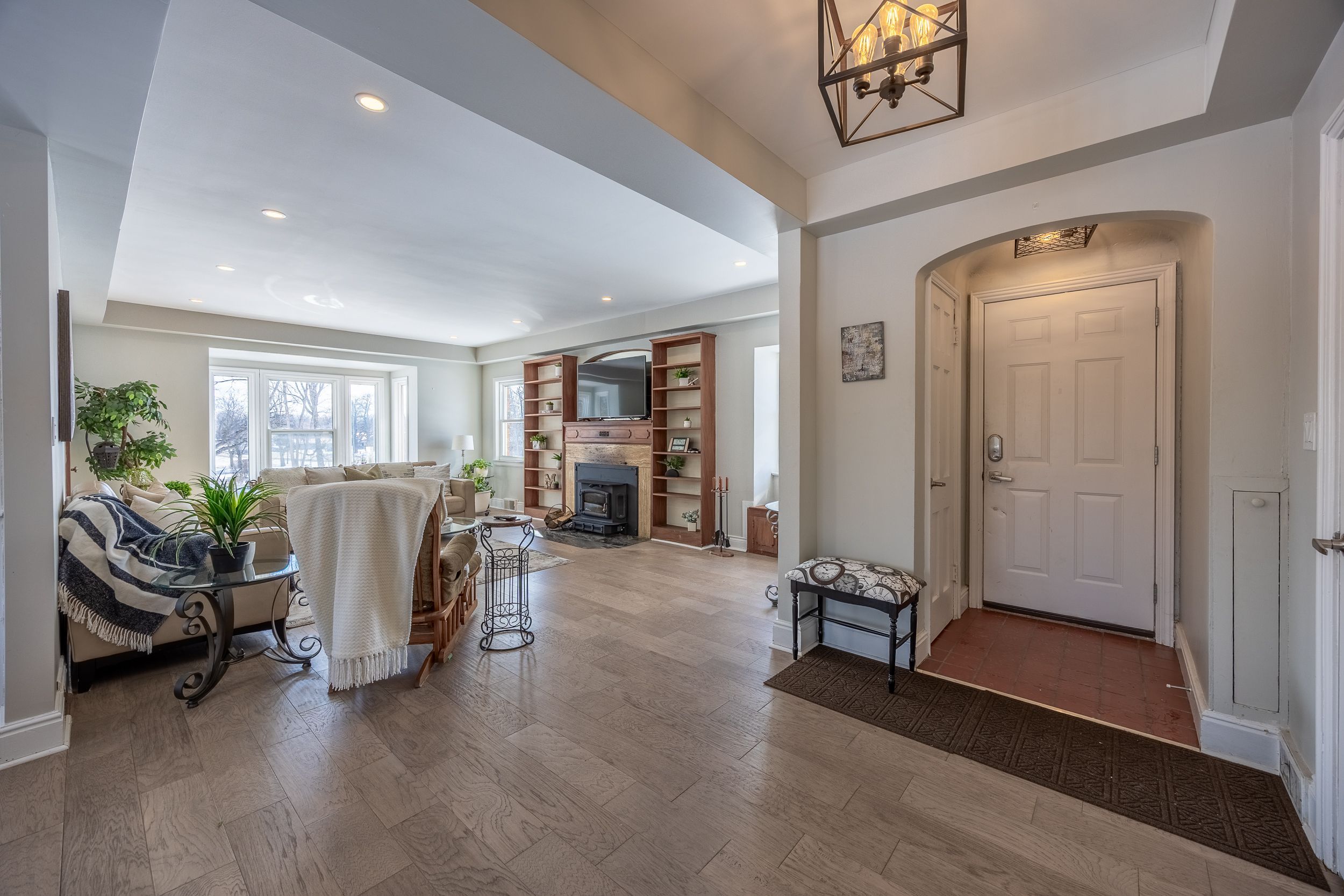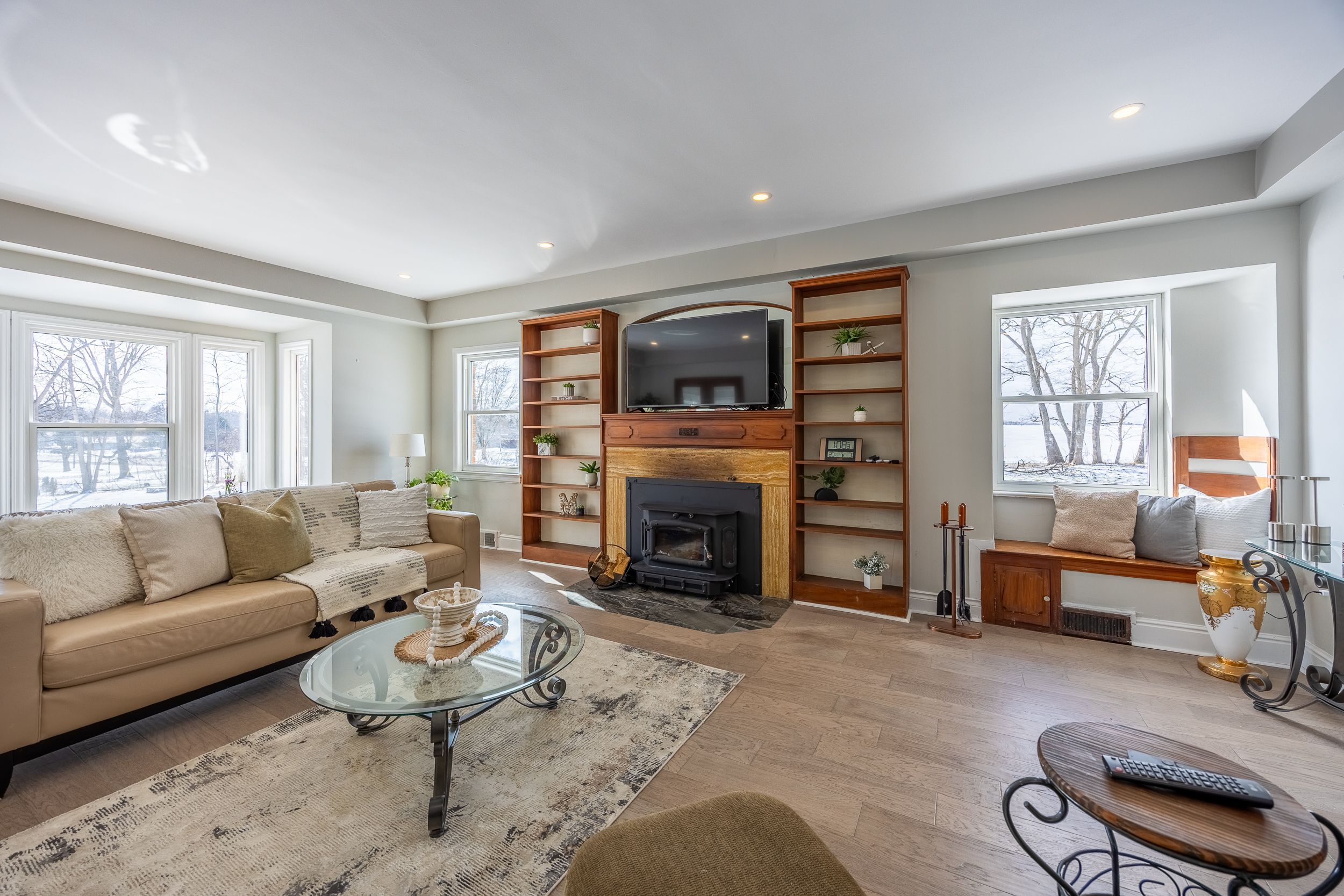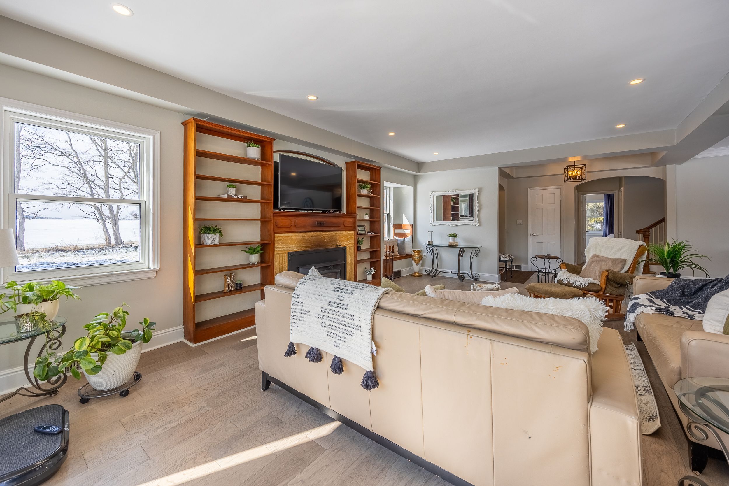 • Bright main level with open-concept living area and cozy fireplace.