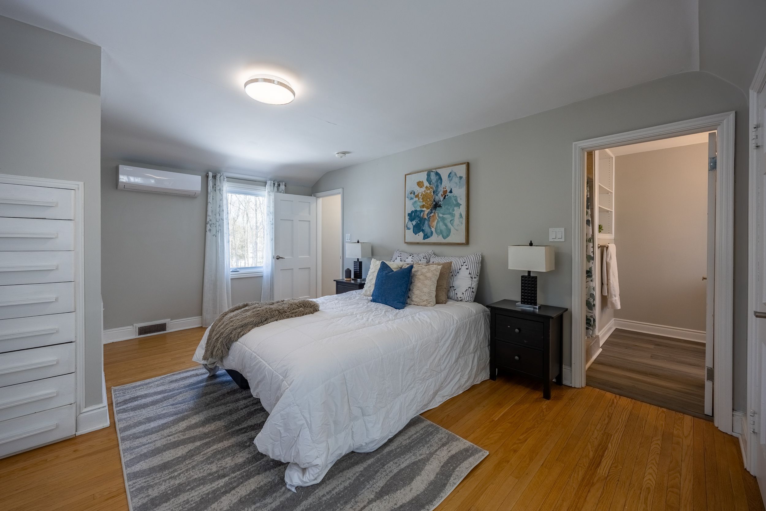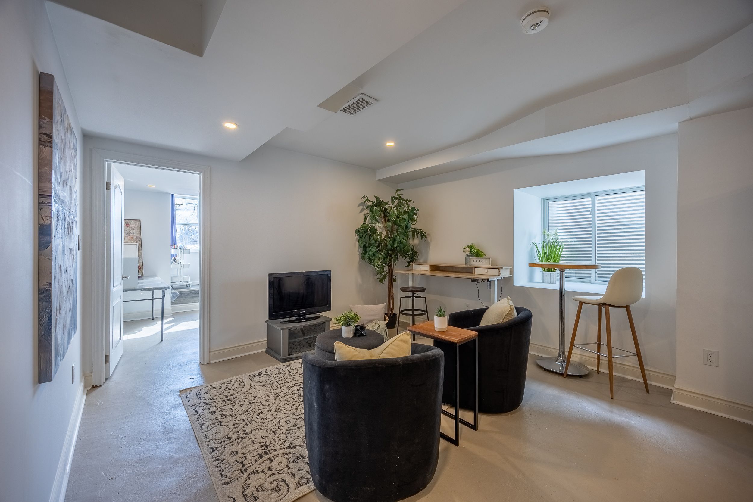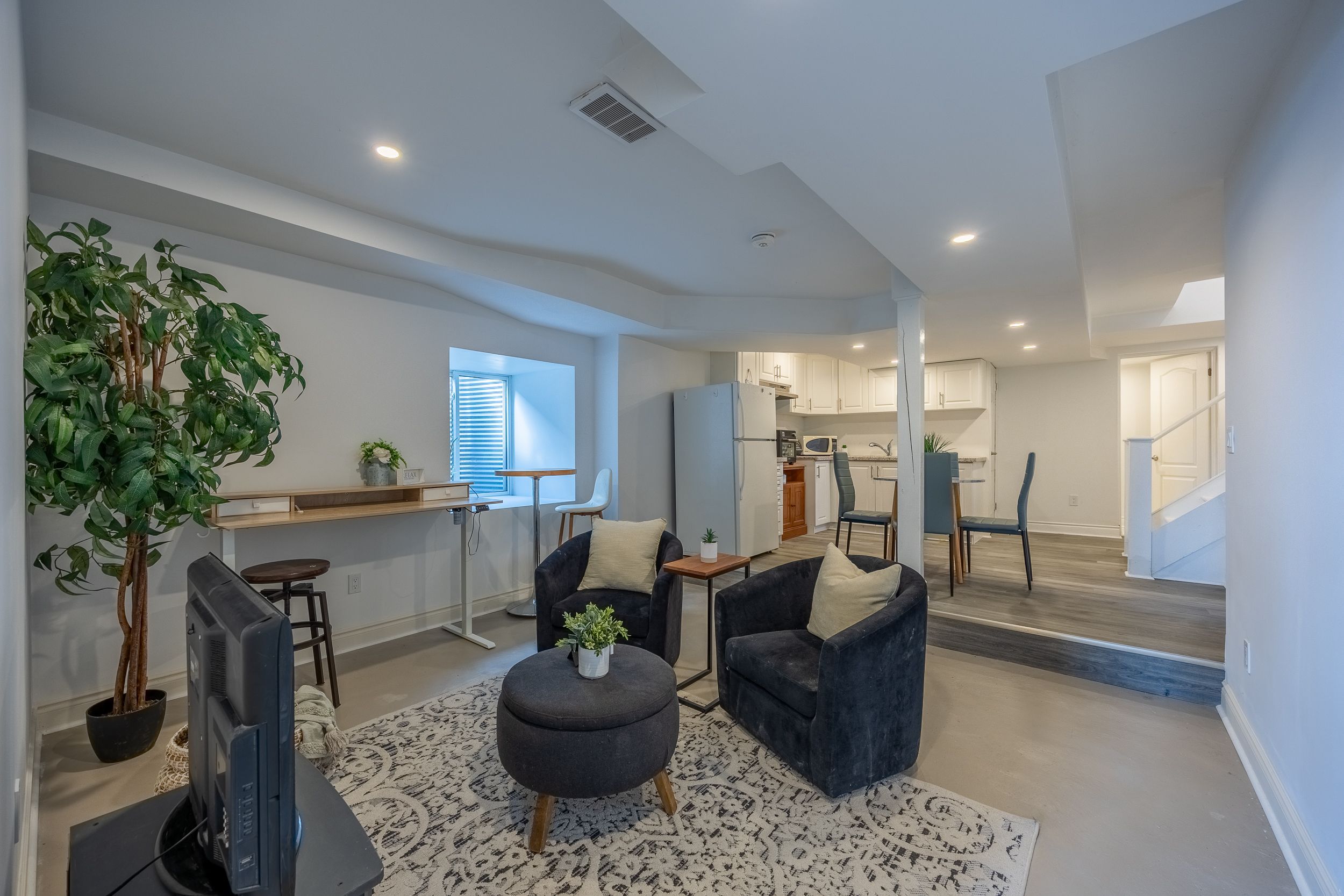 • Bright main level with open-concept living area and cozy fireplace.
