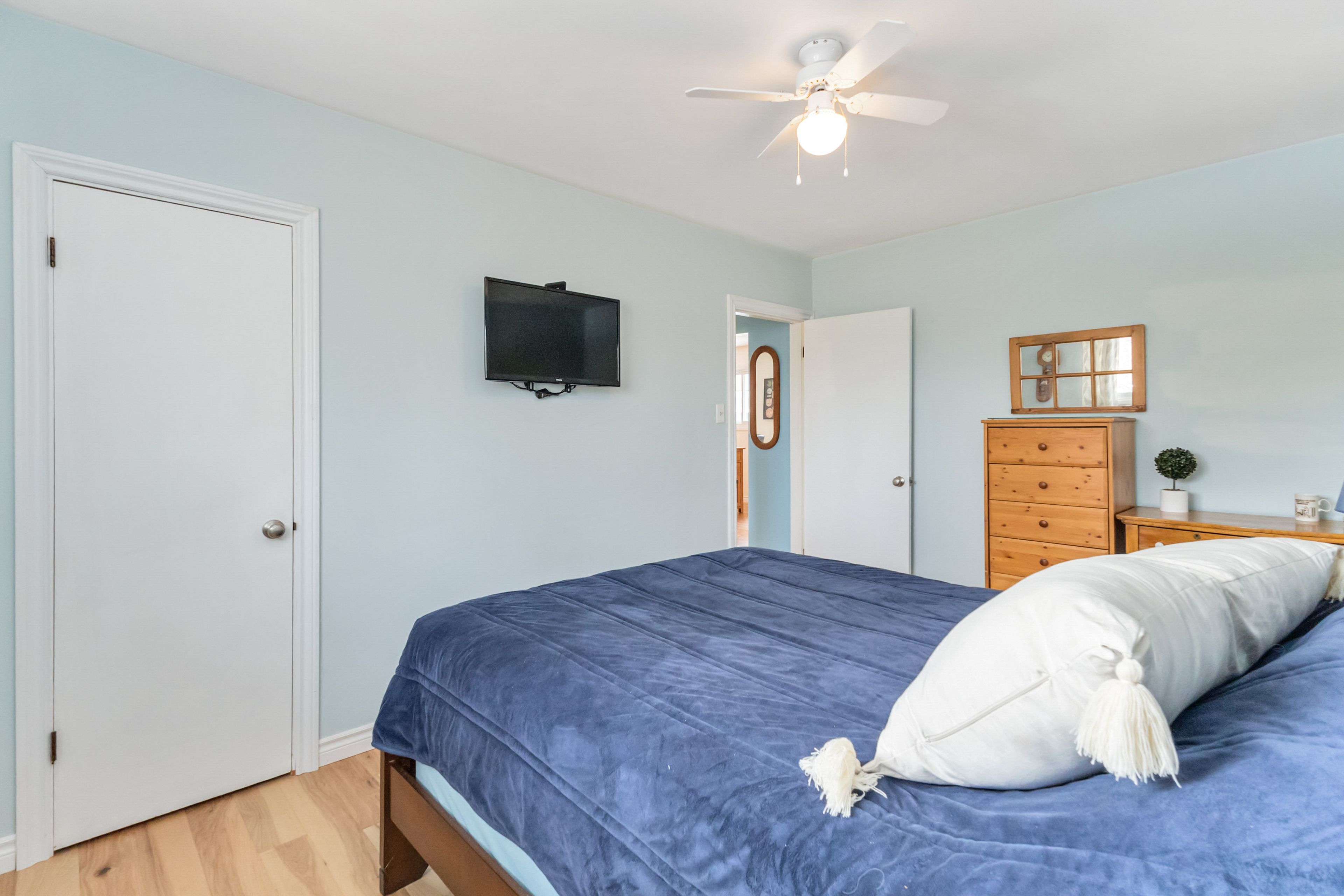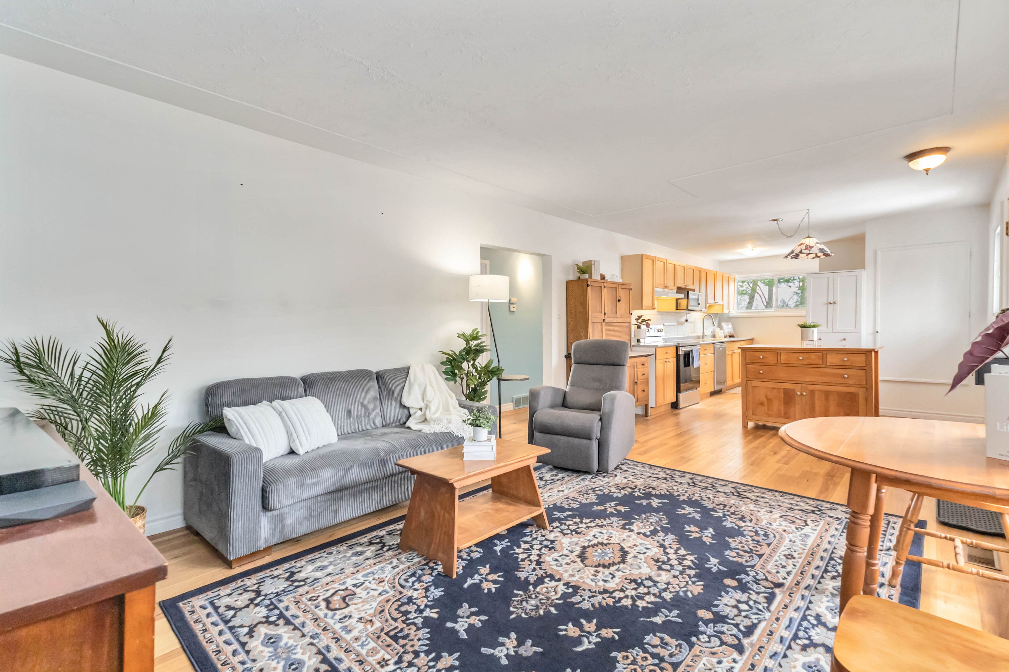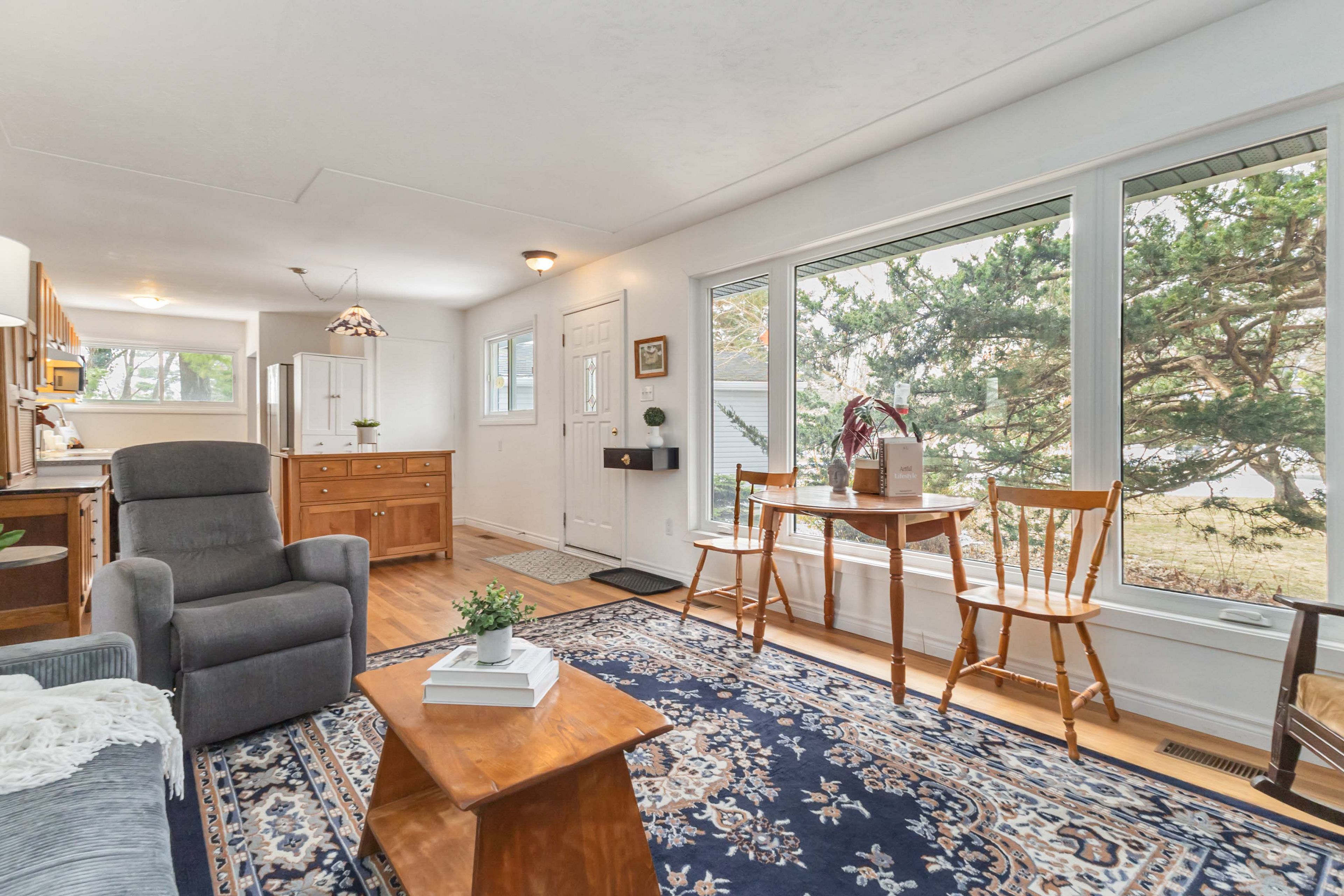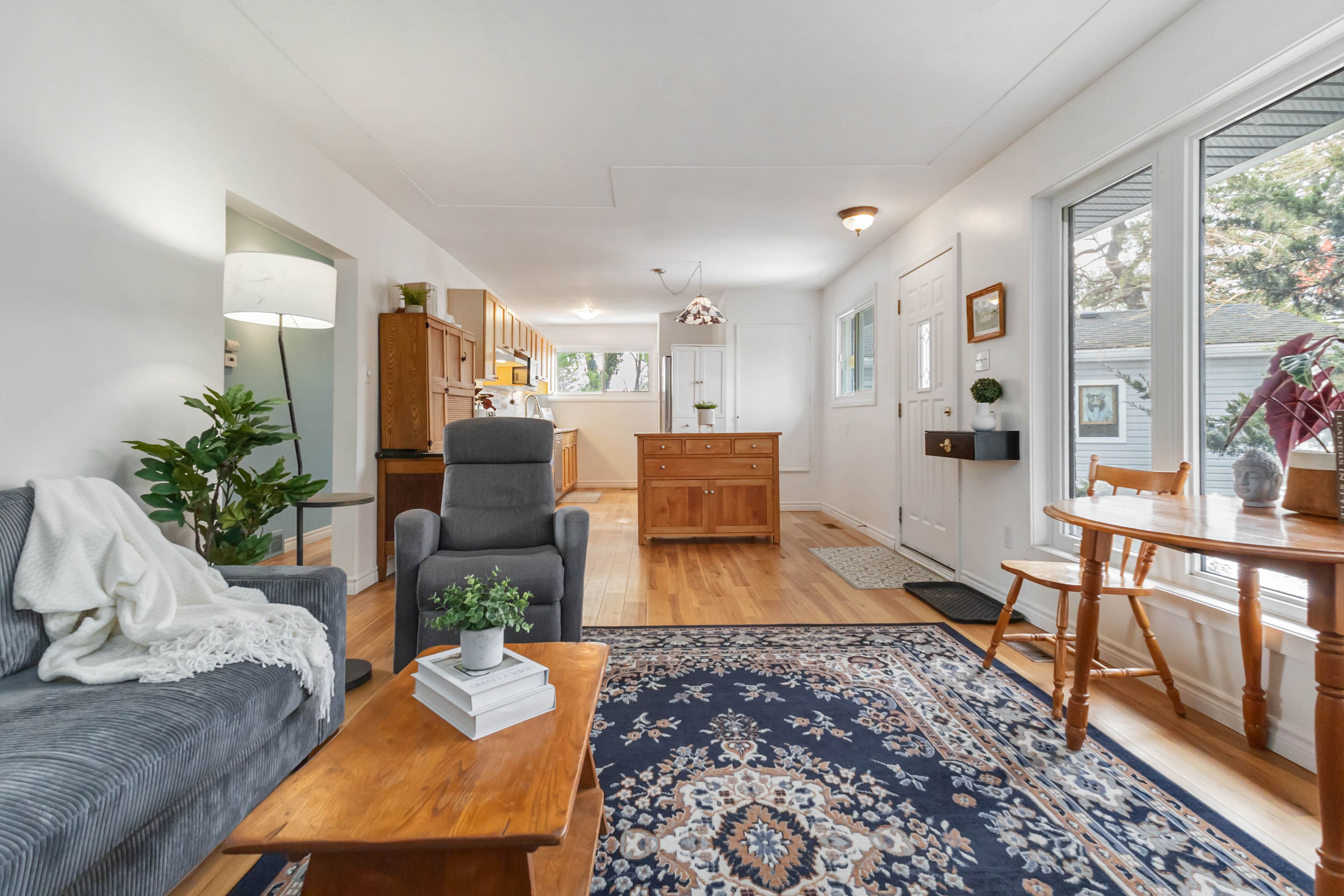 • Bright living spaces with engineered hardwood and large bay window.