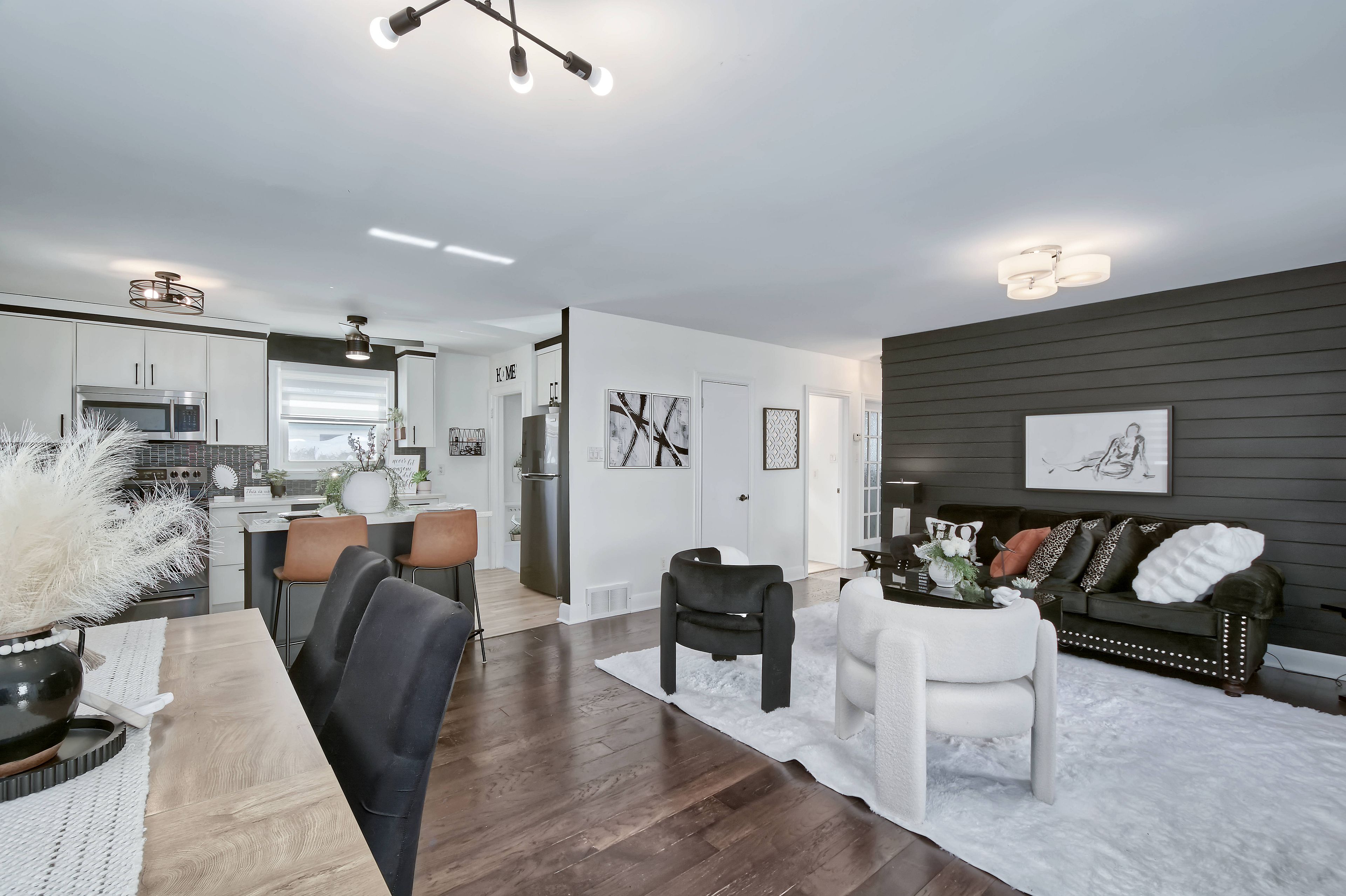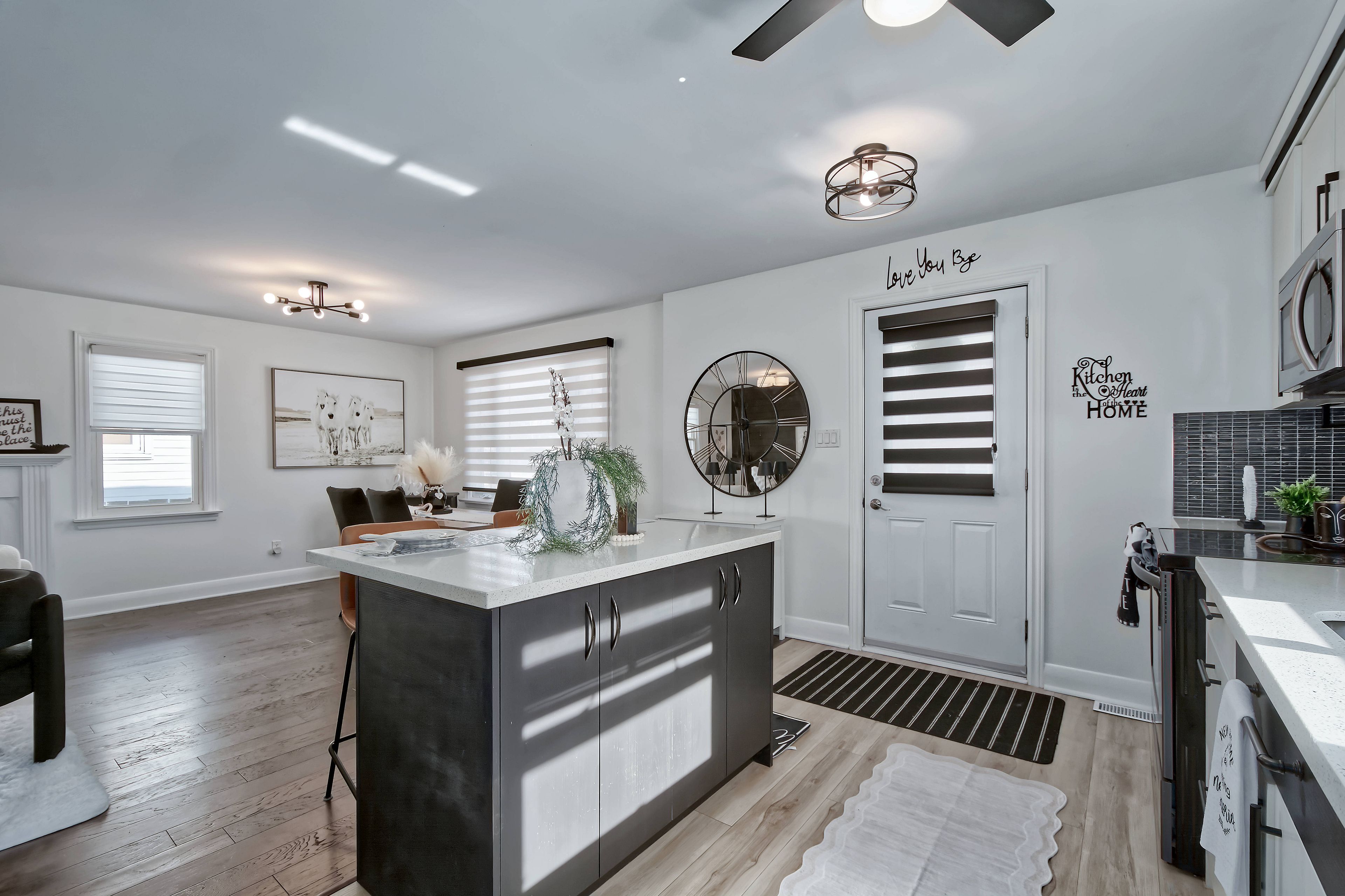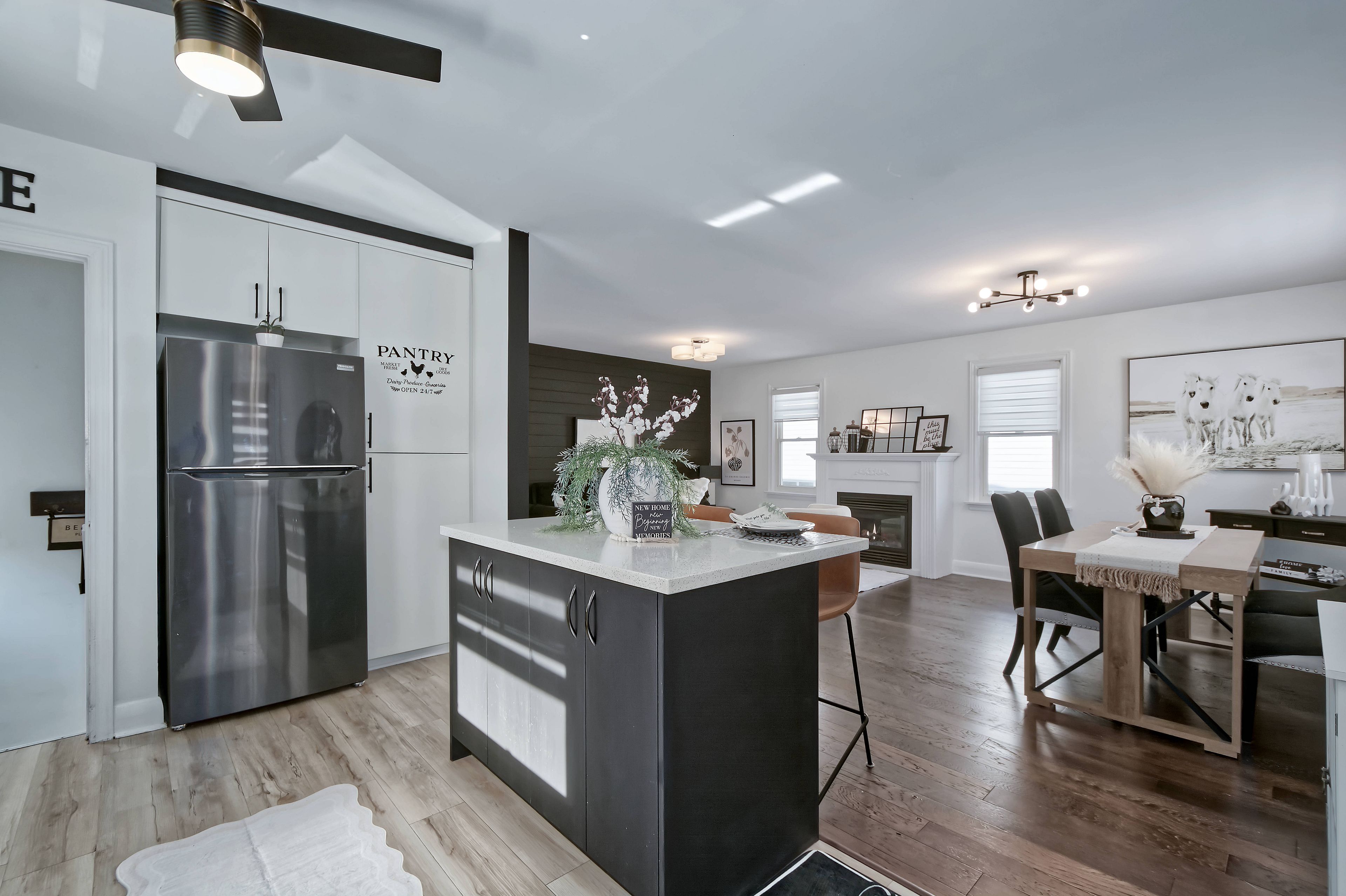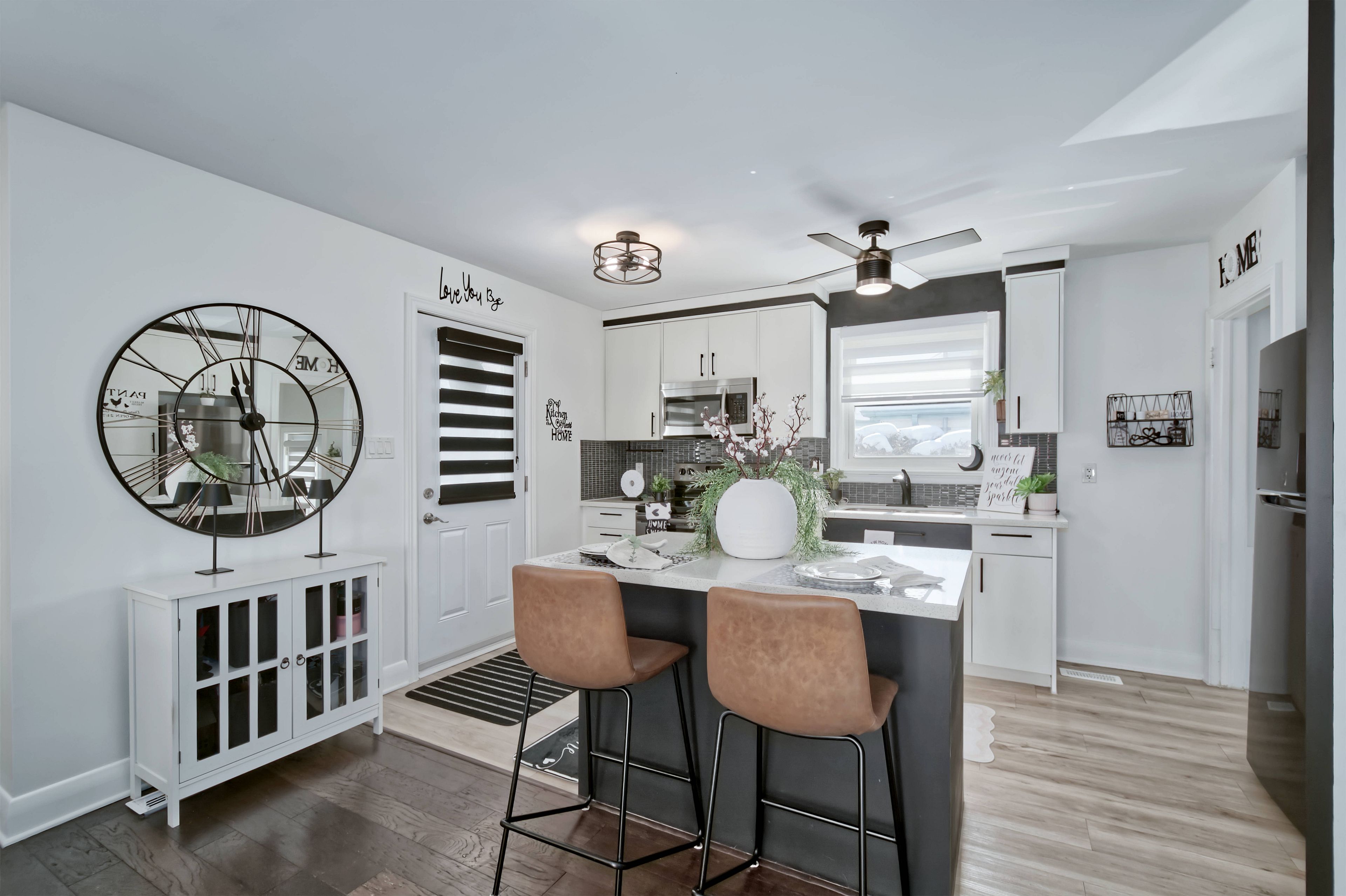 Stunning bungalow offers modern comfort with thoughtful updates throughout. The open-concept main floor is bright and welcoming, featuring updated lighting, ceiling fans, durable flooring, and contemporary finishes that create a stylish yet functional living space. The kitchen is a standout with stunning quartz countertops, black stainless-steel appliances, modern window coverings, and elegant light fixtures that enhance the space. The dining area is ideal for entertaining, highlighted by contemporary light fixtures and an eye-catching shiplap accent wall that adds personality and visual interest. The main bathroom features updated flooring for a clean, modern look and a primary bedroom that offers two closets. The lower level is finished providing versatile living spaces perfect for an office, gym, den, guest room, and rec room. Laundry has spray foam insulation and soundproofing beneath the primary bedroom and along the north back room. A water hookup in the south back room allows for a wet bar or potential second kitchen; wardrobes in this room are included. The entire home was freshly painted top to bottom within the last three years. Outdoor living is equally impressive with a 13' x 20' back deck, a 12' x 12' stone patio, gazebo, perfect for relaxing or entertaining. The fully fenced backyard is well maintained and includes two sheds (one recently purchased). A 10' x 12' pergola included. Parking is available for up to three vehicles. Nearby convenience of shopping, parks, schools, hwys make this location ideal. Pleasure to show!!