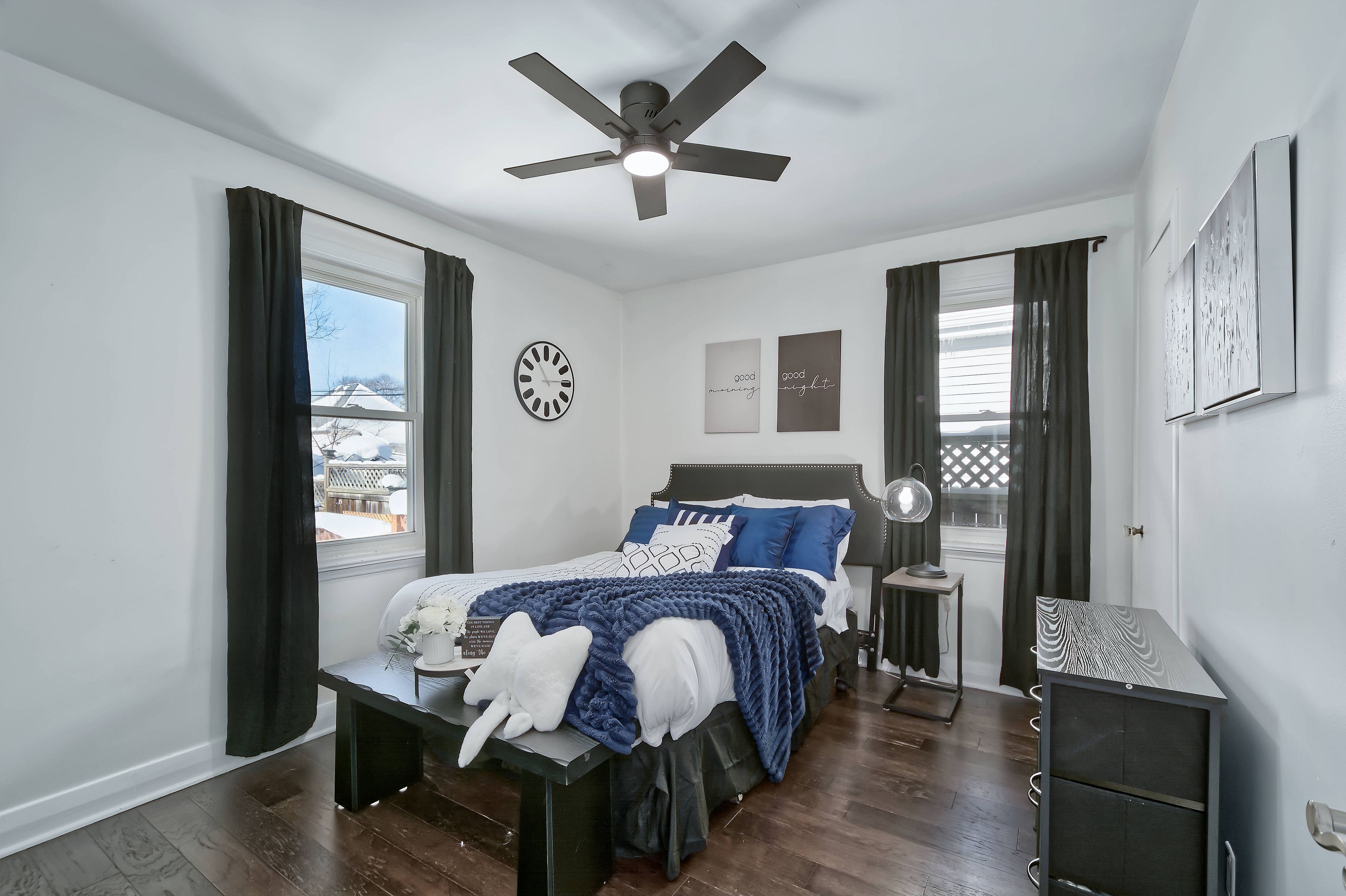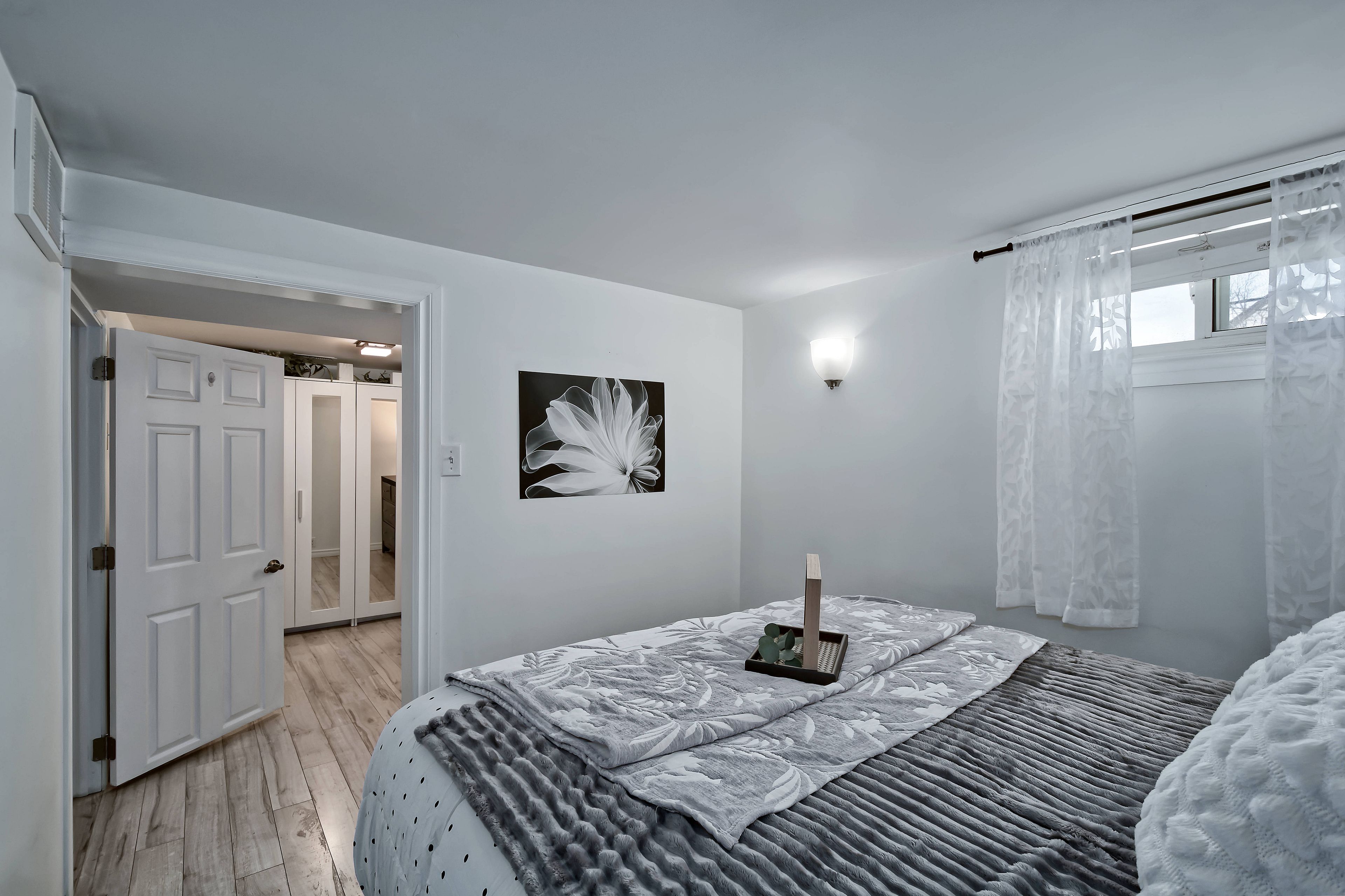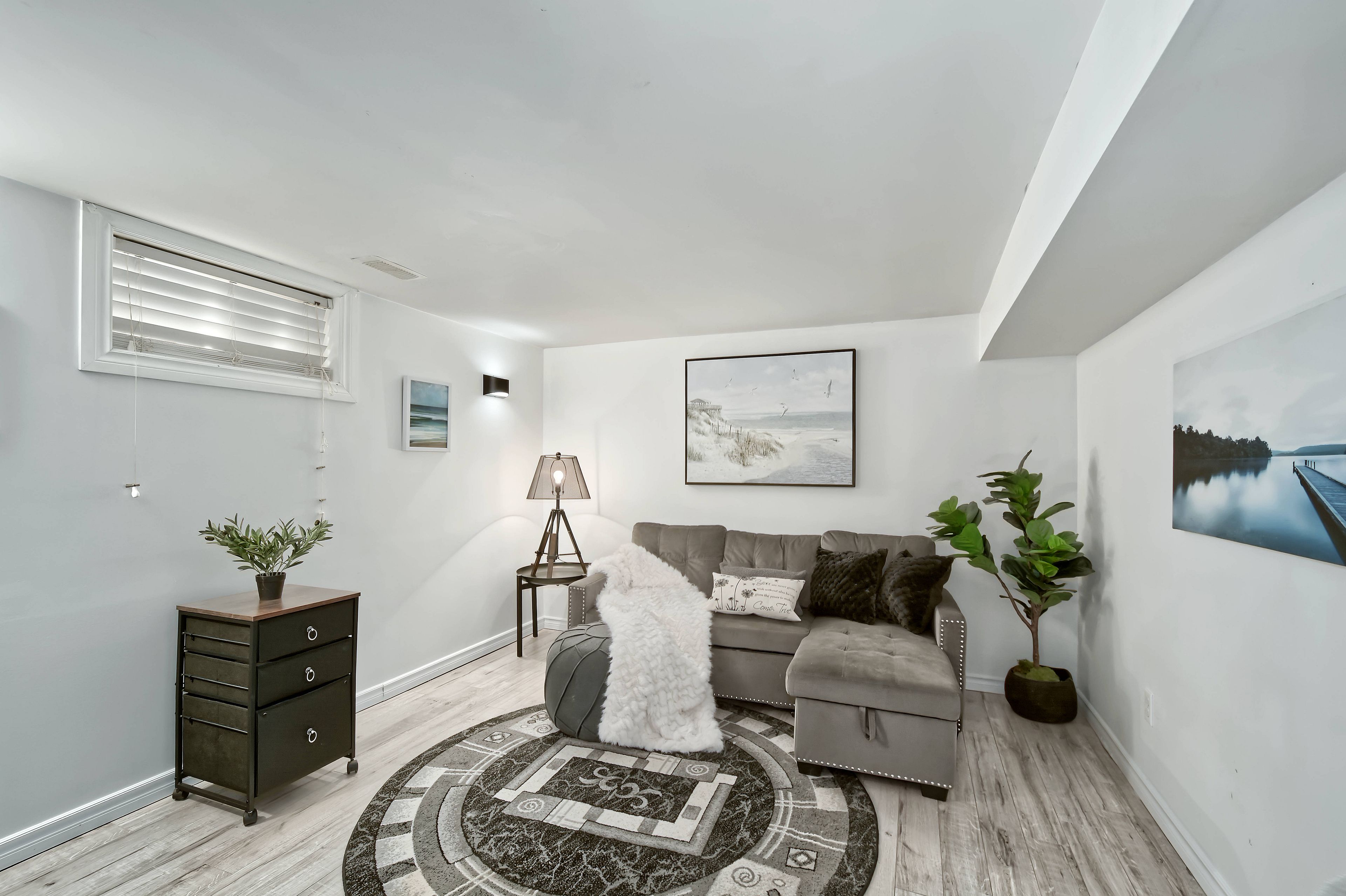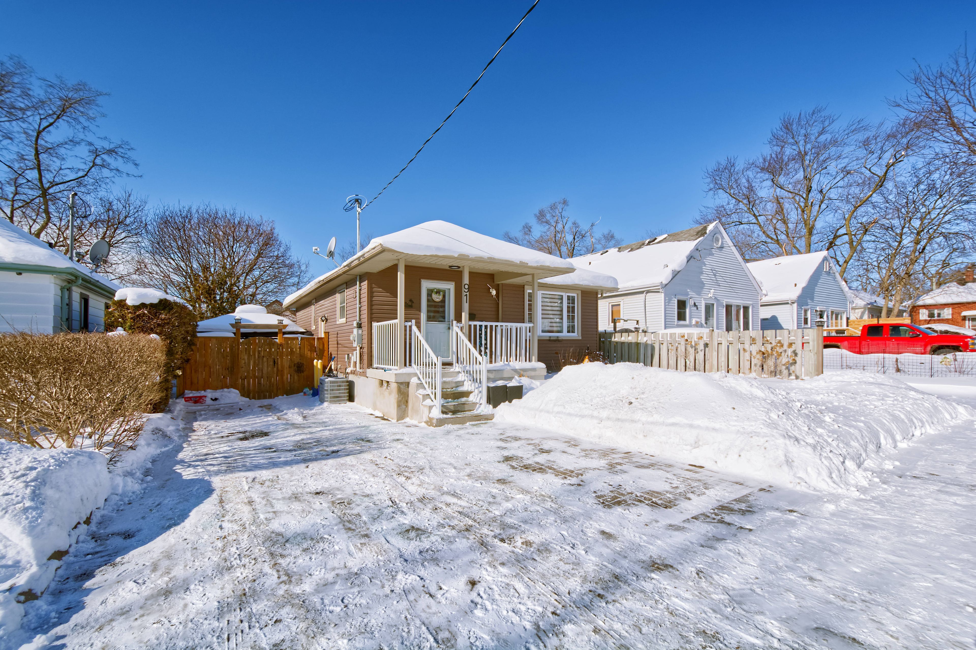 Stunning bungalow offers modern comfort with thoughtful updates throughout. The open-concept main floor is bright and welcoming, featuring updated lighting, ceiling fans, durable flooring, and contemporary finishes that create a stylish yet functional living space. The kitchen is a standout with stunning quartz countertops, black stainless-steel appliances, modern window coverings, and elegant light fixtures that enhance the space. The dining area is ideal for entertaining, highlighted by contemporary light fixtures and an eye-catching shiplap accent wall that adds personality and visual interest. The main bathroom features updated flooring for a clean, modern look and a primary bedroom that offers two closets. The lower level is finished providing versatile living spaces perfect for an office, gym, den, guest room, and rec room. Laundry has spray foam insulation and soundproofing beneath the primary bedroom and along the north back room. A water hookup in the south back room allows for a wet bar or potential second kitchen; wardrobes in this room are included. The entire home was freshly painted top to bottom within the last three years. Outdoor living is equally impressive with a 13' x 20' back deck, a 12' x 12' stone patio, gazebo, perfect for relaxing or entertaining. The fully fenced backyard is well maintained and includes two sheds (one recently purchased). A 10' x 12' pergola included. Parking is available for up to three vehicles. Nearby convenience of shopping, parks, schools, hwys make this location ideal. Pleasure to show!!