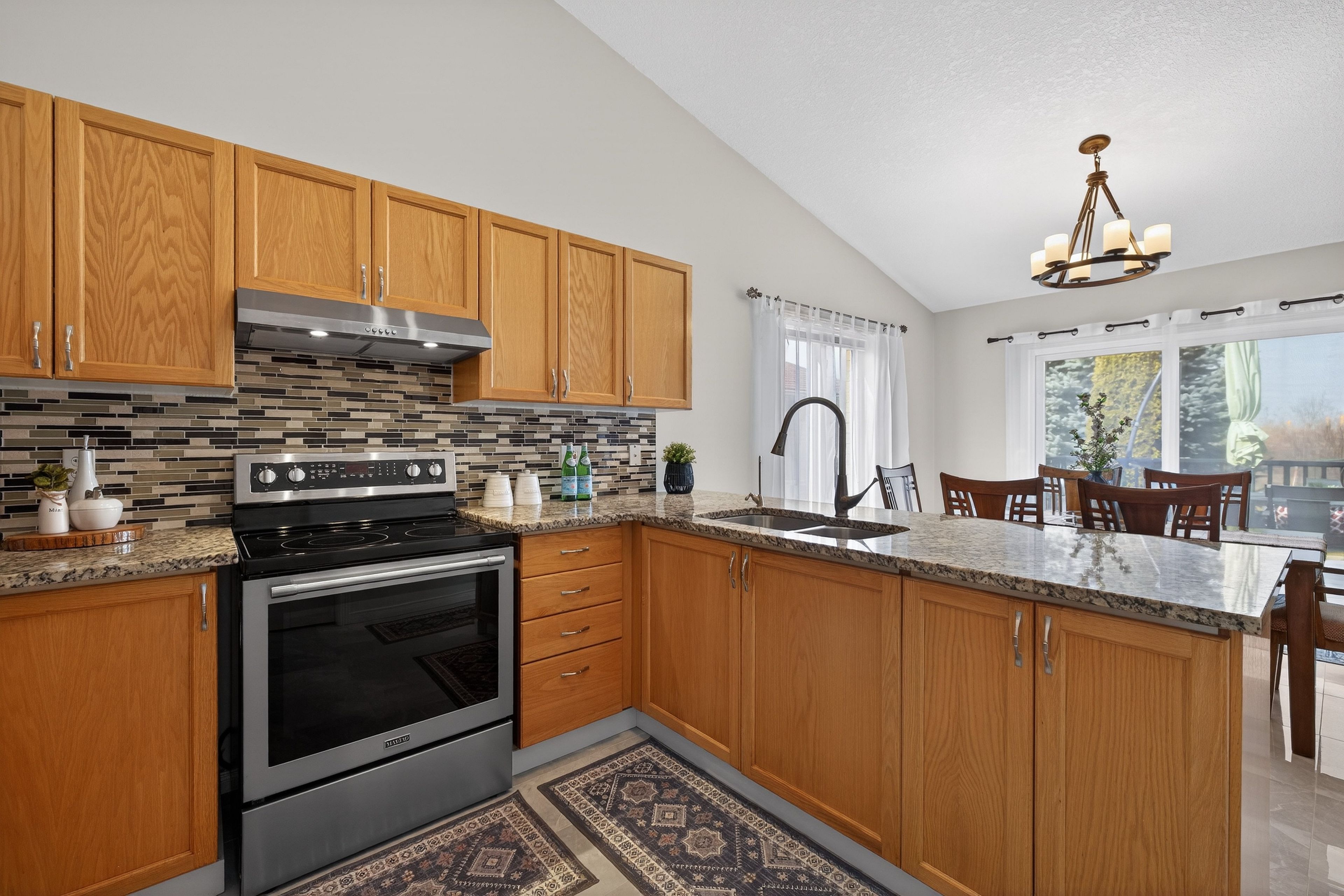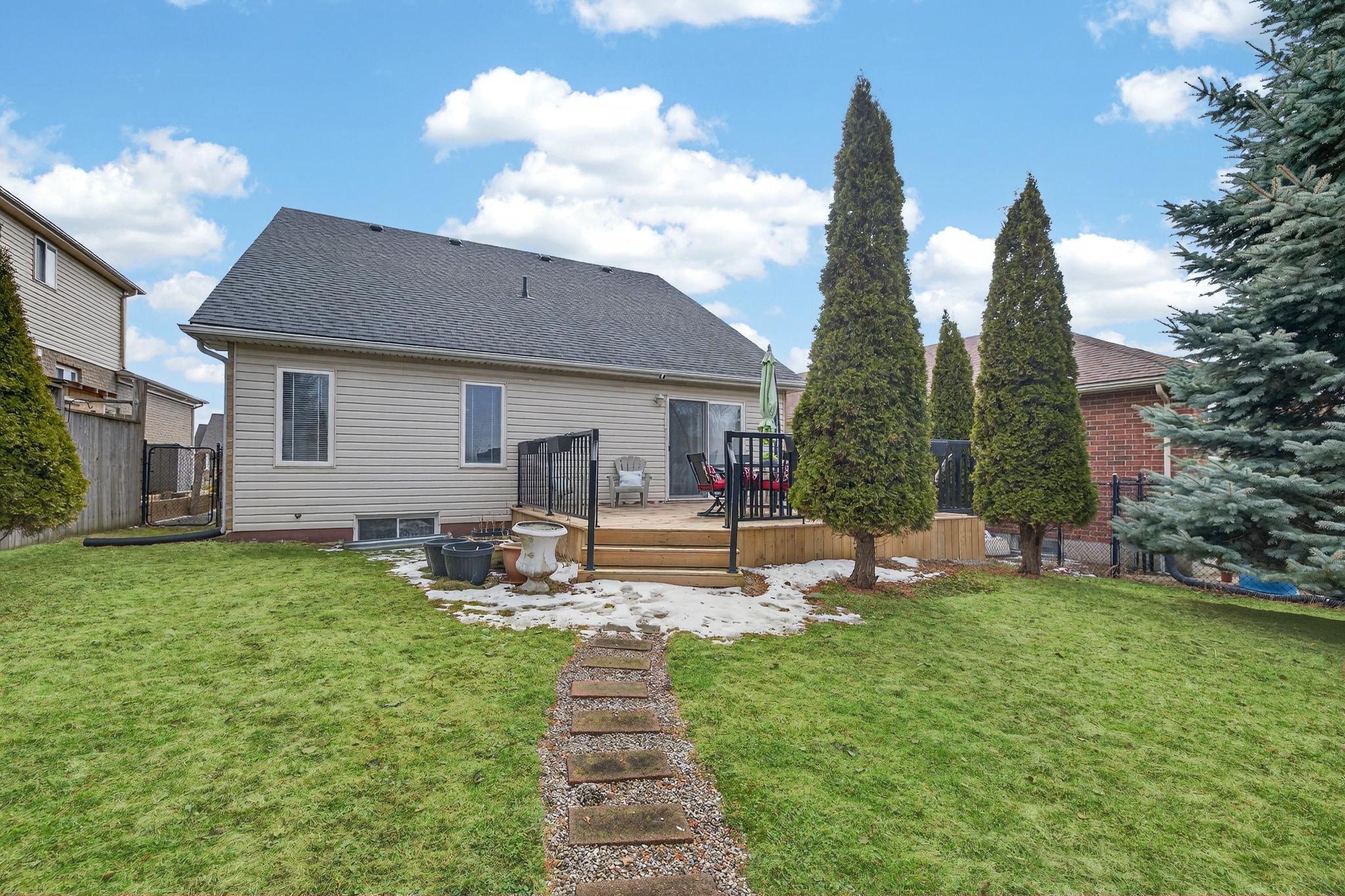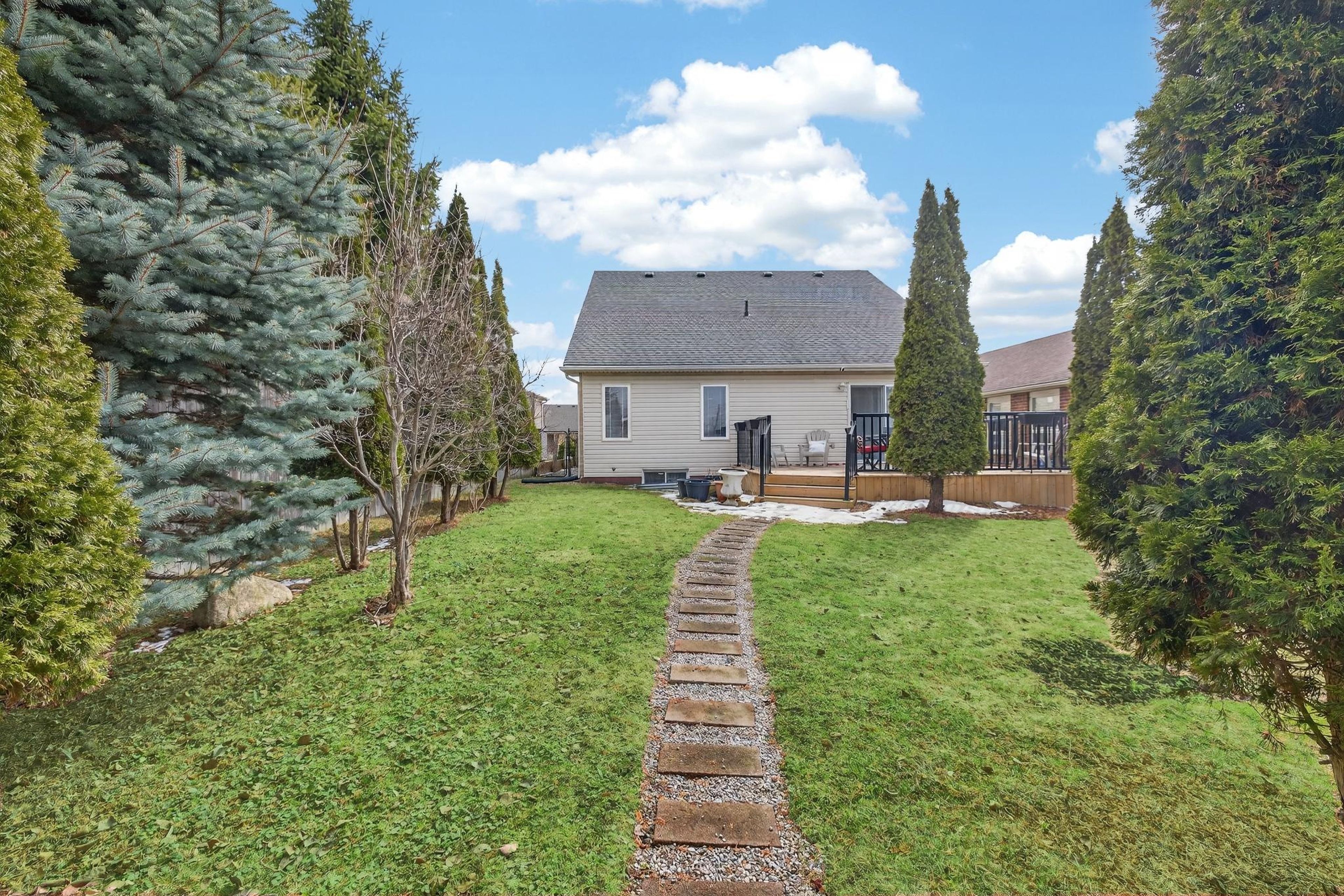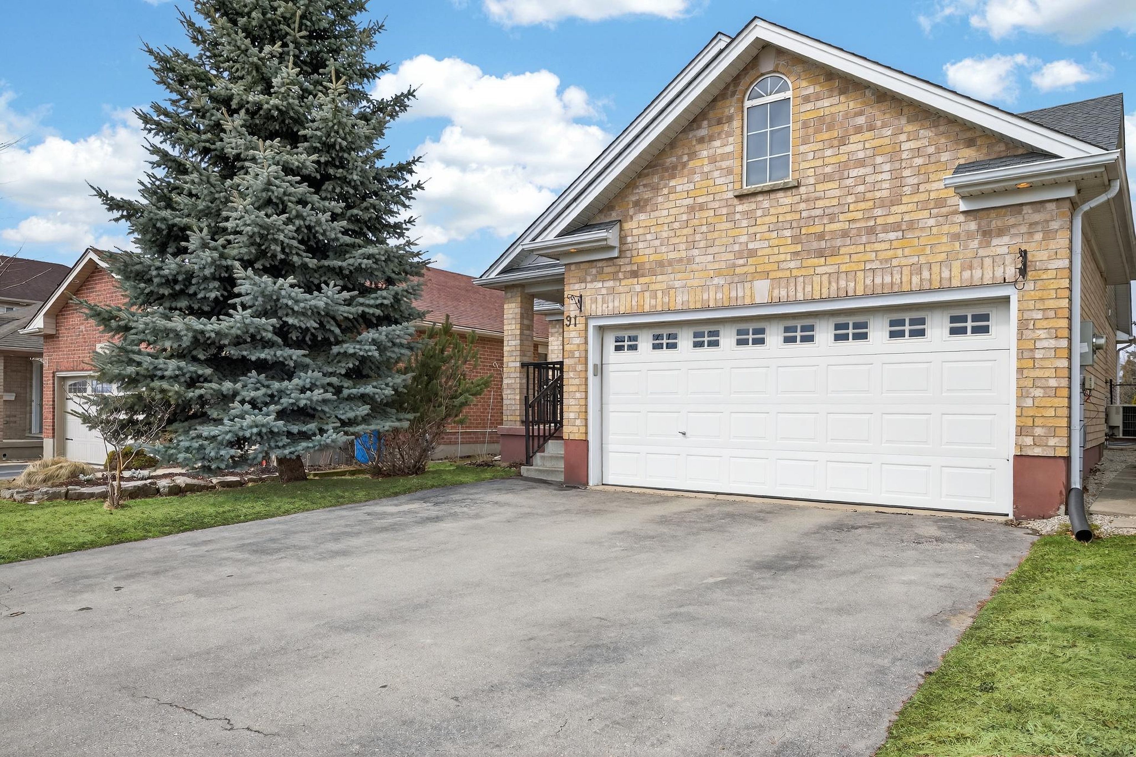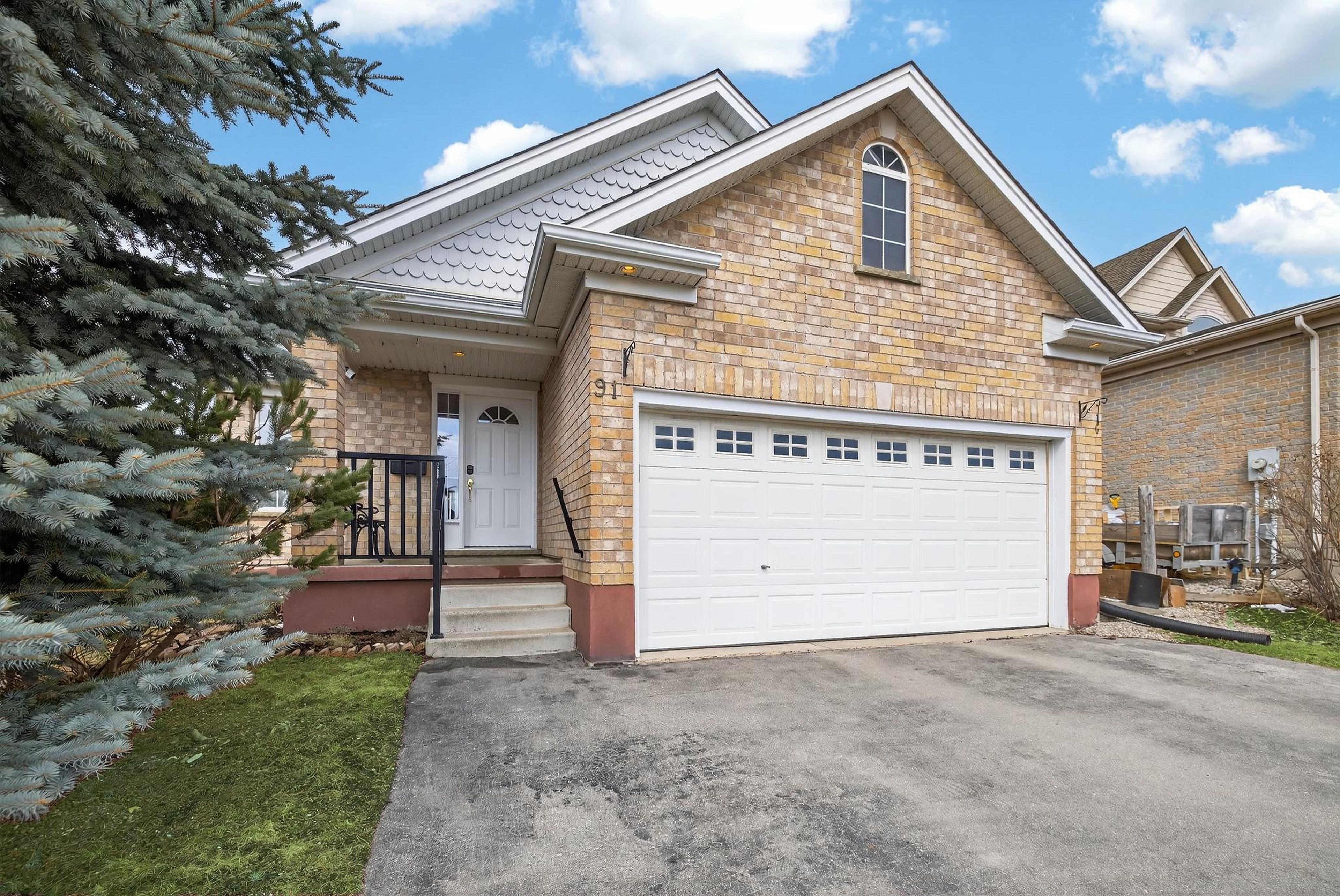 Welcome to 91 flaherty dr, an exceptional bungalow on a rare, oversized lot nearly 200 feet deep. This well-maintained home features a two-car garage and soaring cathedral ceilings that create an immediate sense of elegance and space. The main level offers three bright bedrooms and two bathrooms (one with a jacuzzi tub), anchored by an inviting living room filled with natural light. The recently updated kitchen is a highlight, featuring a charming dining area and sliding doors that lead directly to a new 12'x14' deck-perfect for outdoor entertaining and summer bbqs. Kitchen updates include: granite counters with a breakfast bar, stylish backsplash new range hood, stainless steel appliances and modern tiles throughout. The fully finished basement nearly doubles your living space, offering a massive recreation room, a fourth bedroom, and a 4-piece bathroom complete with a corner jacuzzi tub and a separate shower. Additional conveniences include ample storage and a dedicated cold cellar. The main floor is spacious, bright and freshly painted. The shingles were upgraded at the time the home was built. Situated on one of the largest lots in the city with no rear neighboors, this home is just steps away from the west end rec centre and major shopping amenities (costco, zehrs, banks, lcbo...).